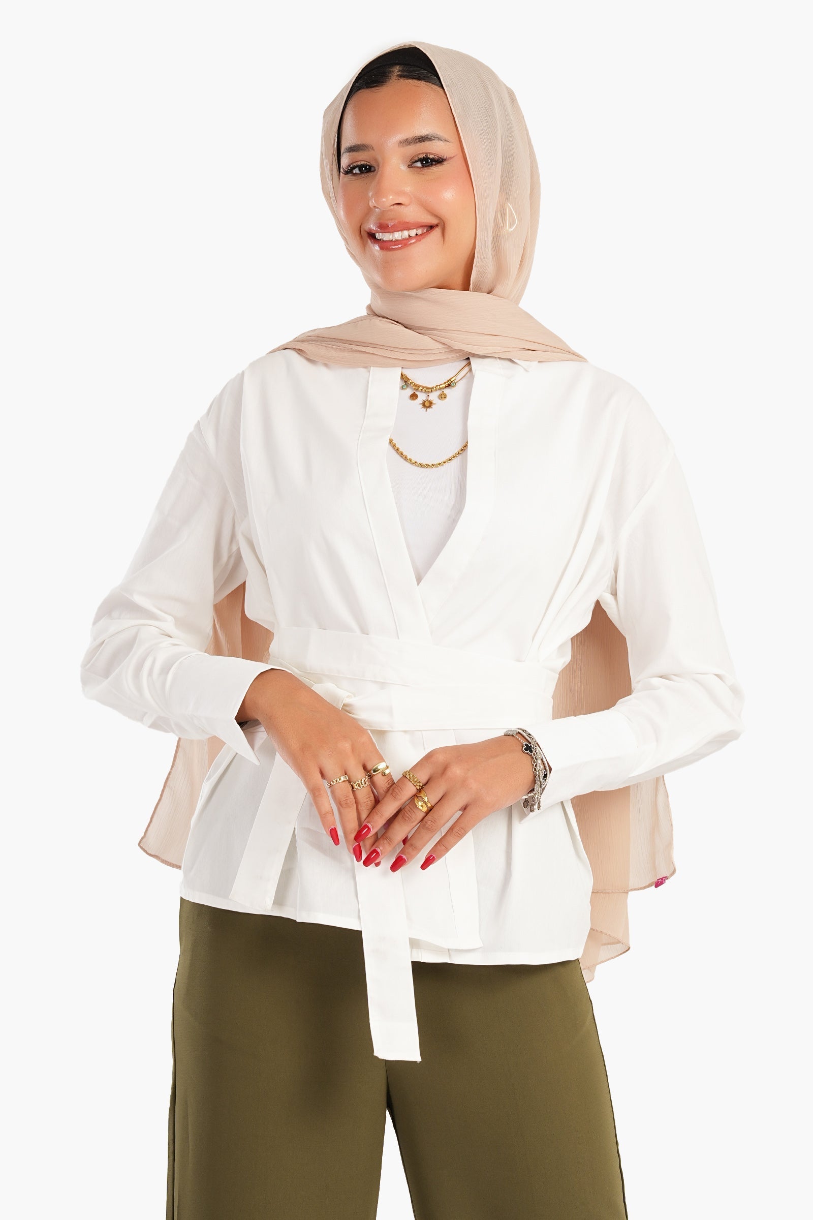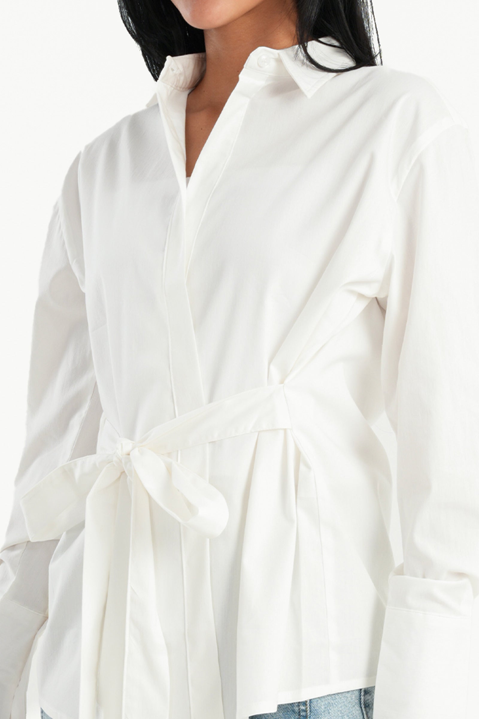This cotton blend shirt effortlessly blends classic style with modern elegance. Designed with a regular fit and a solid pattern, it offers a timeless look that? both versatile and chic. The collared neck and button closure with a hidden placket provide a sleek and polished appearance, while the long sleeves add to its sophisticated design. The included waist belt cinches the waist, adding a flattering silhouette to your outfit. Easy to wear and style, this shirt is perfect for both casual and more formal settings.