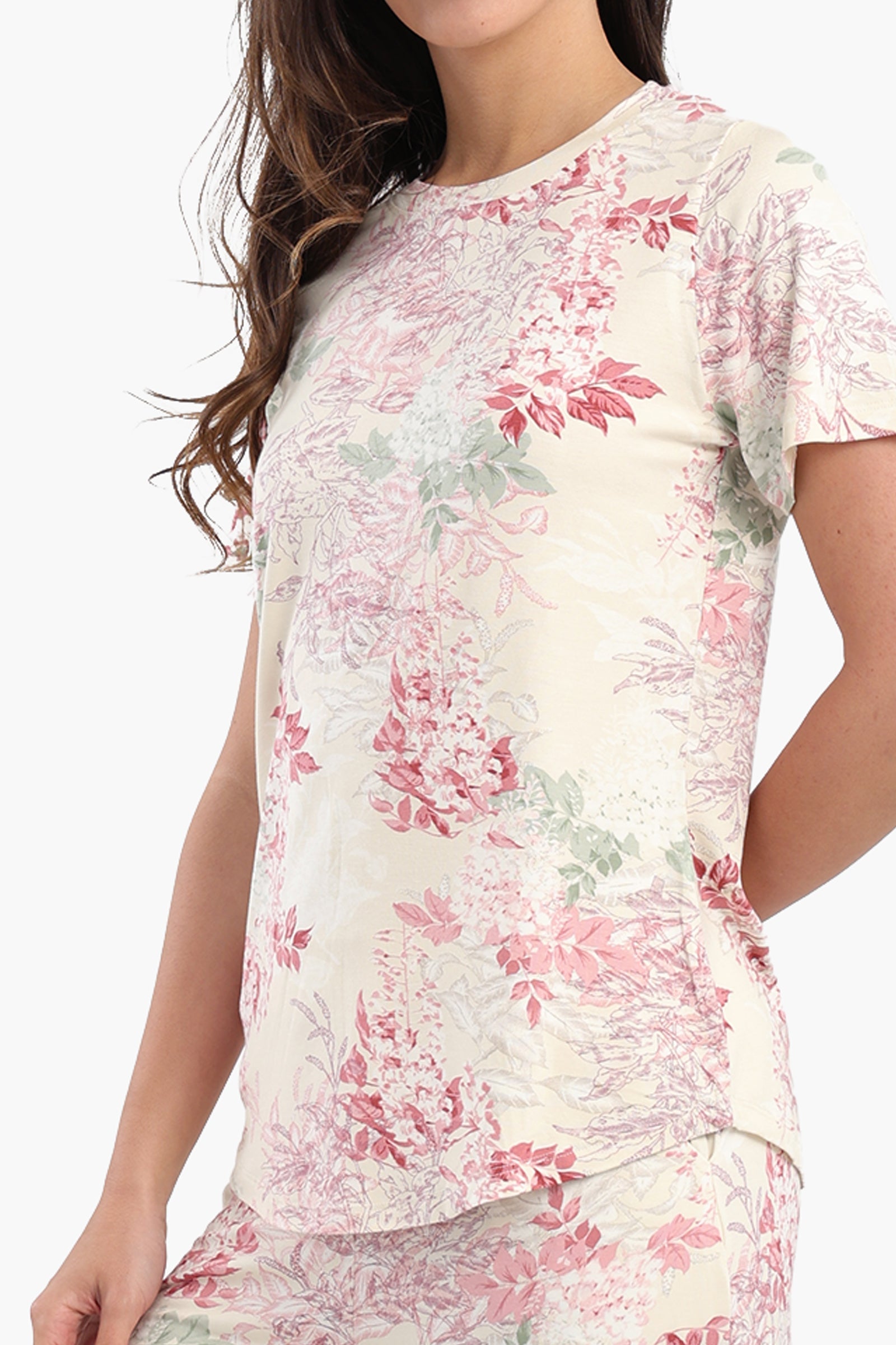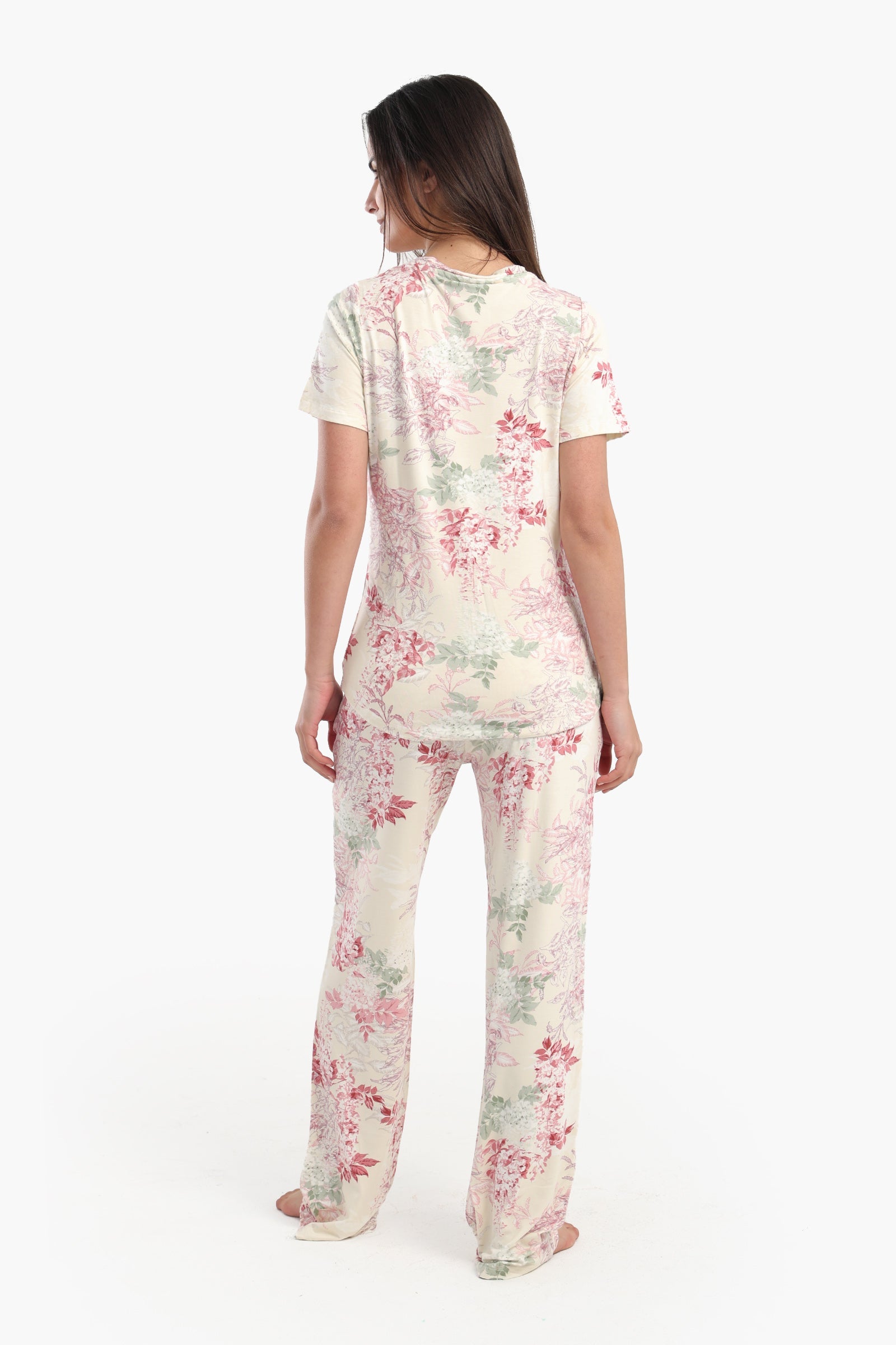استمتع بالراحة والأناقة مع طقم بيجاما بطبعة زهور كاملة، مصنوع من مزيج فيسكوز ناعم وجيد التهوية. يتميز الطقم بقصّة عادية، مما يمنحكِ مظهرًا مريحًا وجذابًا، مثاليًا للاسترخاء بعد يوم طويل. يتميز الجزء العلوي بياقة دائرية وأكمام قصيرة، مصمم ليمنحكِ شعورًا بالانتعاش والراحة.