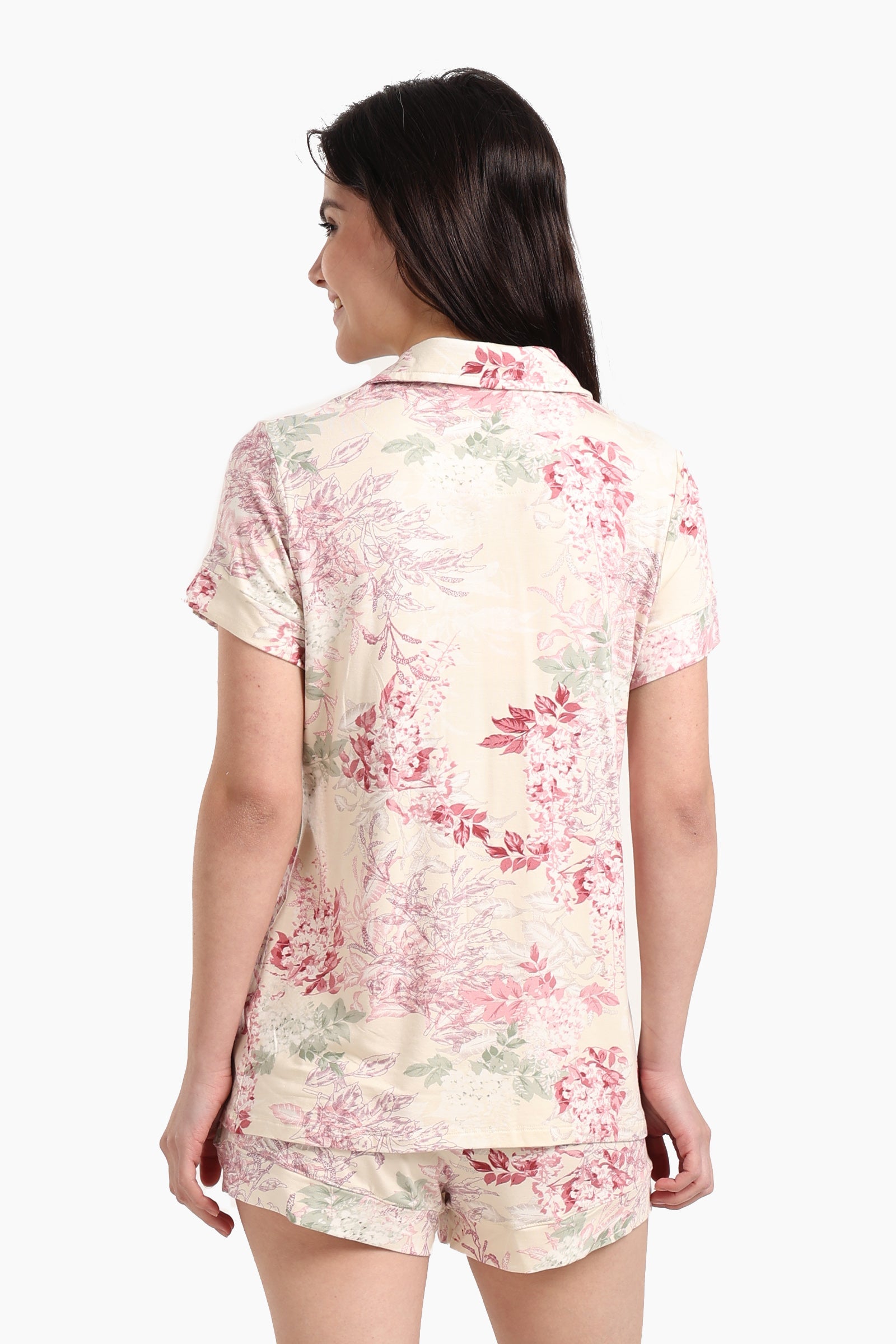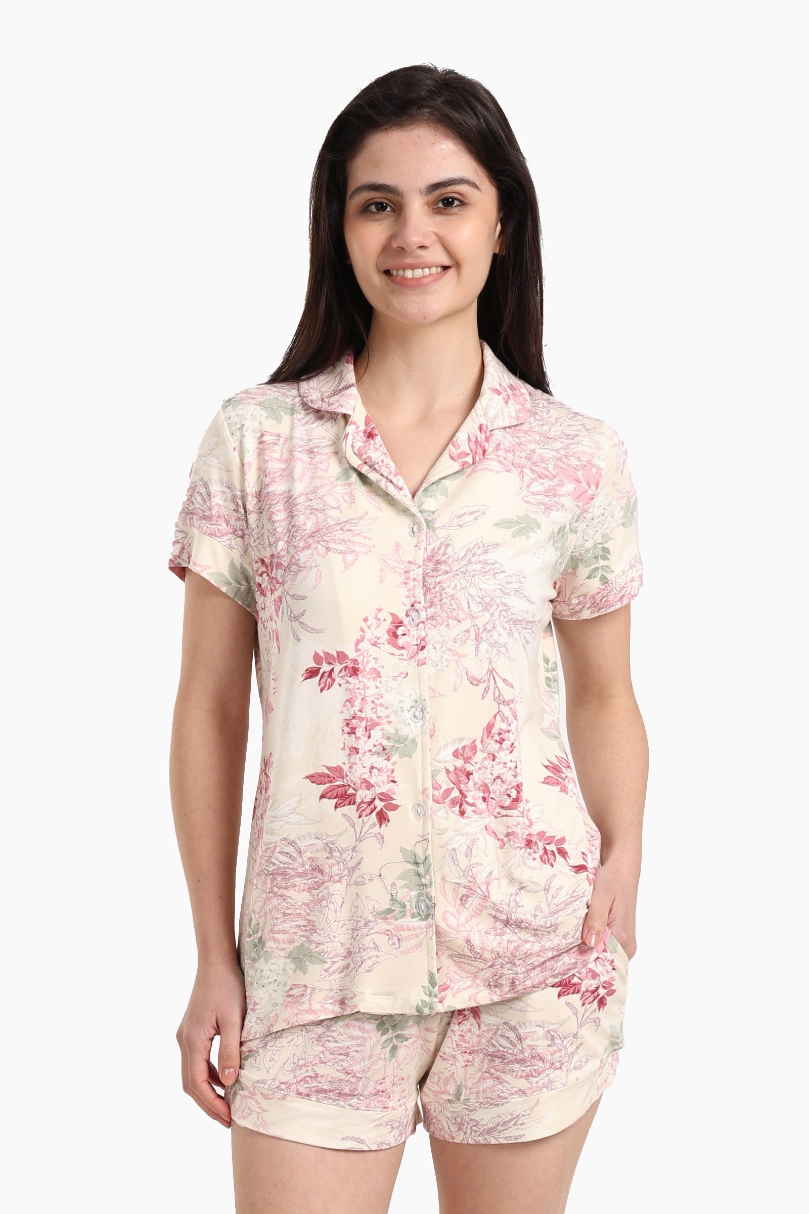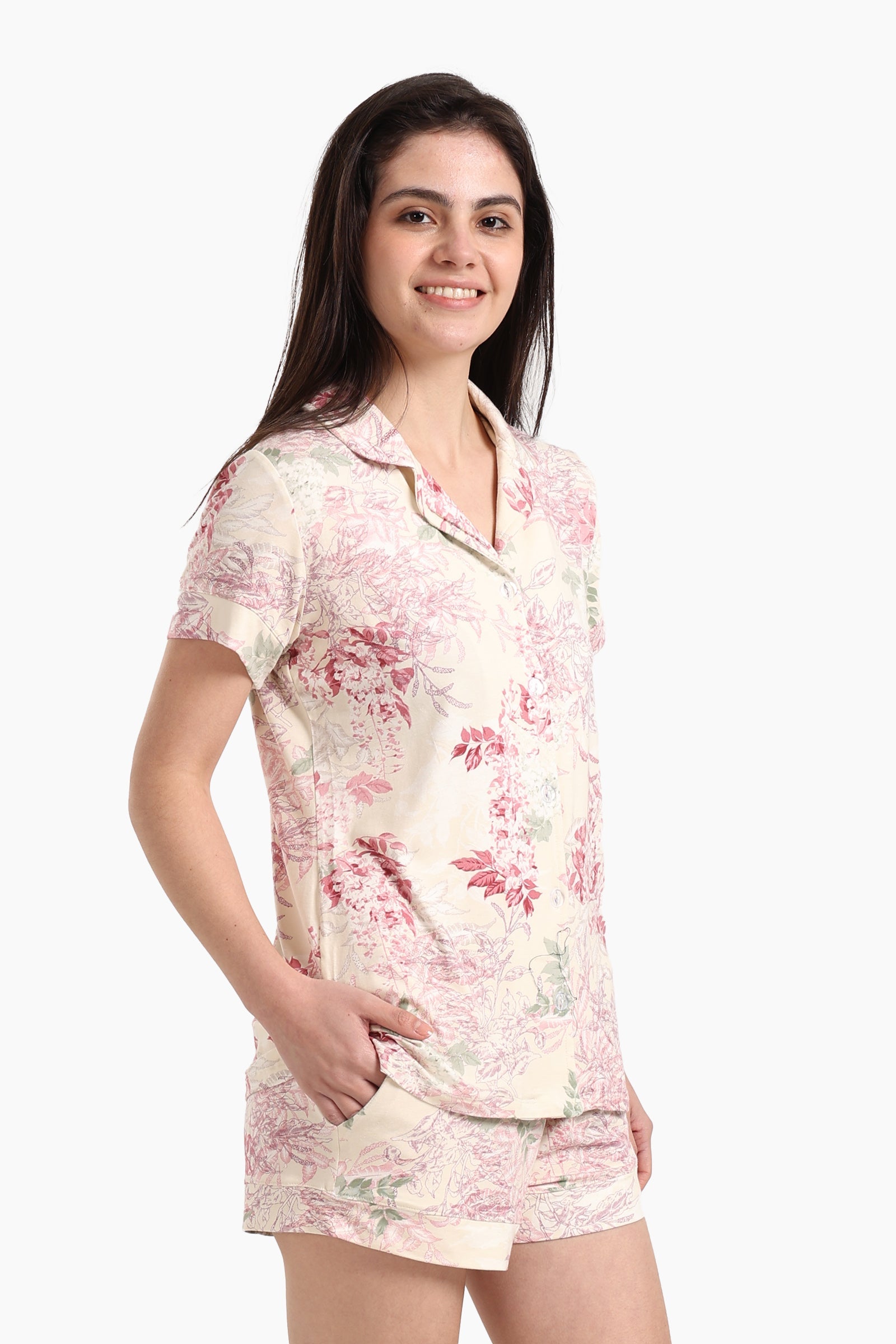 يتميز هذا القميص بياقة مدببة وأزرار للإغلاق مع فتحة كاملة، مما يمنحه مظهرًا أنيقًا، ويكمله أكمام قصيرة لمزيد من الراحة. يوفر الشورت ذو الخصر المرن مرونة، وتضفي الجيوب الجانبية لمسة عملية، مما يجعل هذا الطقم عمليًا وأنيقًا في آن واحد.
