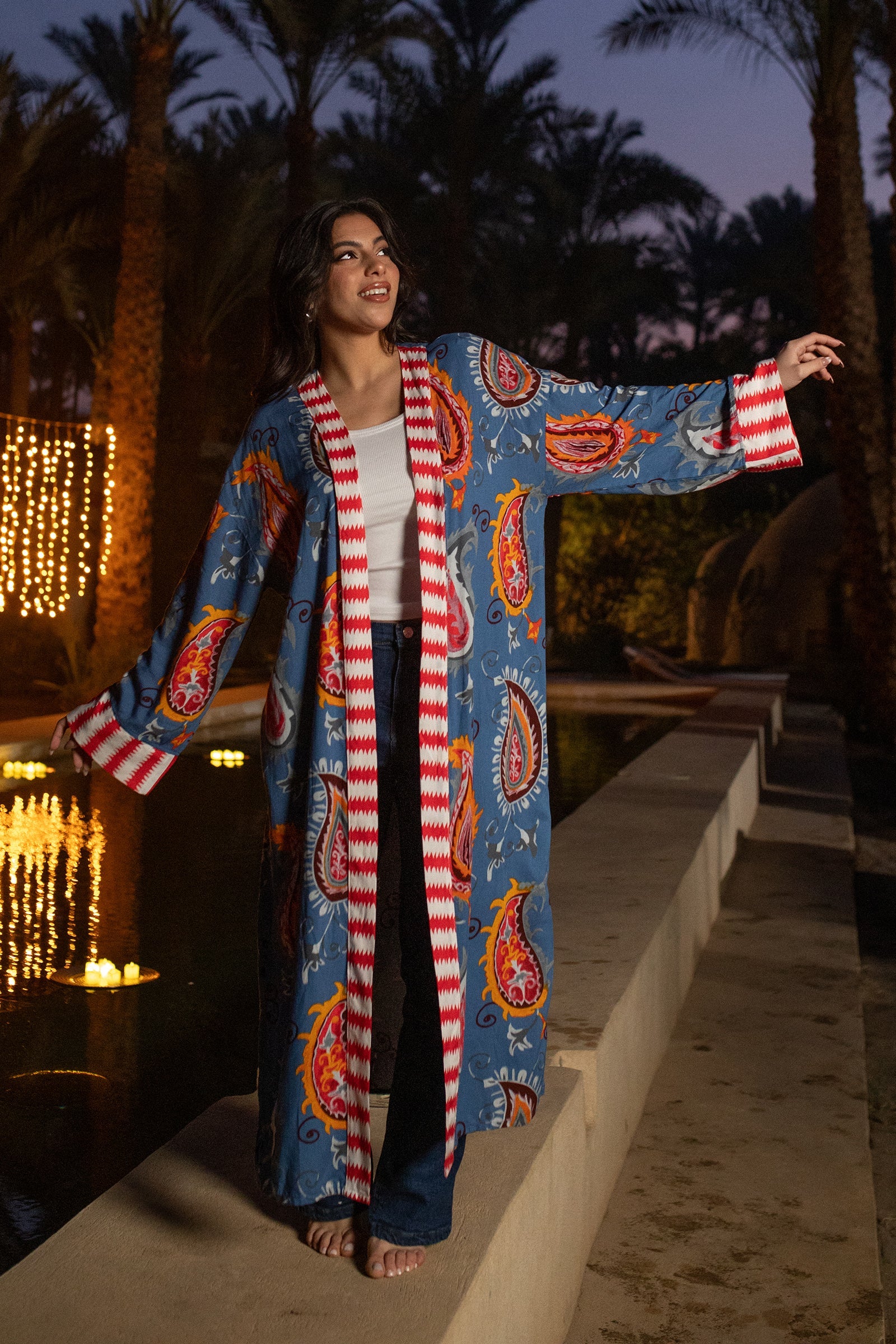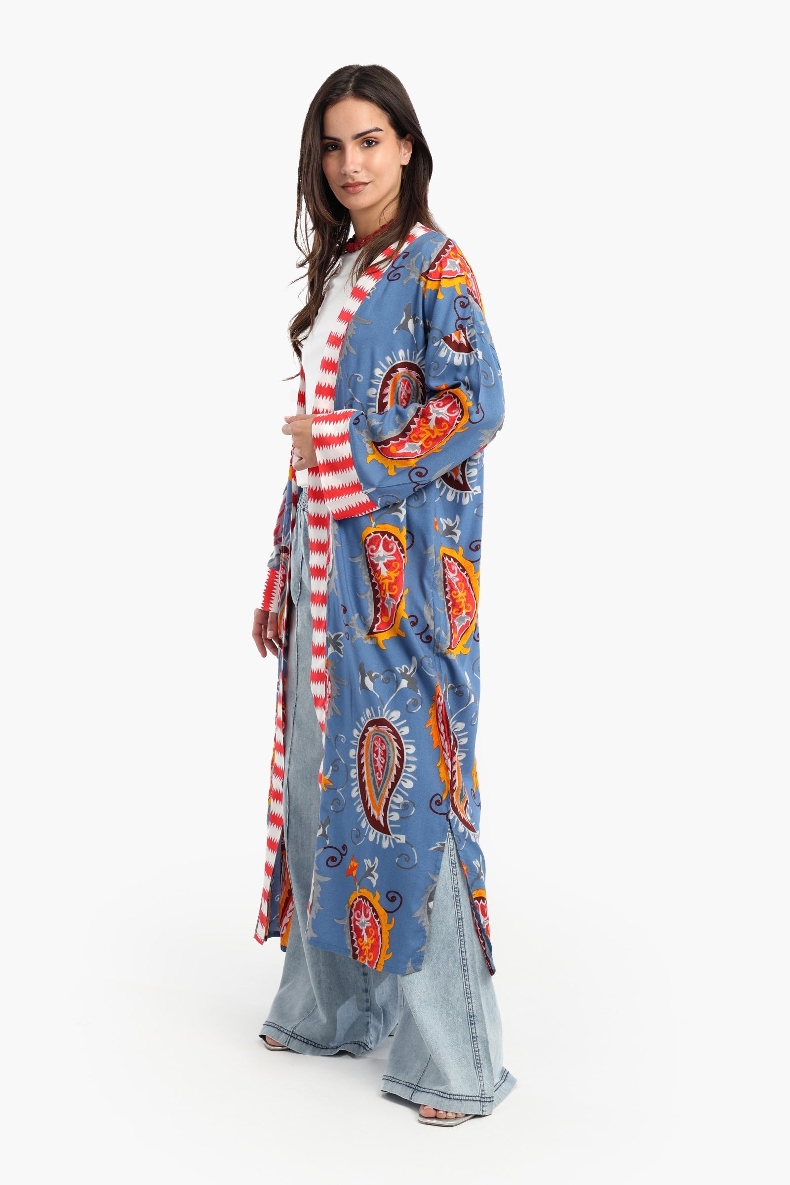 يتميز هذا الكيمونو بفتحة رقبة مفتوحة وأكمام طويلة، مما يمنحه مظهرًا أنيقًا وخفيفًا. طوله المتوسط يُضفي عليه لمسةً من الانسيابية، بينما تتيح الشقوق الجانبية سهولة الحركة ولمسةً من الرقي. تصميمه سهل الارتداء يجعله قطعةً مثاليةً لأي مناسبة.