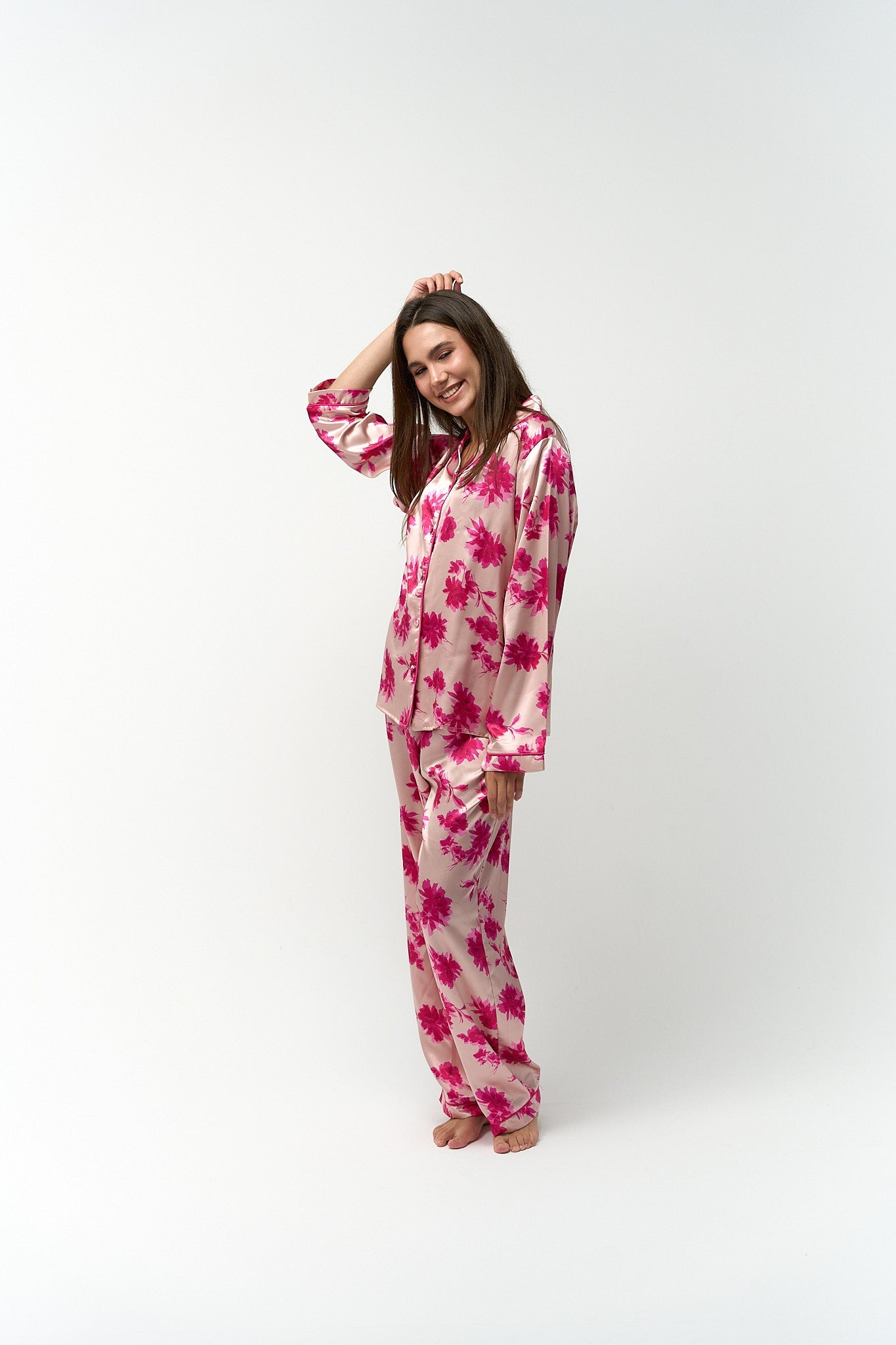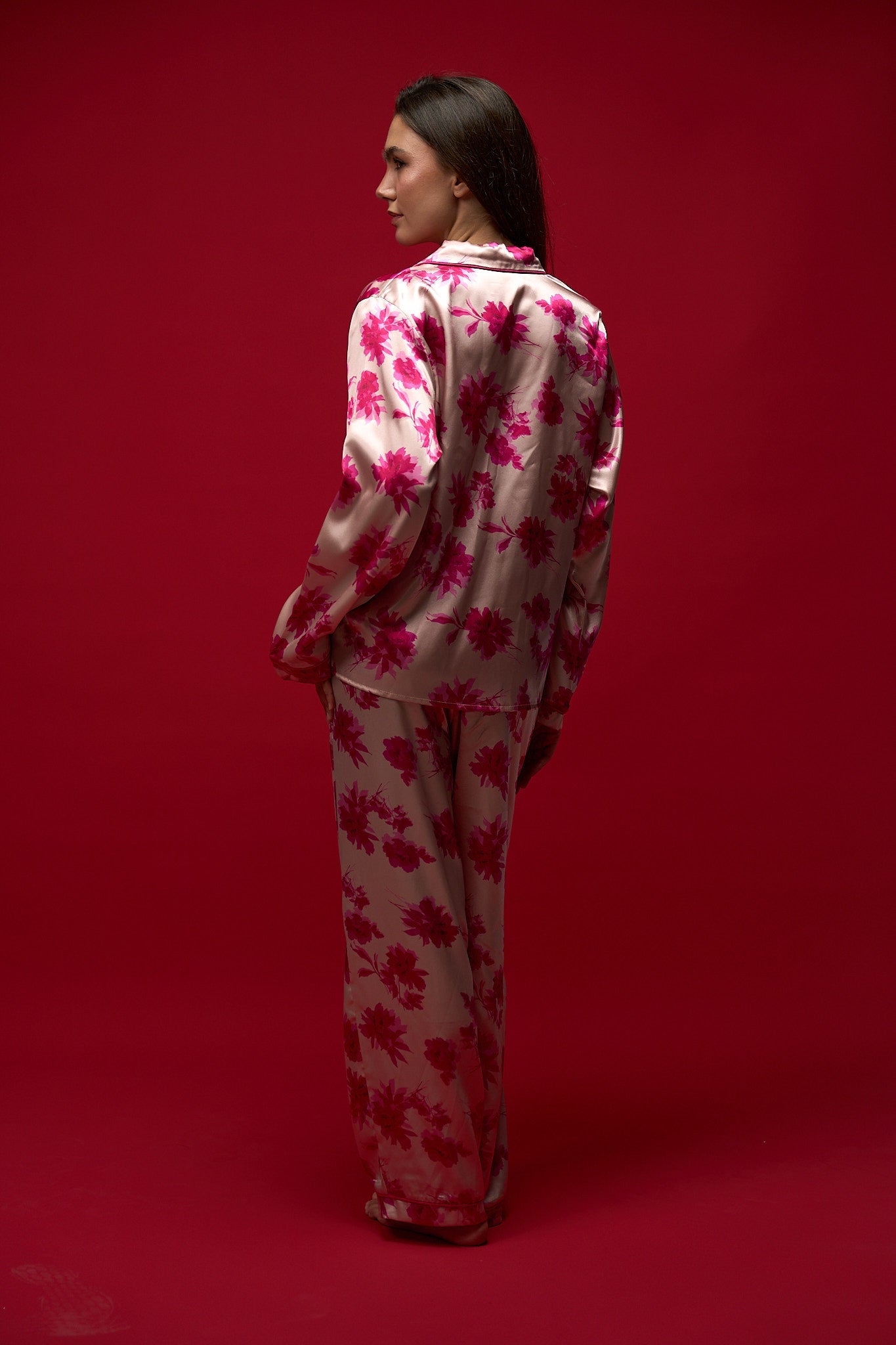 استمتعي بمزيج مثالي من الراحة والأناقة مع طقم بيجاما الساتان المزين بنقشة الزهور. مصنوع من الساتان الناعم، يمنحكِ هذا الطقم شعورًا فاخرًا على بشرتكِ، مثاليًا للاسترخاء والنوم. يضفي النمط الزهري المطبوع لمسة أنثوية، بينما يمنح الياقة الكلاسيكية المدببة والإغلاق بالأزرار مظهرًا أنيقًا. بأكمام طويلة وخصر مرن عالي وقصة مستقيمة، يوفر هذا الطقم الطويل كل الراحة التي تحتاجينها لنوم هانئ.