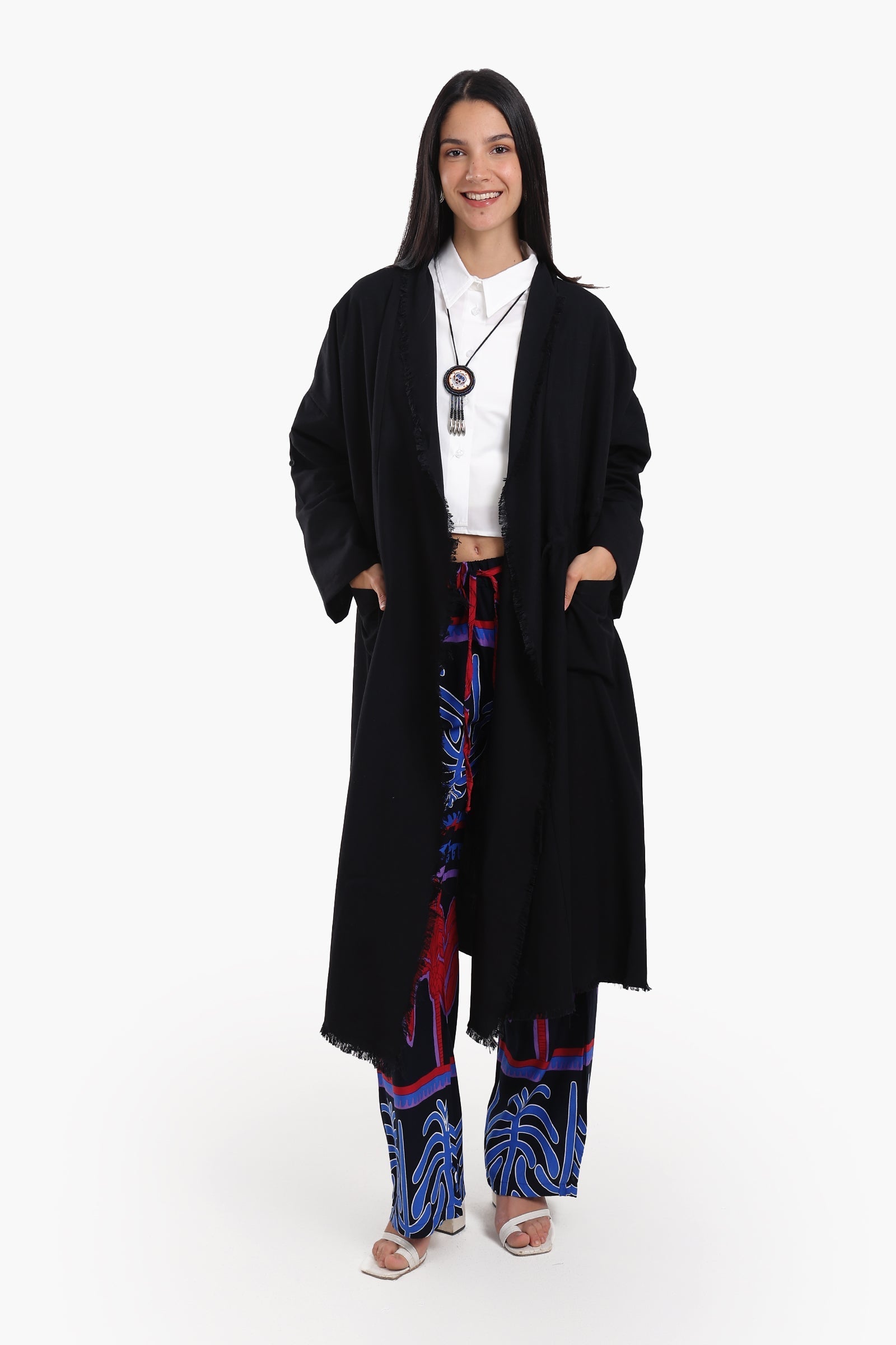 دلل نفسكِ بأناقة مريحة مع هذا الكيمونو البوليستر المتدفق. مصنوع من قماش بوليستر خفيف الوزن، يوفر هذا الكيمونو انسيابية مريحة ولمسة ناعمة. تصميمه المفتوح من الأمام وأكمامه الطويلة والواسعة يُضفي عليه مظهرًا مريحًا وخفيفًا. قصته التي قد تصل إلى الركبة أو أطول قليلاً توفر تغطية واسعة مع الحفاظ على ملمس منعش. تفاصيل مثل الجيوب المرقعة والحاشية الرقيقة ذات الحواف غير المزخرفة تُضفي لمسة من الأناقة العملية والجاذبية. هذا الكيمونو هو القطعة المثالية لإضافة لمسة من الأناقة البوهيمية أو الراحة إلى أي إطلالة.