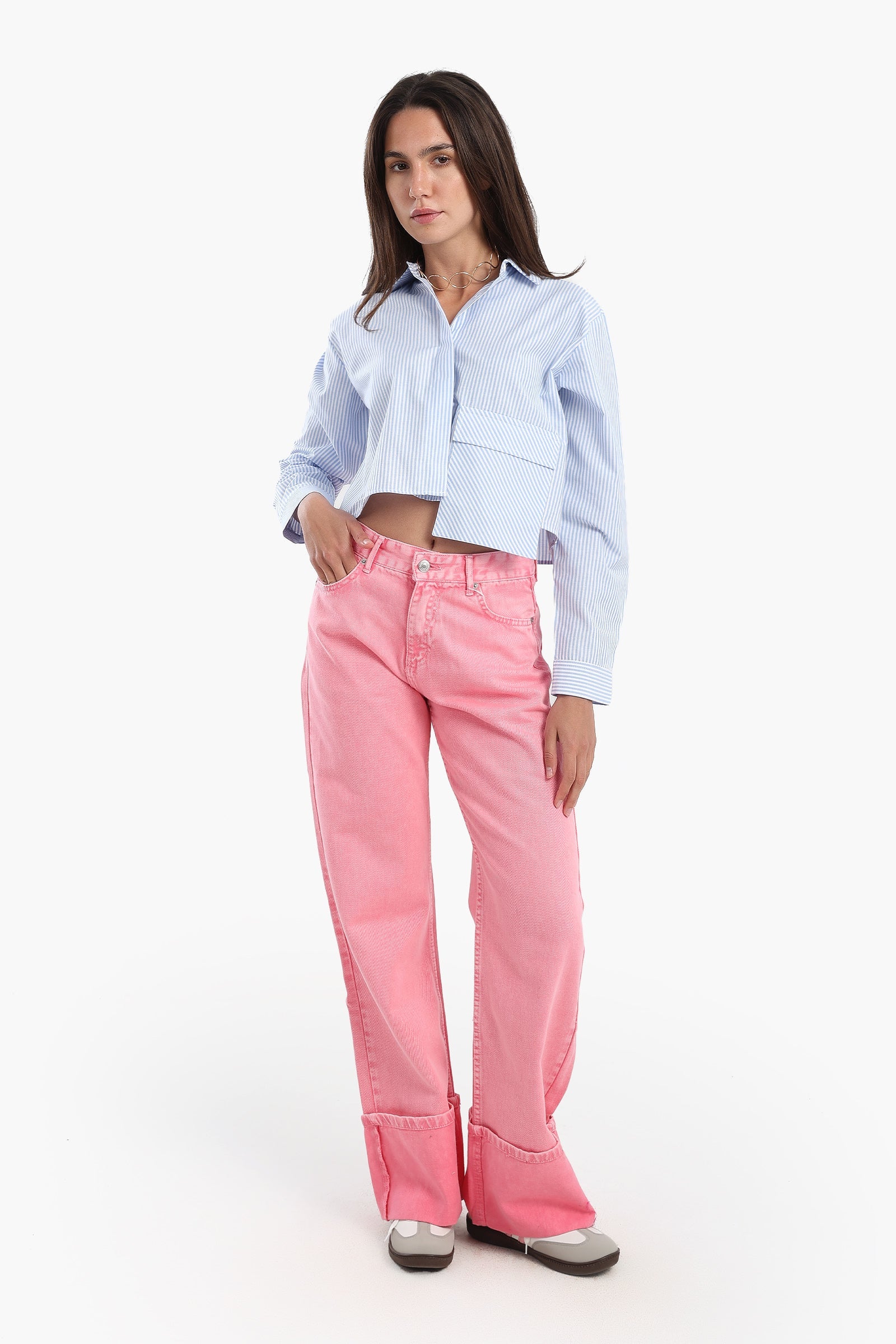 أضف لمسةً مرحةً وأنيقةً إلى خزانة ملابسك مع هذا الجينز الوردي ، المصمم ليمنحك الراحة والأناقة. مصنوع من قطن عالي الجودة، يتميز هذا الجينز بقصّة عادية ولون ورديّ سادة يضفي لمسةً منعشةً على إطلالتك. تصميم الخصر العالي وقصّة الساق الواسعة يمنحانكِ مظهرًا أنيقًا، بينما يضمن الإغلاق بالأزرار والسحاب ملاءمةً محكمة. يأتي هذا الجينز الطويل مع جيوب أمامية وخلفية عملية، ويتميز بحاشية مطوية عصرية، مما يجعله خيارًا متعدد الاستخدامات للارتداء اليومي.