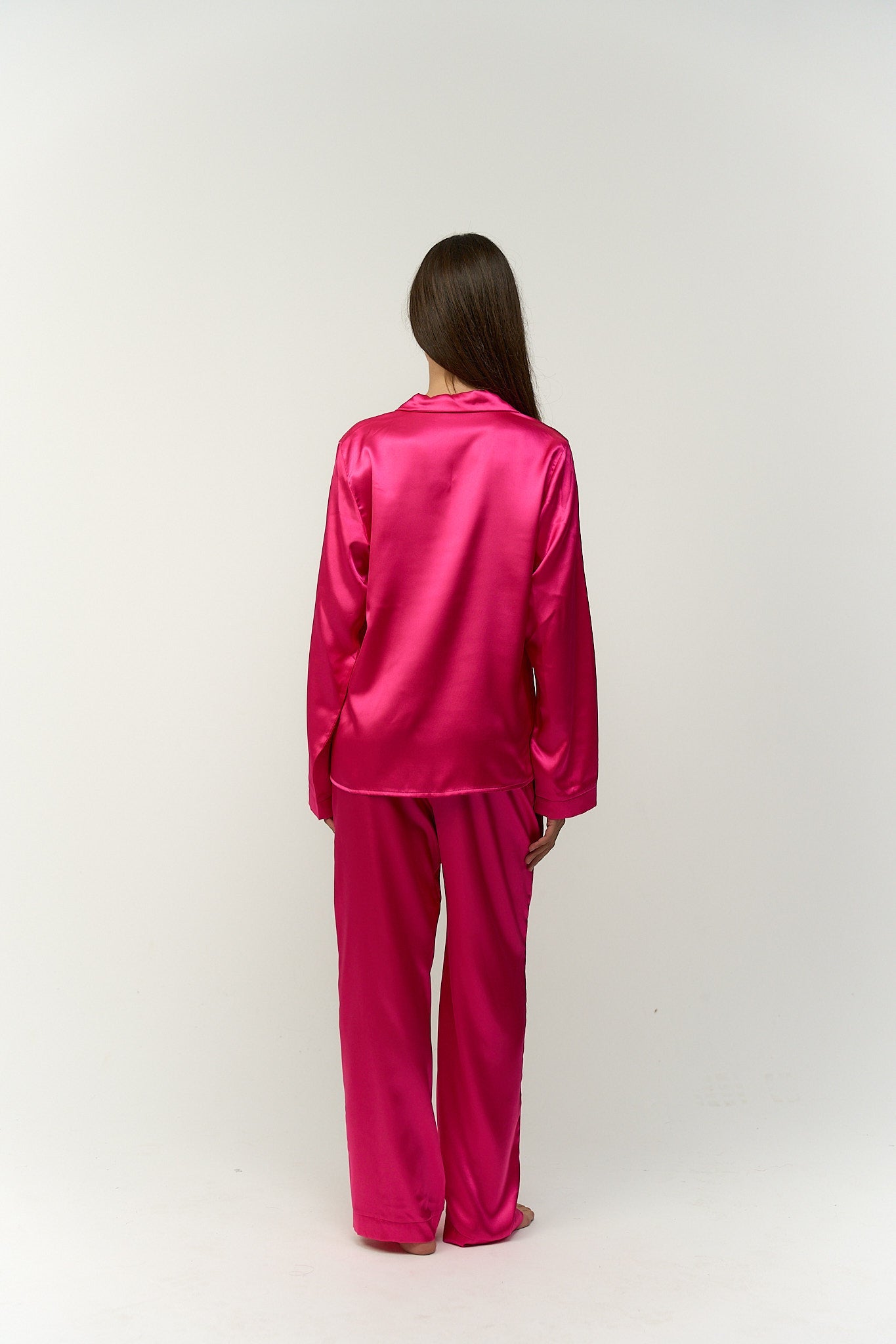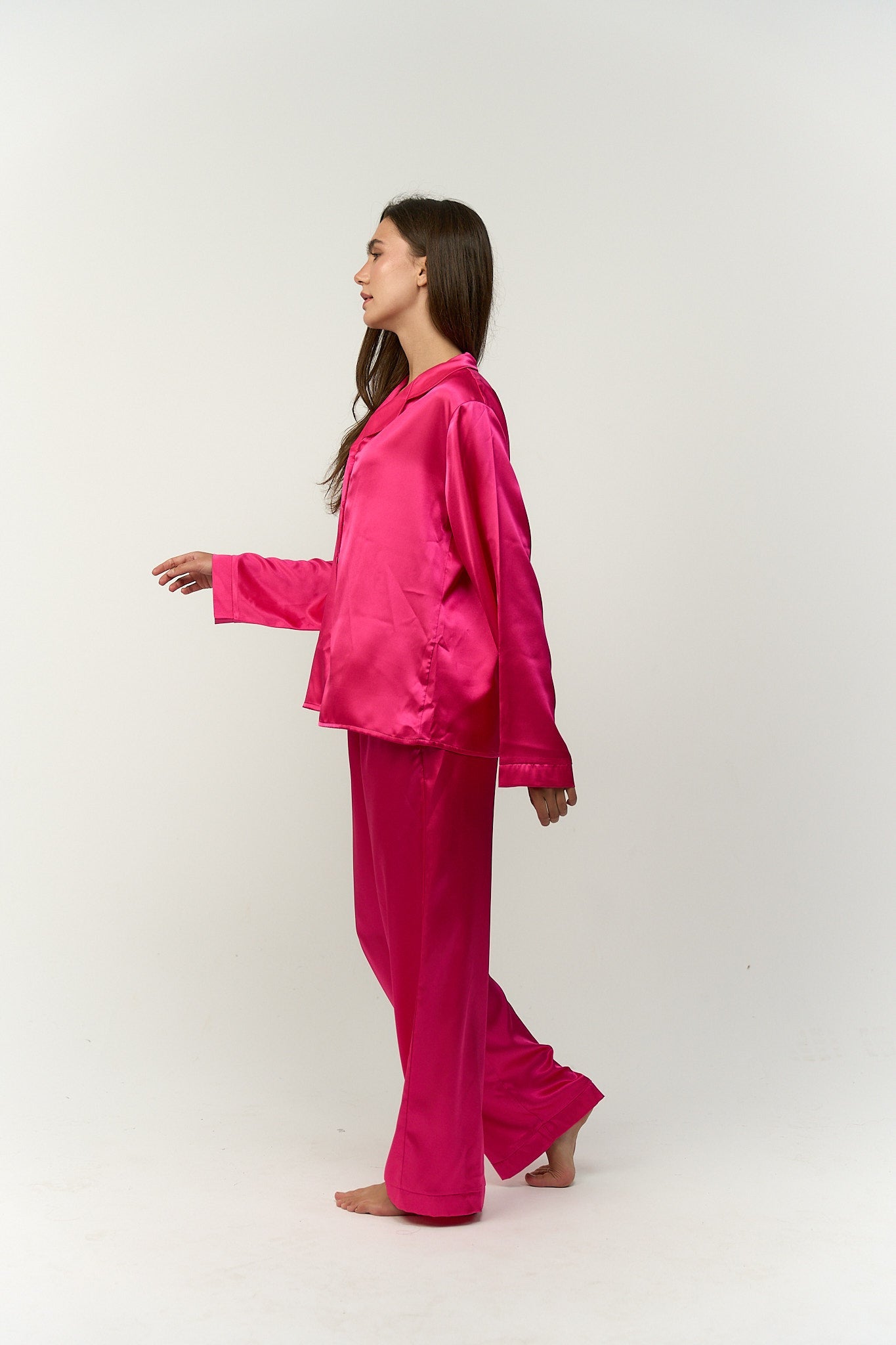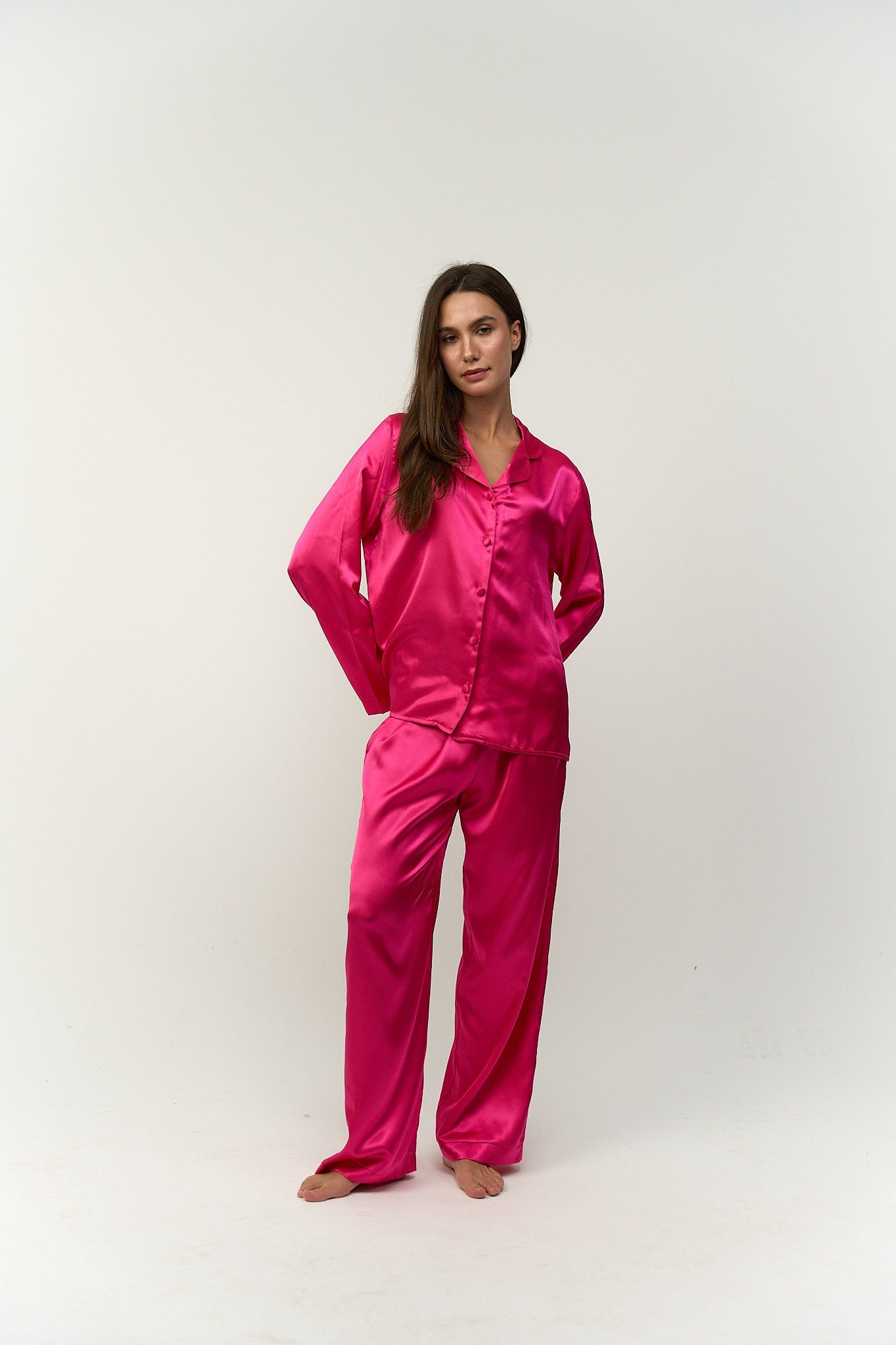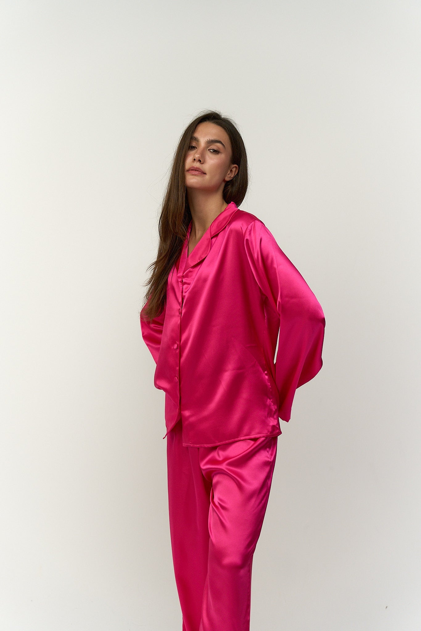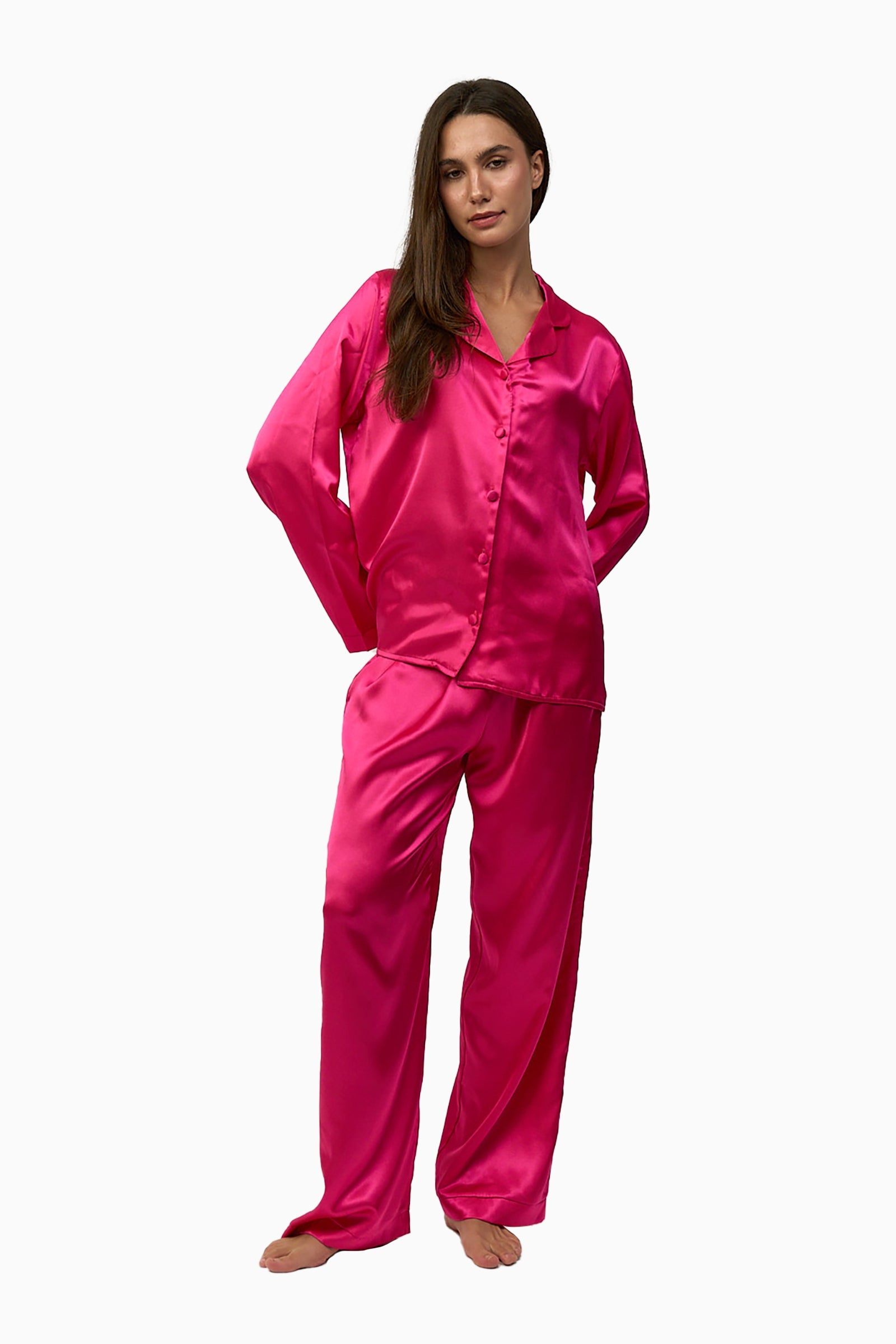 استمتعي بأقصى درجات الاسترخاء مع طقم بيجاما الفوشيا الساتان. مصنوع من قماش ساتان ناعم، يمنحكِ هذا الطقم شعورًا فاخرًا وغنيًا على بشرتكِ. يتميز بقصّة عادية ونقشة سادة وخصر مرن عالي، ليمنحكِ الراحة والأناقة. ياقة كلاسيكية بفتحة وأزرار للإغلاق تُضفي مظهرًا أنيقًا، بينما تُبقيكِ الأكمام الطويلة والتصميم الطويل دافئتين طوال الليل.