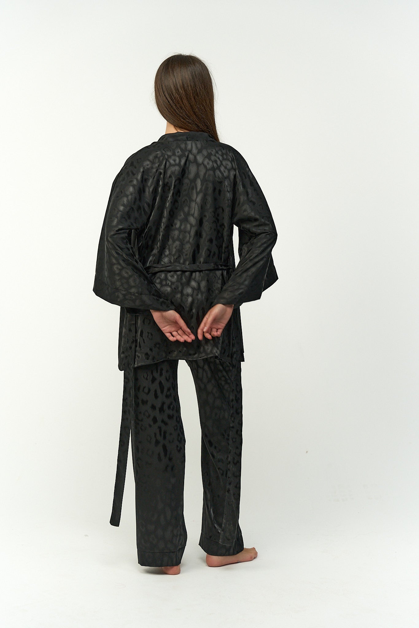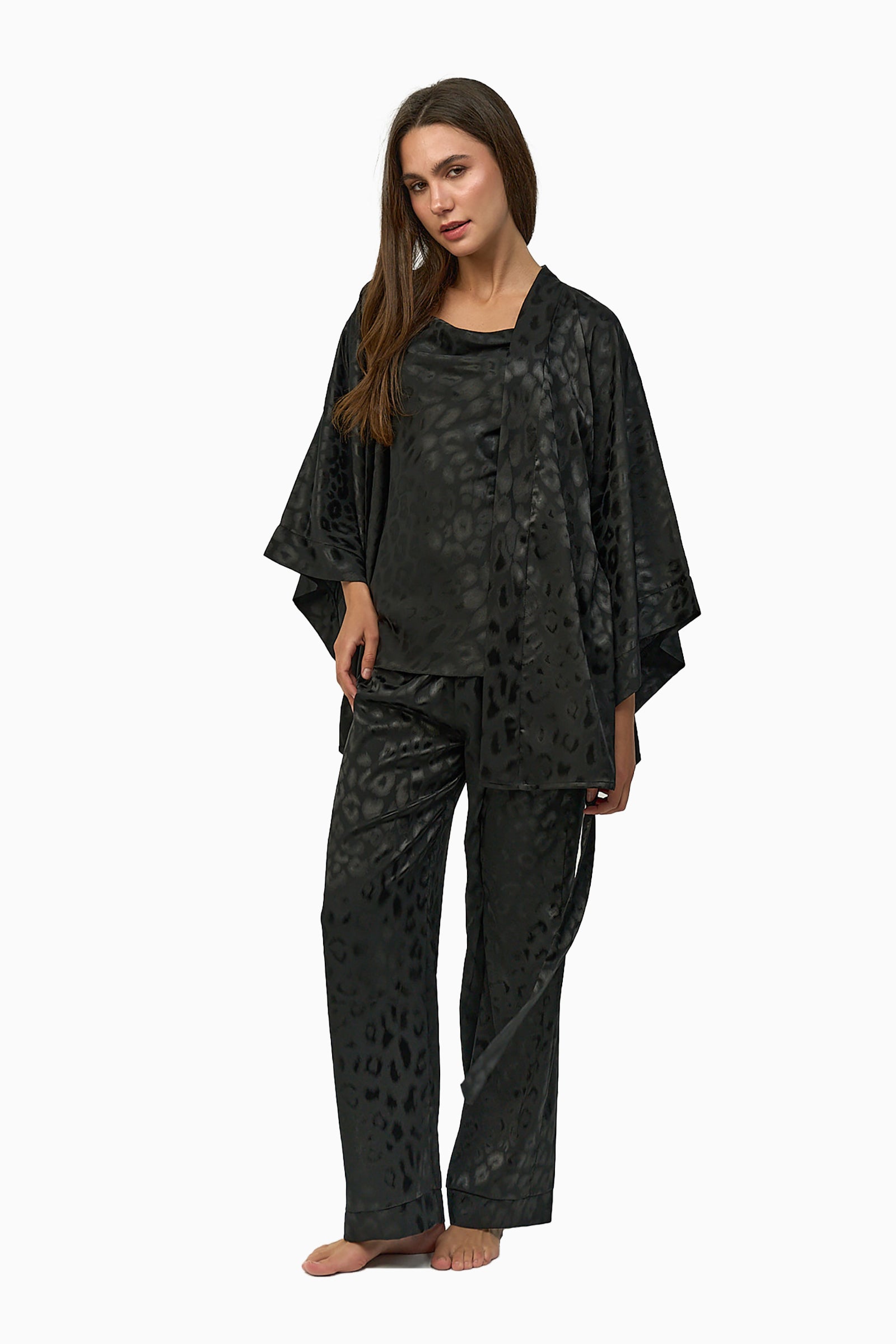 طقم بيجاما أسود من ثلاث قطع بنقشة الجاكار، مصنوع من قماش الساتان، يمنحكِ تجربة نوم مريحة ومريحة. صُمم هذا الطقم متعدد الاستخدامات بقصّة عادية ونقشة الجاكار، ويتضمن بلوزة منسدلة، وبنطالًا بخصر عالٍ، ورداءً مطابقًا، مثاليًا للارتداء فوق ملابس أخرى أو بشكل منفصل. يُضفي القميص بدون أكمام مع حمالات قابلة للتعديل لمسة أنيقة، بينما يضمن البنطال ذو القصّة المستقيمة وخصر مرن عالي الراحة طوال الليل. يتميز الرداء بفتحة رقبة مفتوحة، وأكمام ثلاثة أرباع، وحزام قابل للفصل، مما يضفي لمسة من الأناقة والتنوع.