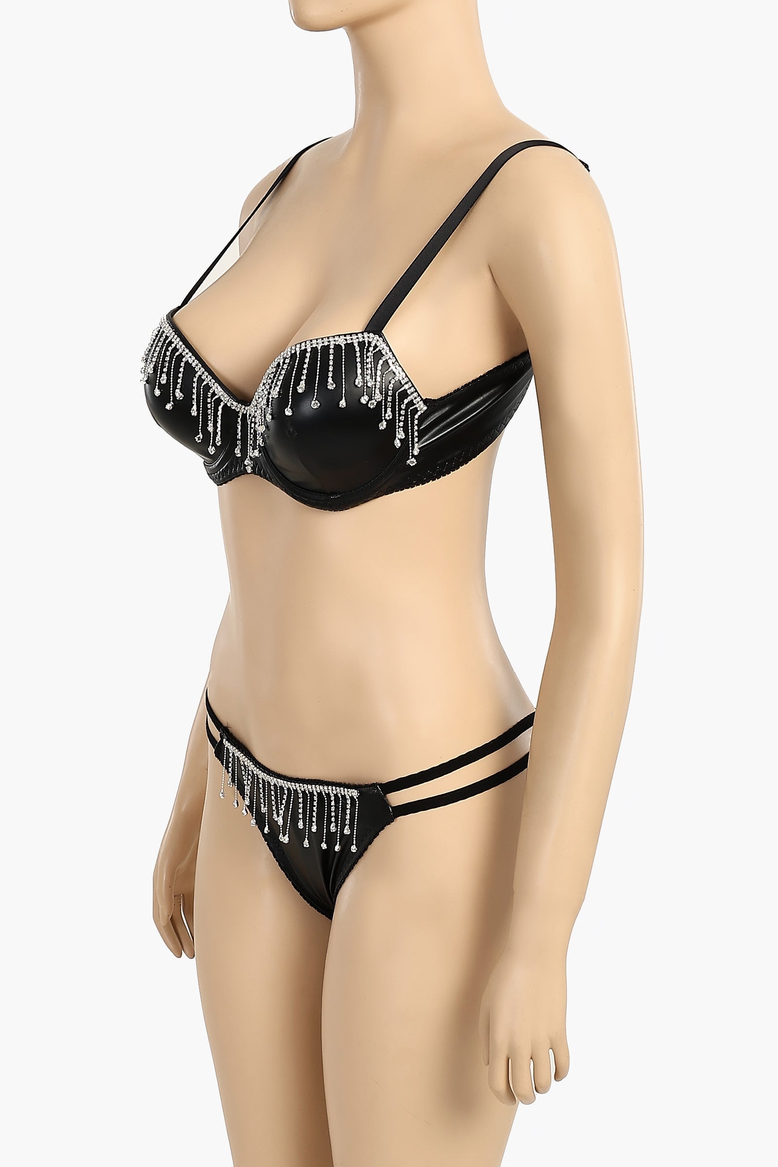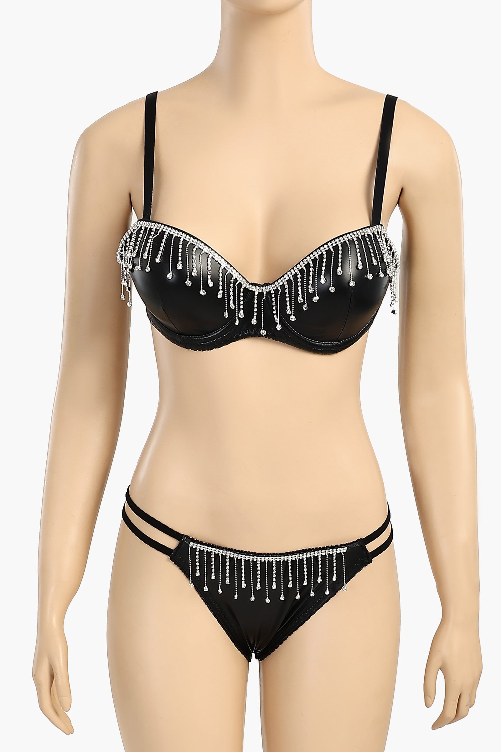 تألقي بإطلالة مميزة مع طقم حمالة الصدر والسروال الداخلي الجلدي المزين بأحجار الراين ، مزيج مثالي بين الأناقة العصرية والفخامة. مصنوع من جلد فاخر، يتميز هذا الطقم بحمالة صدر مزودة بسلك لدعم وبنية معززة، بينما يضفي سروال البكيني الداخلي بتصميم قفص لمسة من الأناقة. تضفي تفاصيل الأحجار الراينية لمسة من التألق، مما يضفي على الطقم لمسة من التألق. بفضل خصرها المرن وتصميمها سهل الارتداء، تضمن هذه الطقم الراحة والثقة، مما يجعلها مثالية لأي مناسبة خاصة.