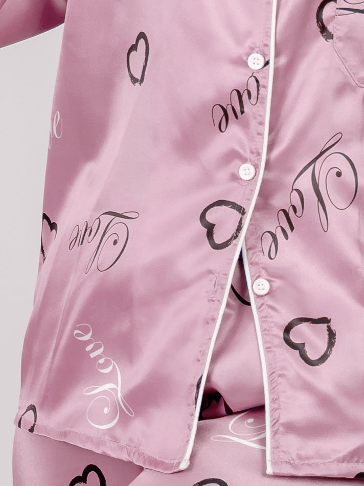 بيجامة ساتان مطبوعة بأكمام طويلة باللون الوردي الباهت