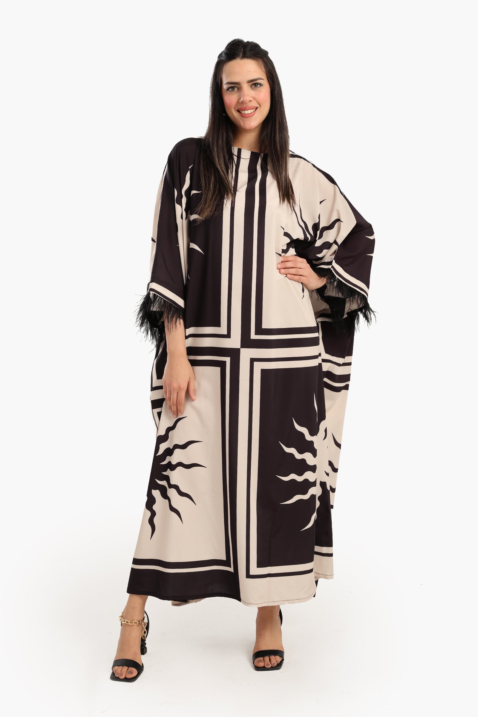 هذه العباءة الفاخرة ذات الطبعة الرسومية المزينة بالريش قطعة مميزة تجمع بين الرقي واللمسة الفنية الجريئة. مصممة بقصّة مريحة، تنسدل بأناقة، لتوفر الراحة والأناقة. يضفي النمط الهندسي الأسود والبيج، المزين بنقوش شمسية أخاذة، لمسة عصرية خالدة. أكمامها الواسعة مع أطراف أكمام مزينة بالريش تضفي لمسة من الفخامة، مما يجعلها مثالية للمناسبات الخاصة أو التجمعات الأنيقة. مصنوعة من قماش خفيف الوزن وانسيابي، تضمن التهوية وسهولة الحركة مع الحفاظ على أناقة أنيقة. سواء ارتديتها كقطعة مميزة أو فوق طقم، فإن هذه العباءة هي مثال للرقي والأناقة.