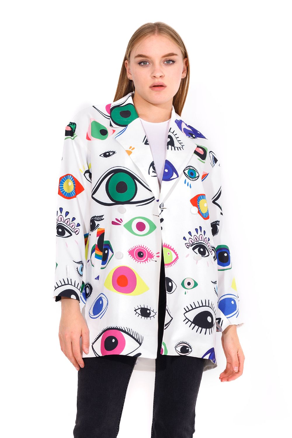 أضف قطعة عصرية إلى خزانة ملابسك مع هذه البليزر، حيث تتميز بتصميم مطبوع ومتعدد الألوان وأكمام طويلة لتشعري بالأناقة عند ارتدائها