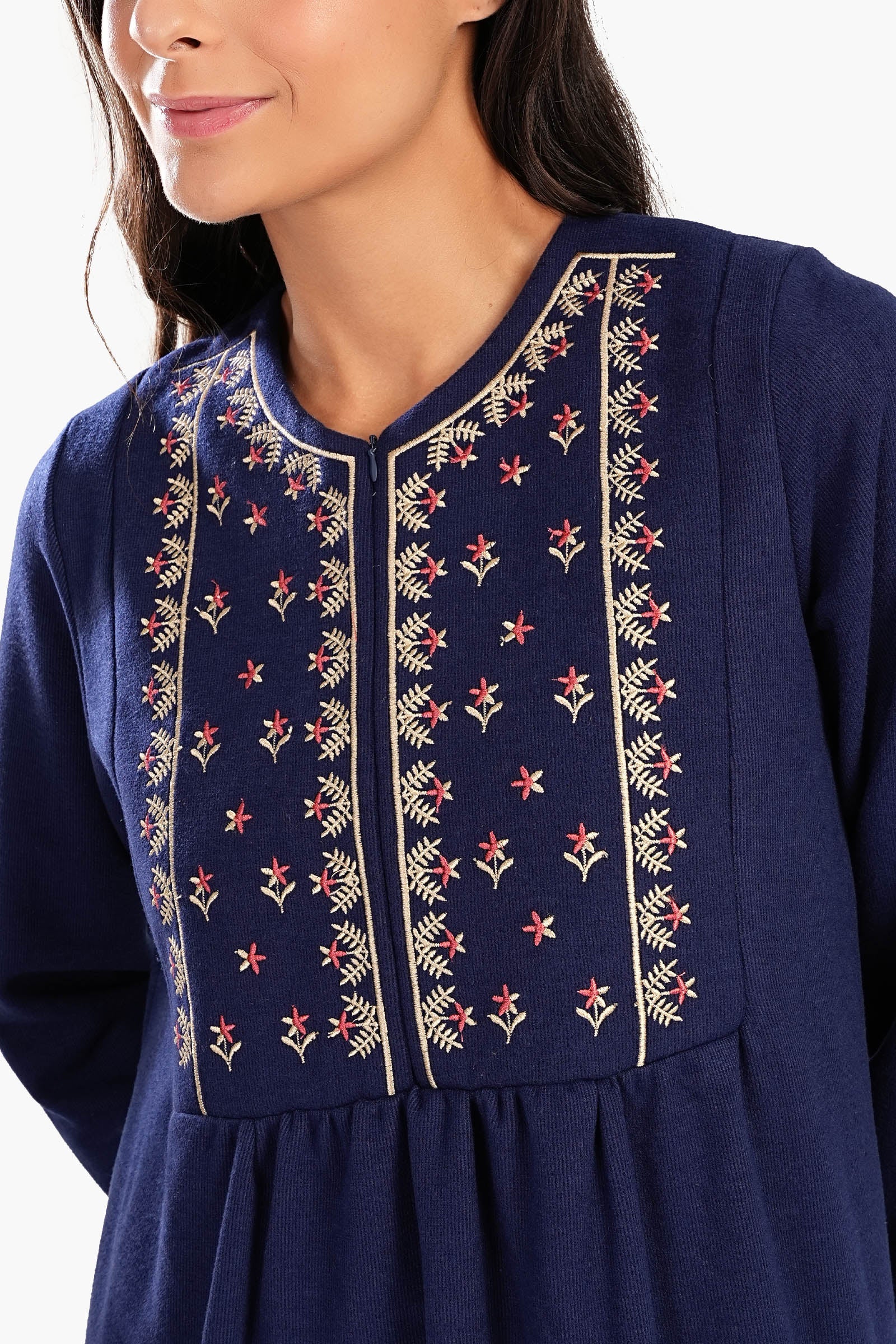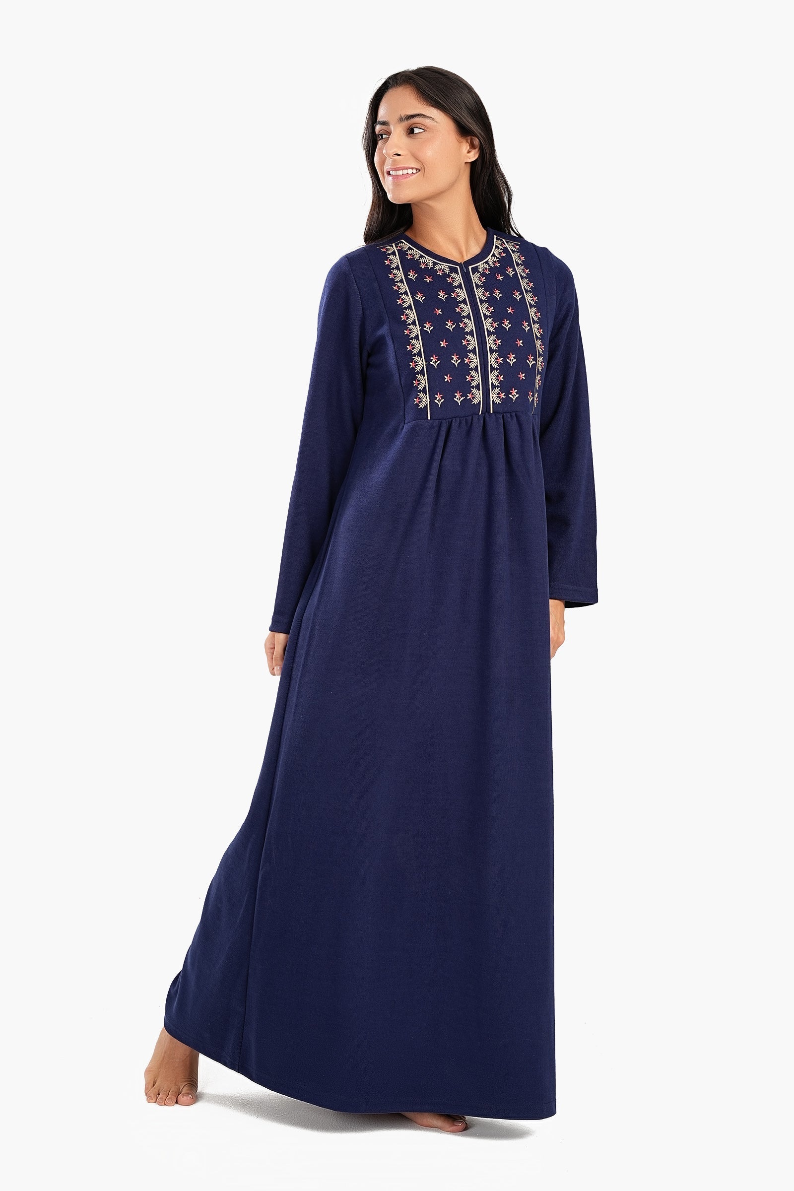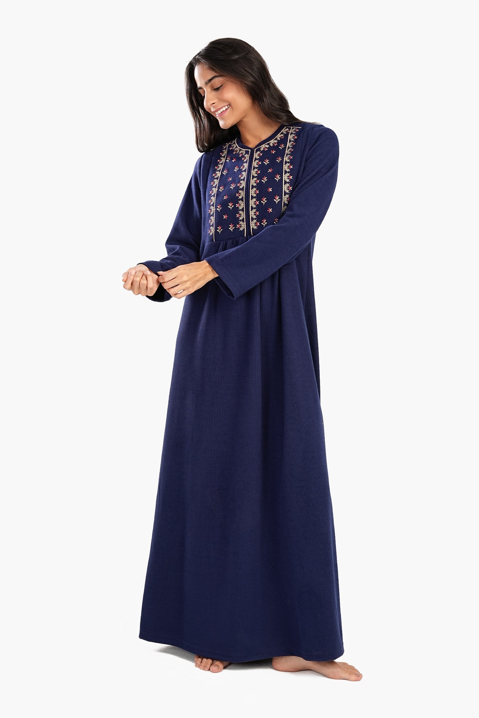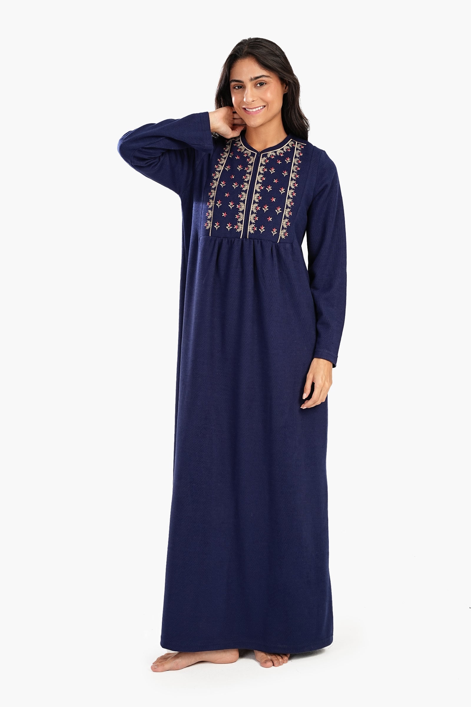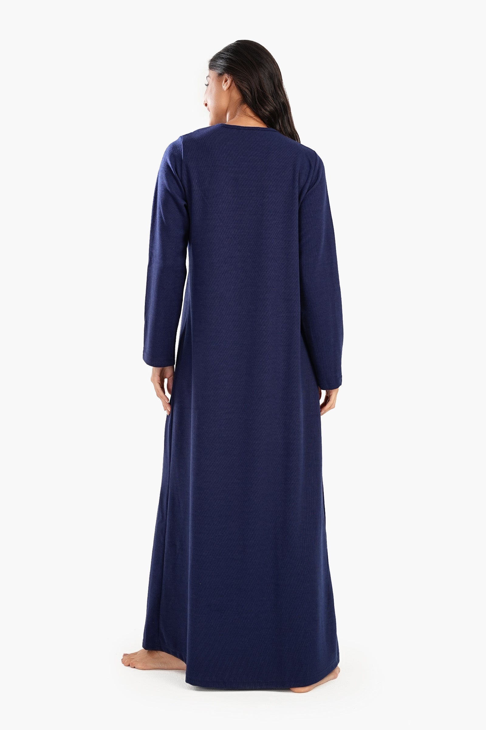 قميص نوم كحلي هذا يجمع بين الأناقة والراحة بقصته المريحة ونقشته الكلاسيكية المتينة. يُضفي التطريز الرقيق على الصدر لمسة من الأناقة، بينما يُضفي الياقة الدائرية والفتحة النصفية المزودة بسحاب لمسة عصرية. يتميز بأكمام طويلة للدفء وطول ماكسي لتغطية كاملة، وهو مصمم ليجمع بين الراحة والجمال. تصميمه سهل الارتداء يضمن سهولة الارتداء، مما يجعله مثاليًا لليالي الدافئة.