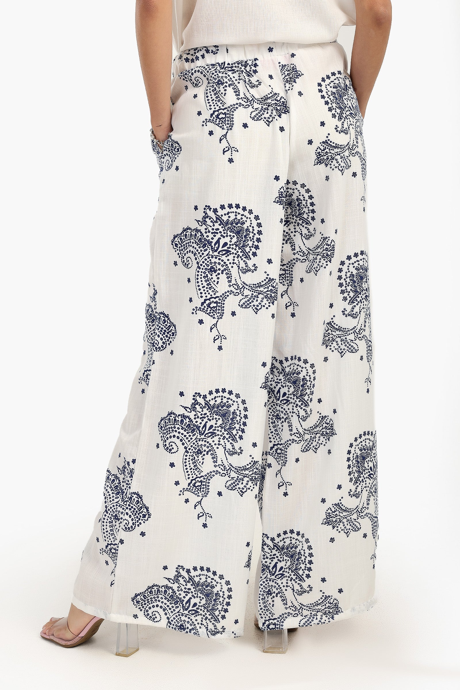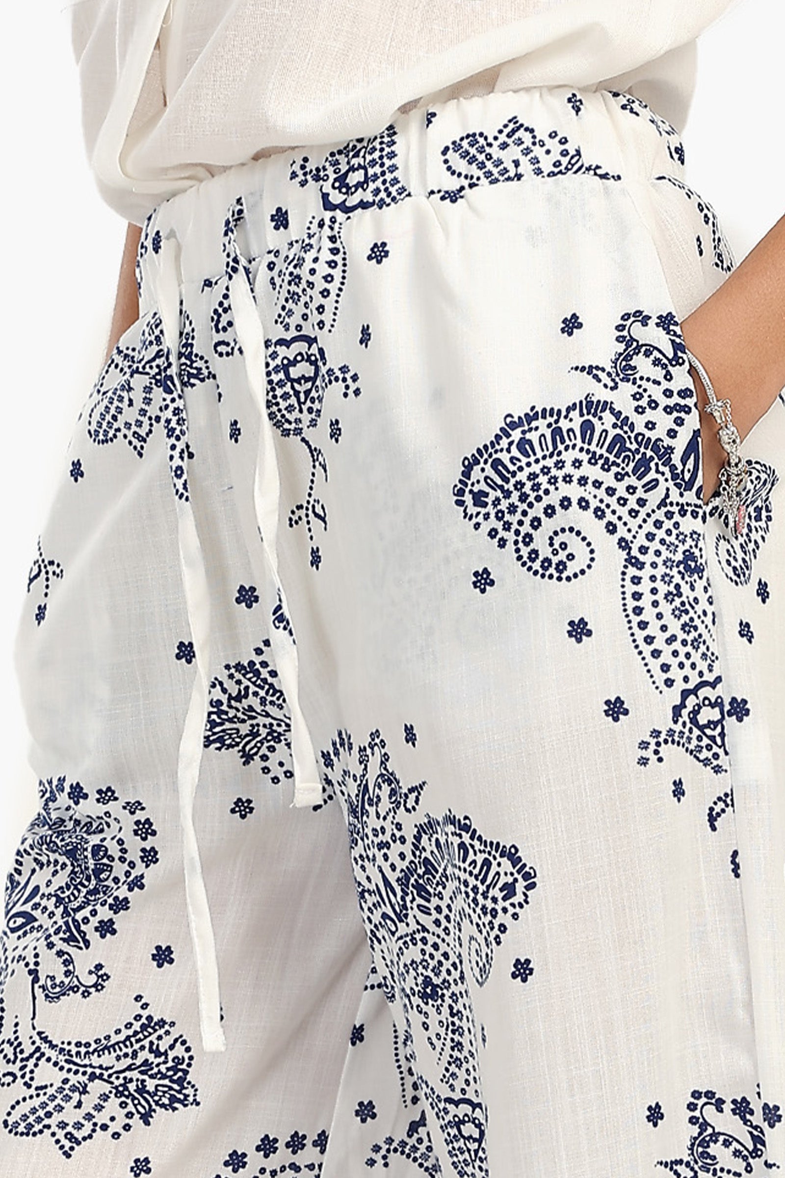 استمتعي بأناقة مريحة مع هذا البنطال الأبيض العاجي بنقشات زرقاء . مصمم بقصّة مريحة ، يوفر هذا البنطال راحة طوال اليوم مع الحفاظ على مظهر أنيق ومريح. يضفي النمط المطبوع لمسة شخصية وجاذبية بصرية، مما يجعله قطعة مميزة في خزانة ملابسك. يضمن الخصر المطاطي المزود برباط تثبيتًا محكمًا وقابلًا للتعديل، بينما تمنحك قصة الساق الواسعة مظهرًا انسيابيًا ومريحًا. تصميمه الطويل يمنح هذا البنطال مظهرًا متعدد الاستخدامات، مثاليًا للمناسبات الرسمية وغير الرسمية. يتميز هذا البنطال بجيوب جانبية لمزيد من العملية، وهو سهل الارتداء ومثالي لأي يوم هادئ.