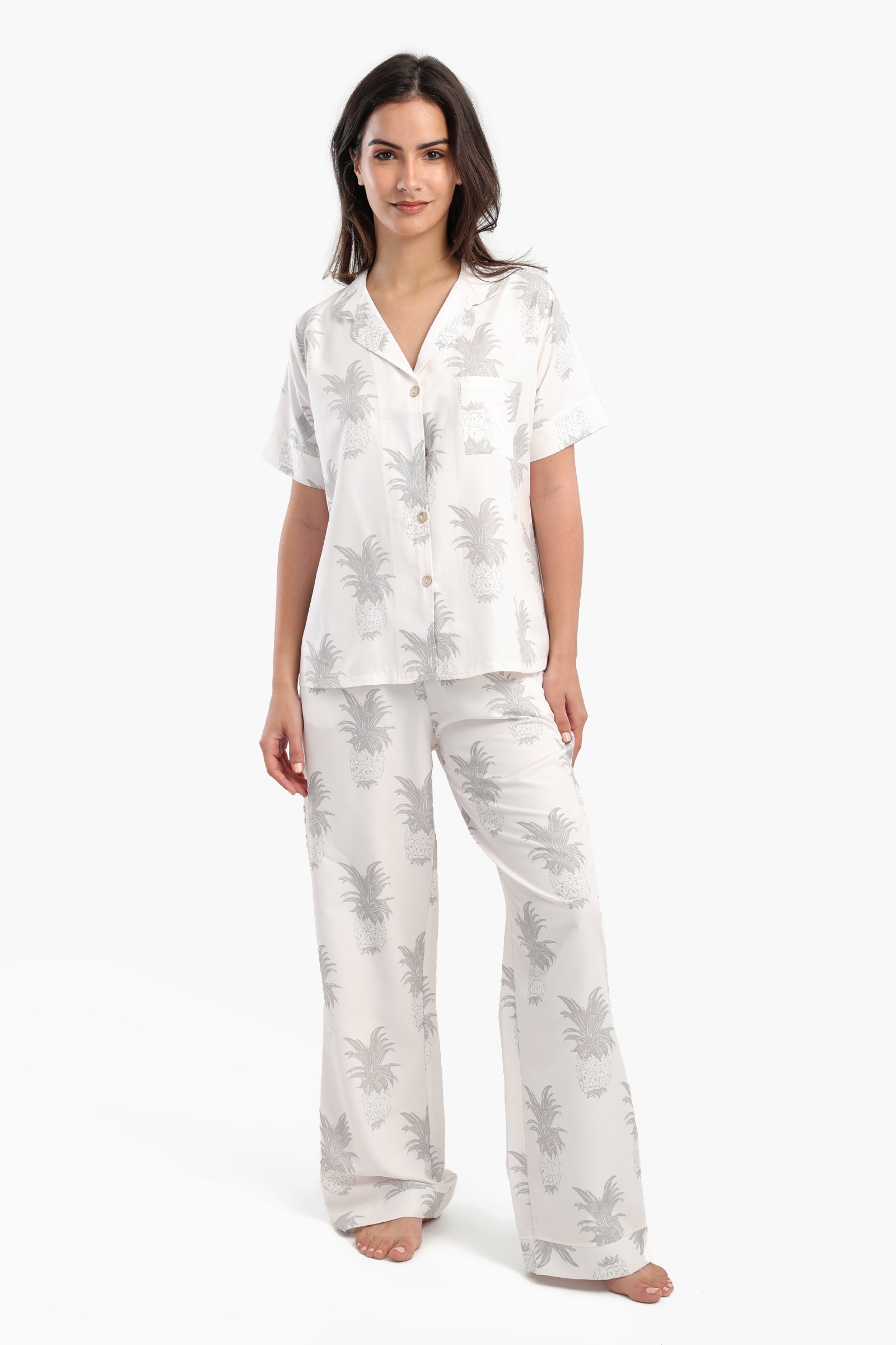 طقم بيجاما بطبعة الأناناس يُضفي لمسةً منعشةً ومرحةً على مجموعة ملابسك المريحة. مصنوع من قماش البوبلين خفيف الوزن، يوفر ملمسًا ناعمًا ومريحًا، مثاليًا لنوم هانئ أو للاسترخاء في المنزل. يضمن التصميم العادي سهولة الحركة، بينما يُضفي الياقة المدببة والأزرار لمسةً من الأناقة. يوفر البنطال ذو الخصر المرن والقصة الواسعة راحةً فائقة، بينما تُضفي الجيوب الجانبية لمسةً عملية. يُضفي جيب الصدر لمسةً من الأناقة والعملية على مظهر البيجاما الكلاسيكي.