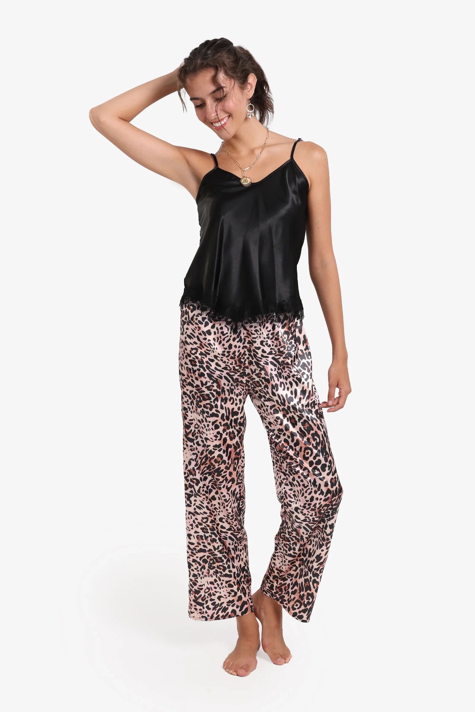 تتميز هذه البيجامة الساتانية بقصّة عادية وحمالات رفيعة وفتحة رقبة على شكل حرف V جذابة، مزينة بتطريز دانتيل أنيق في الأعلى. يُضفي الشق الخلفي لمسةً من الأناقة، بينما يضمن القماش خفيف الوزن الراحة. يمكن تنسيقها مع بنطال مطبوع بنقشة نمر جريئة، لتجمع بين التصميم الأنيق والراحة المريحة، مثالية للاسترخاء بأناقة.