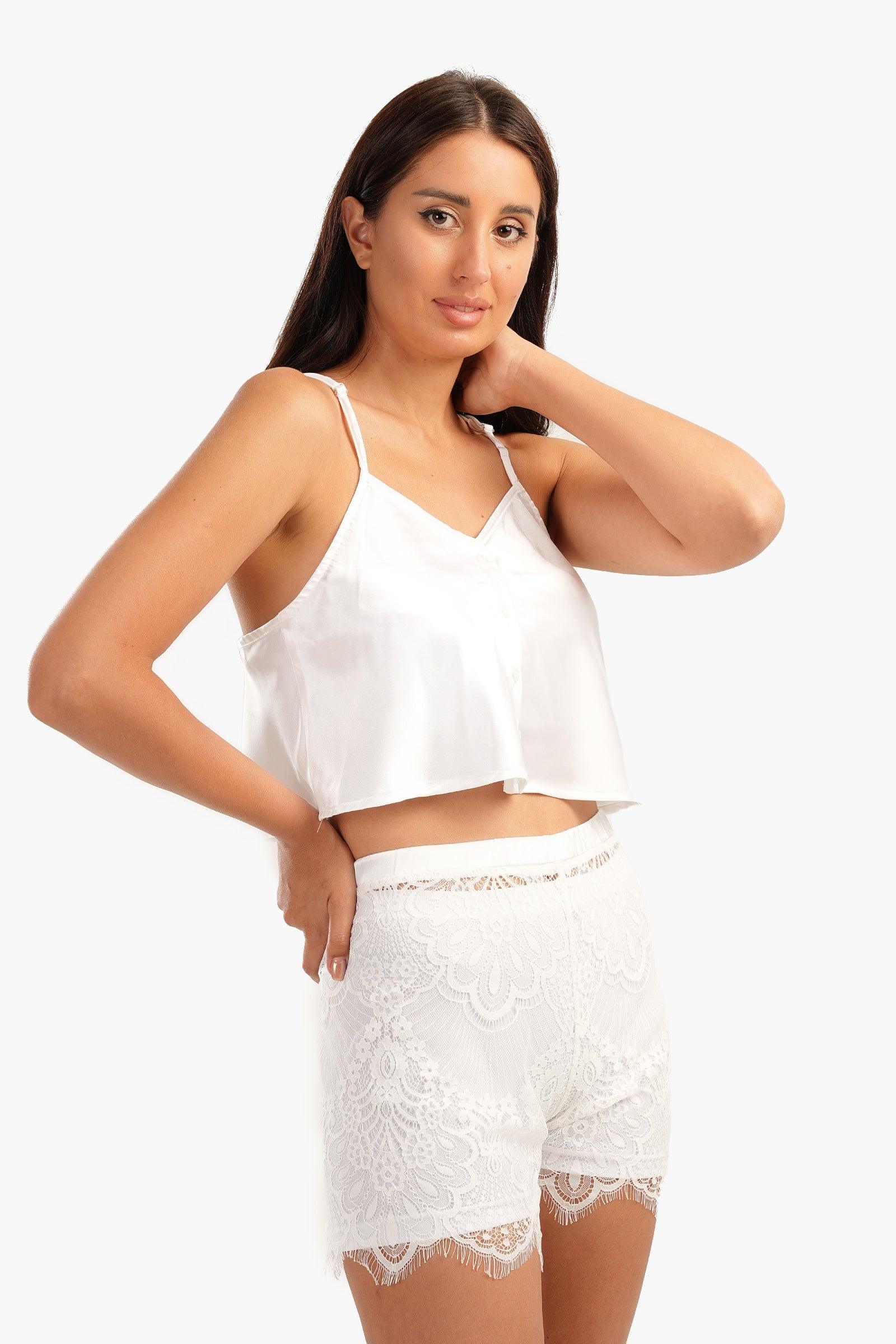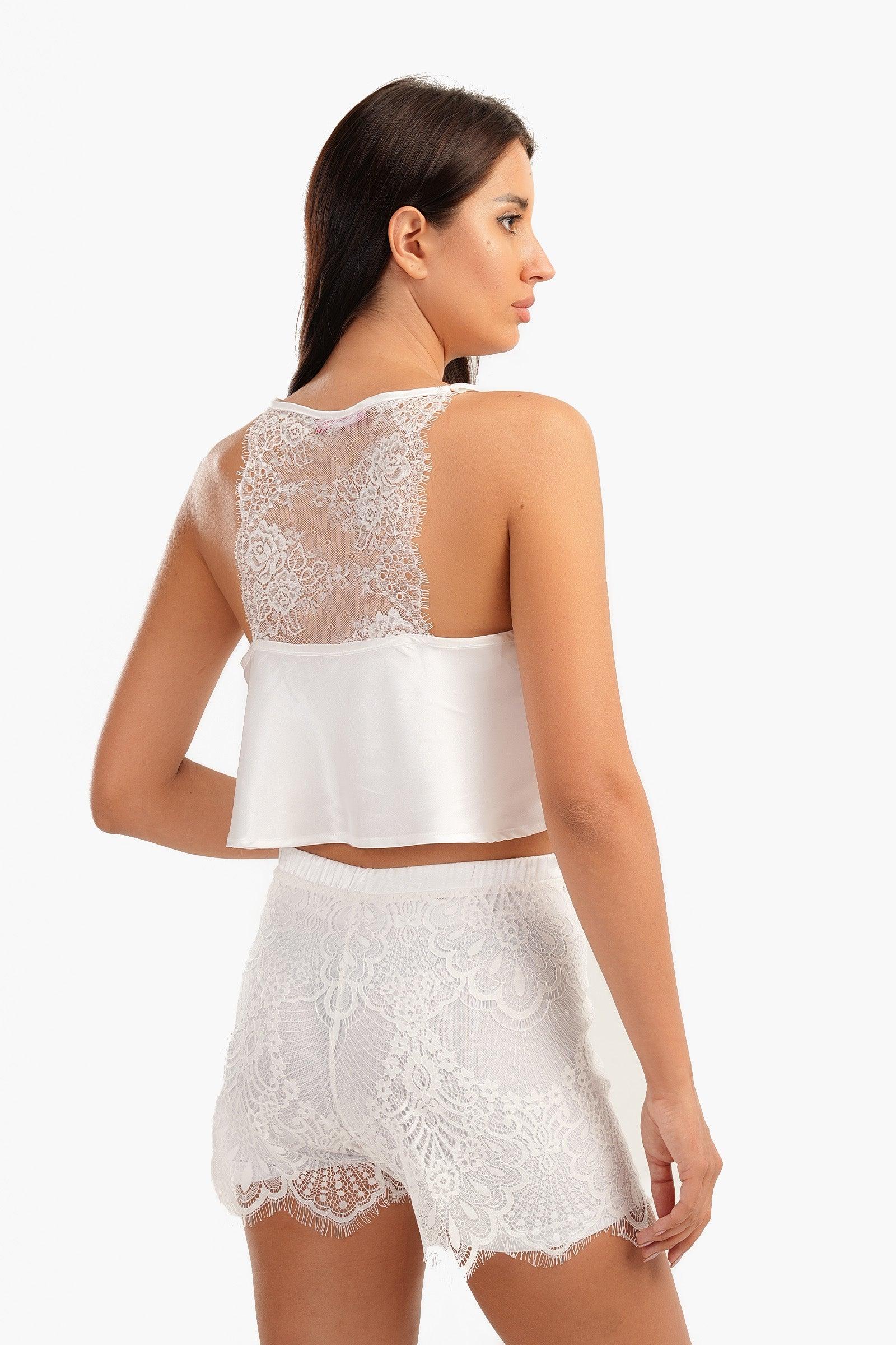 يُضفي الجزء الخلفي من الجزء العلوي لمسةً راقية على طقم البيجامة هذا. يُضفي هذا المزيج الفاخر من الساتان والدانتيل لمسةً من الأنوثة والجاذبية. يُكمل الشورت لمسة الفخامة بتصميمه الدانتيل الجذاب. يُضفي الدانتيل الرقيق لمسةً من الخفّة والتهوية على بشرتكِ، مع لمسةٍ من الرومانسية والأناقة.