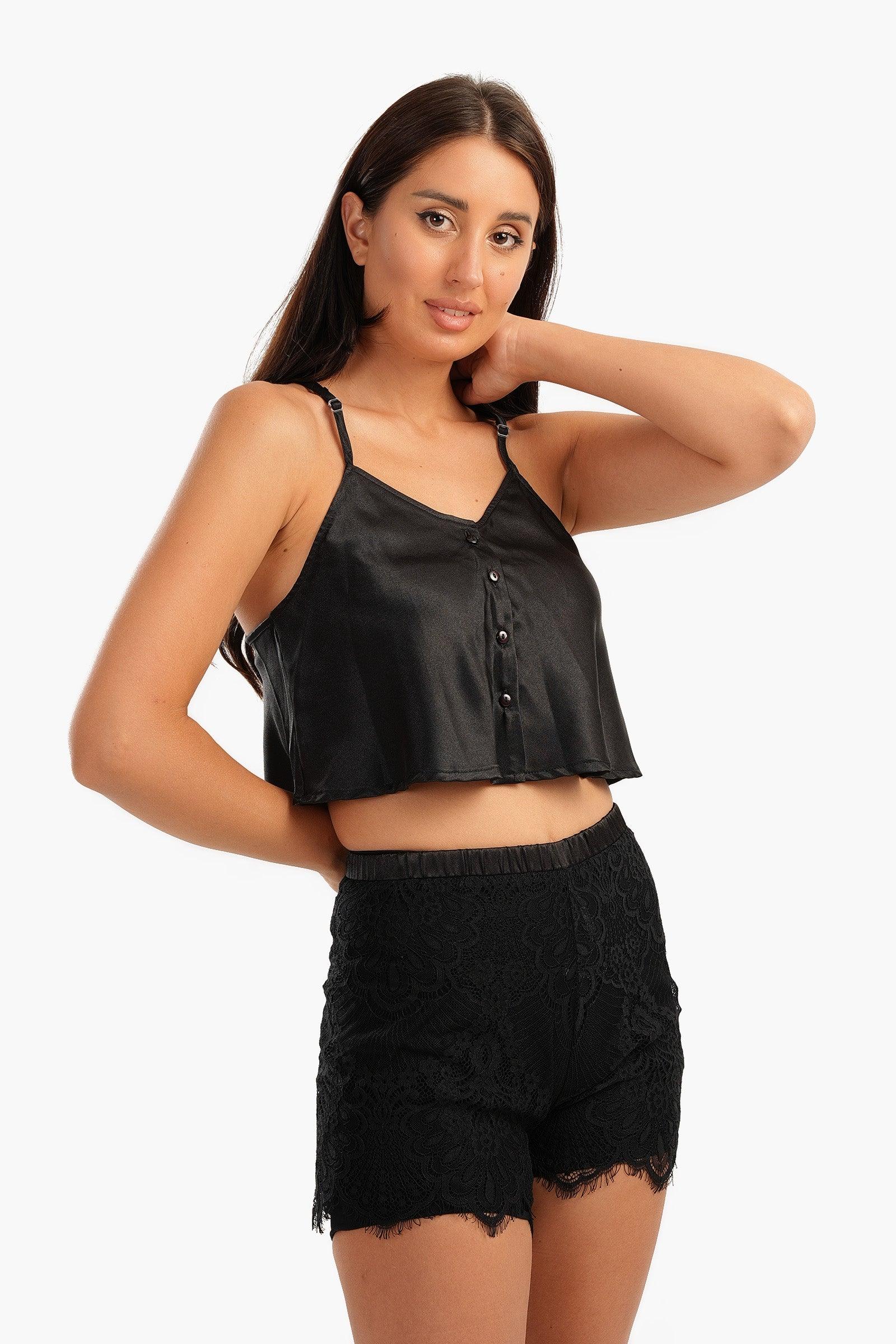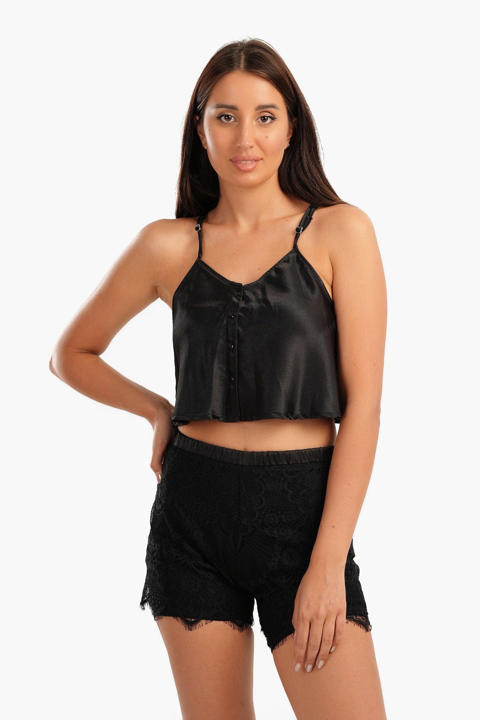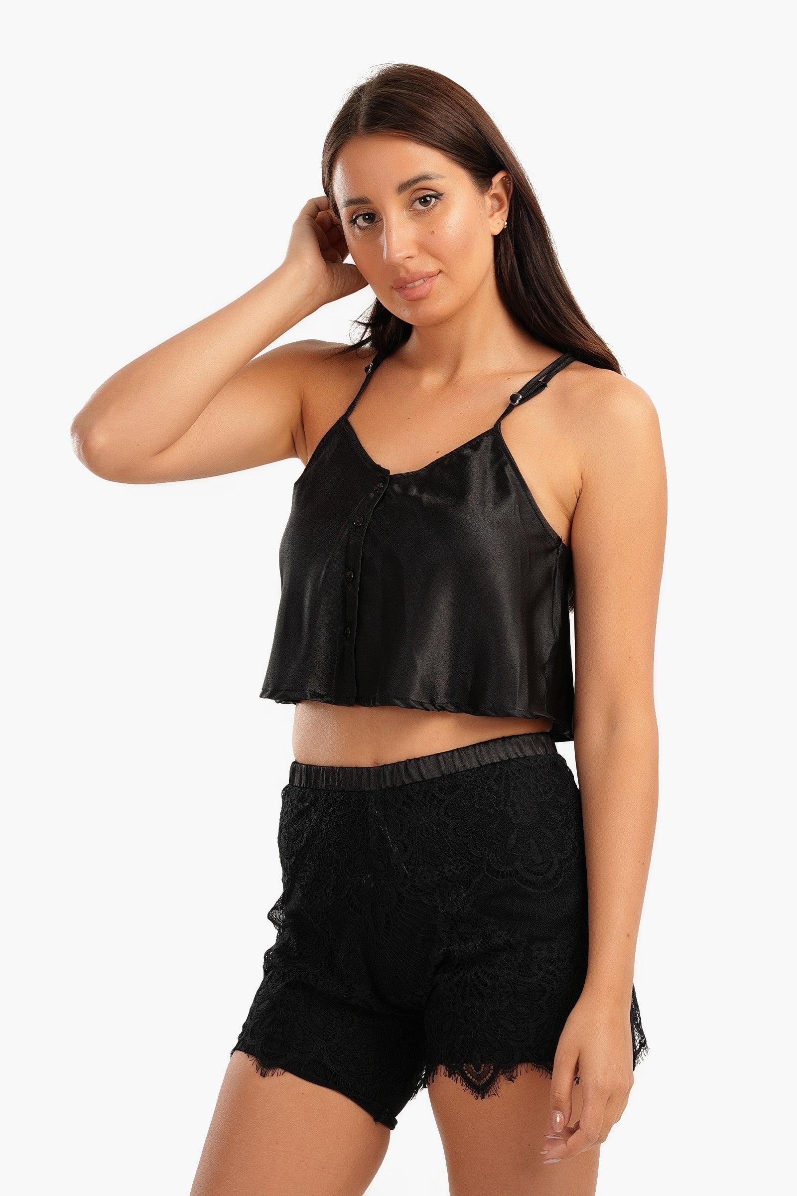 الجزء العلوي من طقم البيجاما هذا ينضح بالأناقة. يُضفي رقبة على شكل حرف V لمسة من الرقي، بينما يُضفي تصميم الأزرار الأمامية لمسةً أنيقةً تُحيط بالخصر. مثالي لليالي الدافئة، تصميمه القصير وتصميمه بدون أكمام يُبقيكِ منتعشةً ومريحة. لمزيد من الراحة، تُتيح لكِ الأشرطة الرفيعة القابلة للتعديل اختيار المقاس المثالي، مما يضمن لكِ راحةً طوال الليل.