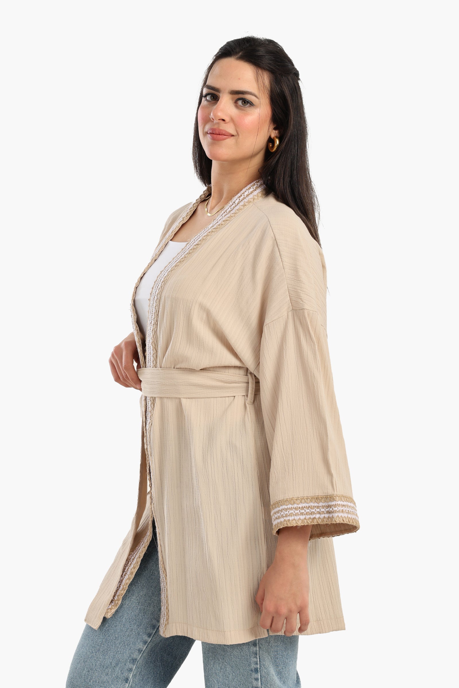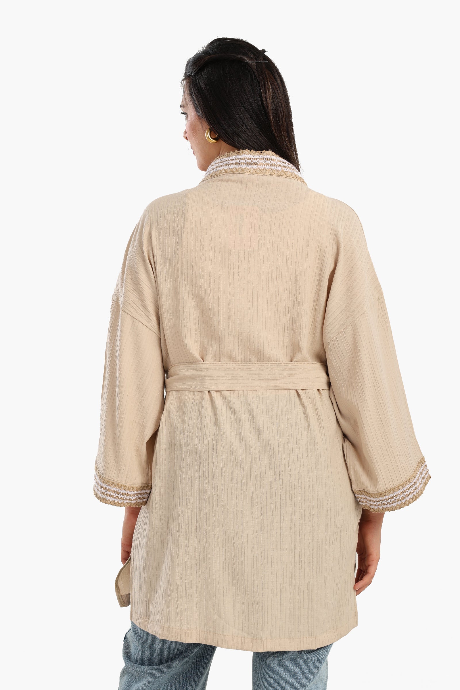 صُمم هذا الكيمونو بفتحة رقبة مفتوحة وأكمام طويلة، ليمنحكِ سهولة في الحركة مع الحفاظ على مظهر أنيق. تضفي الأكمام والحاشية المطرزة لمسة فنية دقيقة، مما يجعله قطعة مميزة. يضمن طوله حتى الورك وحاشيته المستقيمة مظهرًا جذابًا، بينما يتيح لكِ حزام الخصر القابل للفصل تعديل مقاسكِ - سواءً تركتِه مفتوحًا لإطلالة انسيابية أو مشدودًا عند الخصر لمظهر أكثر أناقة. مثالي للارتداء على طبقات متعددة، يُعد هذا الكيمونو قطعة أساسية متعددة الاستخدامات، سواءً للإطلالة الكاجوال أو الأنيقة.