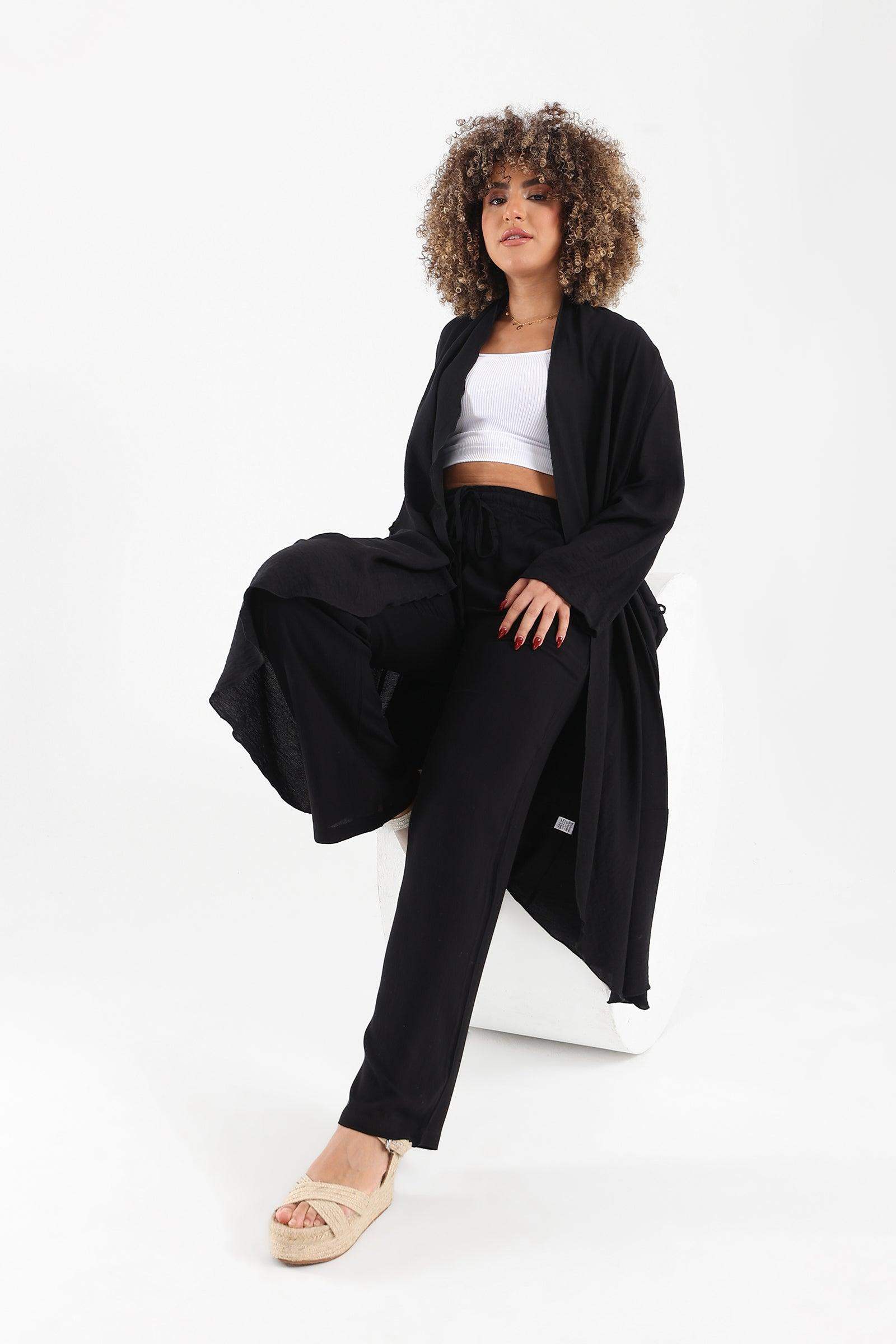 إذا كنت متجهًا إلى نزهة غير رسمية، فإن هذا الكيمونو يعزز مظهرك بسهولة بفضل تصميمه الخالد والعملي. يخلق طول الكيمونو متوسط الطول صورة ظلية متطورة ومتعددة الاستخدامات. يقع هذا الطول أسفل الركبة وفوق الكاحل، مما يوفر مظهرًا جذابًا ومتواضعًا مناسبًا لمختلف المناسبات. يضيف إدراج الجيوب الجانبية المستديرة في الكيمونو عنصرًا عمليًا وعمليًا إلى مظهرك. توفر هذه الجيوب خيار تخزين مريح للضروريات الصغيرة. إنها لا توفر الوظيفة فحسب، بل تضيف أيضًا تفاصيل دقيقة إلى تصميم الكيمونو. تخلق الجيوب الجانبية المستديرة ميزة فريدة وملفتة للنظر تميز هذا الكيمونو عن غيره، حيث تجمع بين الأناقة والراحة في واحد. يكمل هذا الكيمونو مجموعة متنوعة من الملابس بسلاسة وكيف يمكنك إقرانه مع بنطاله المطابق.