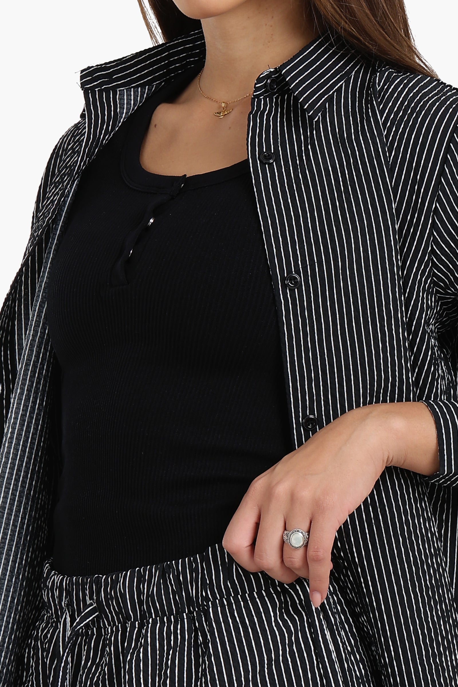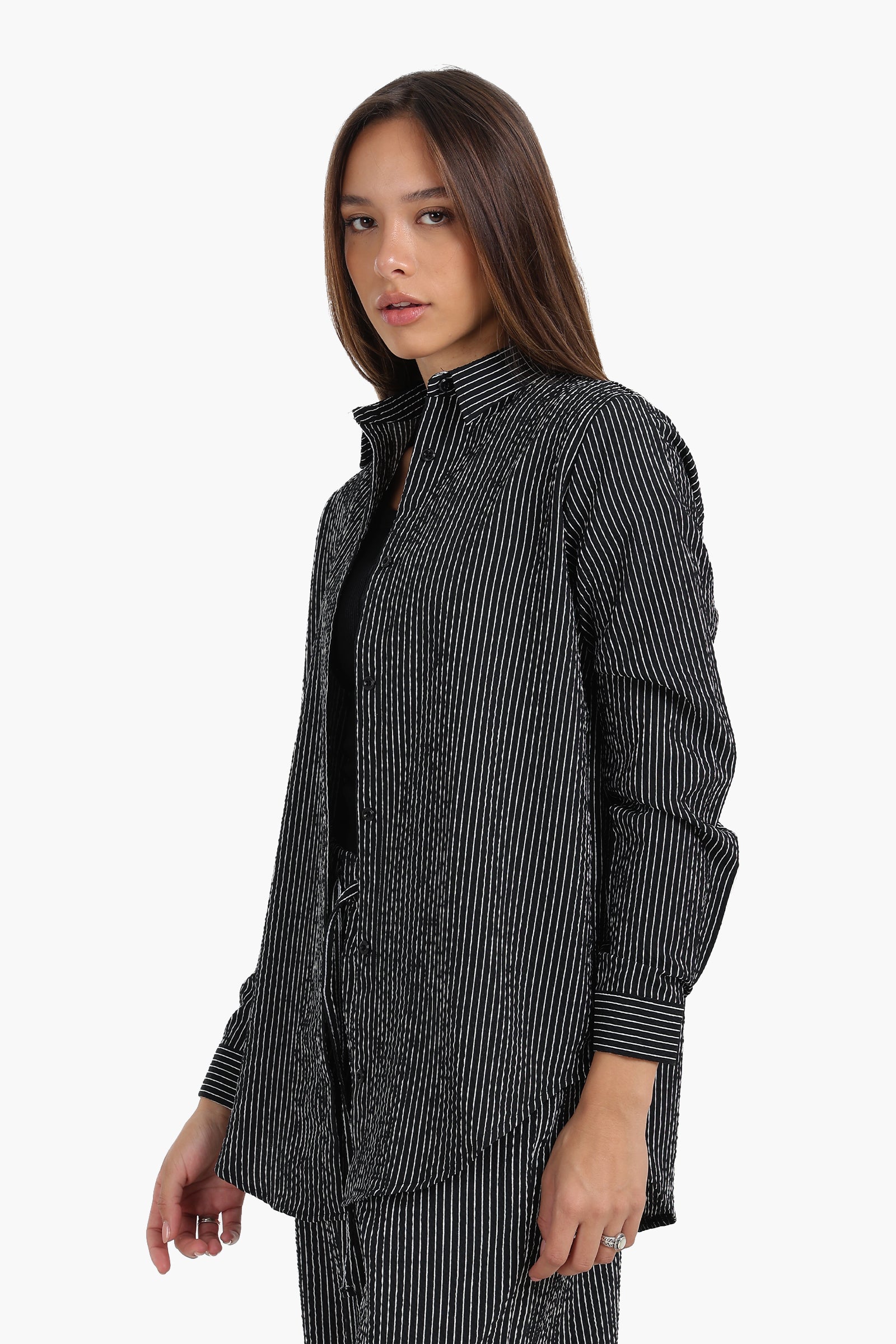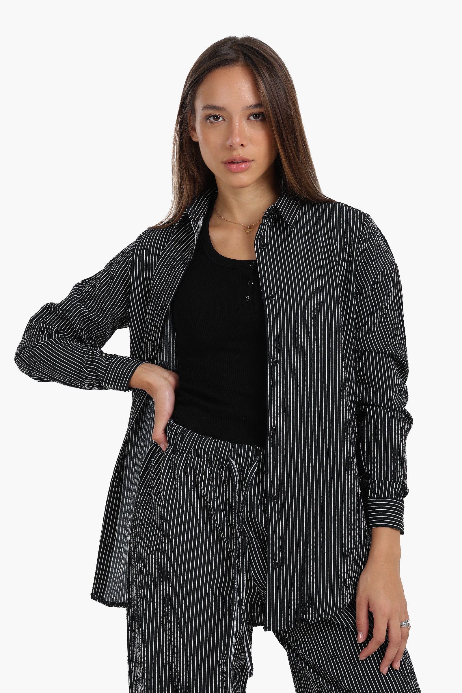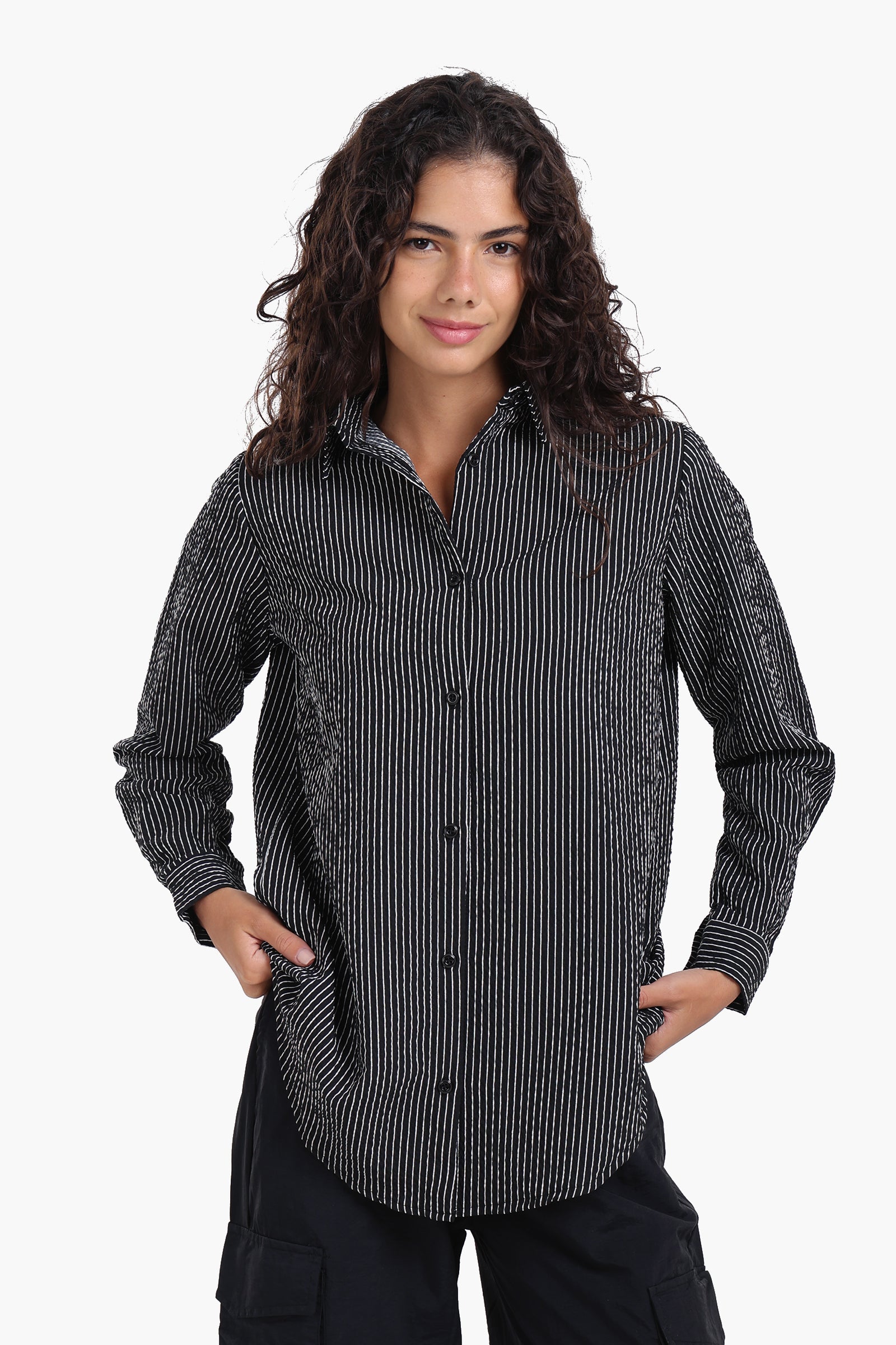 هذا القميص المخطط قطعة أساسية في خزانة ملابسك، يجمع بين الأناقة والراحة. مصنوع من مزيج بوليستر ناعم، يتميز بقصّة عادية مثالية للارتداء اليومي. ياقة دائرية وأزرار للإغلاق مع فتحة كاملة تمنحه مظهرًا كلاسيكيًا خالدًا، بينما توفر الأكمام الطويلة دفئًا إضافيًا وتنوعًا في الاستخدام. تضفي الحافة المستديرة لمسة عصرية، مما يسهل تنسيقه مع الجينز أو البنطلونات. سواء كنتِ ترتدين ملابس رسمية أو عادية، فهذا القميص سهل الارتداء قطعة أساسية في أي مناسبة.
