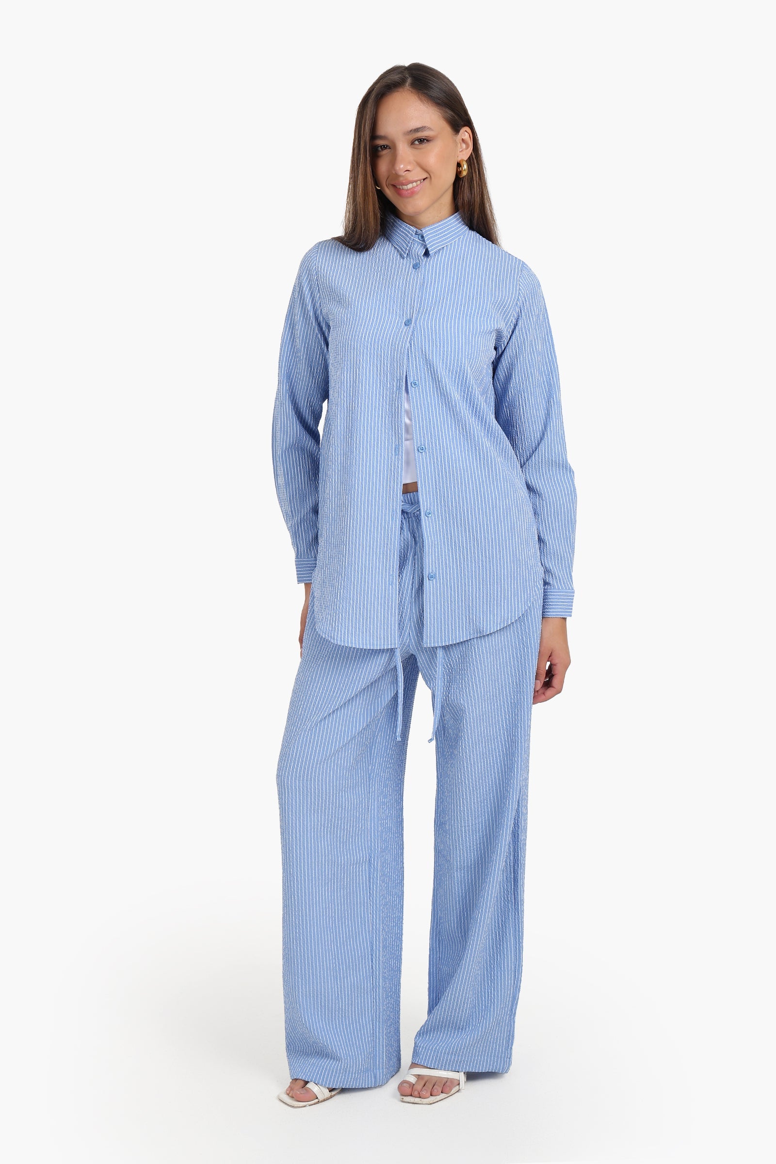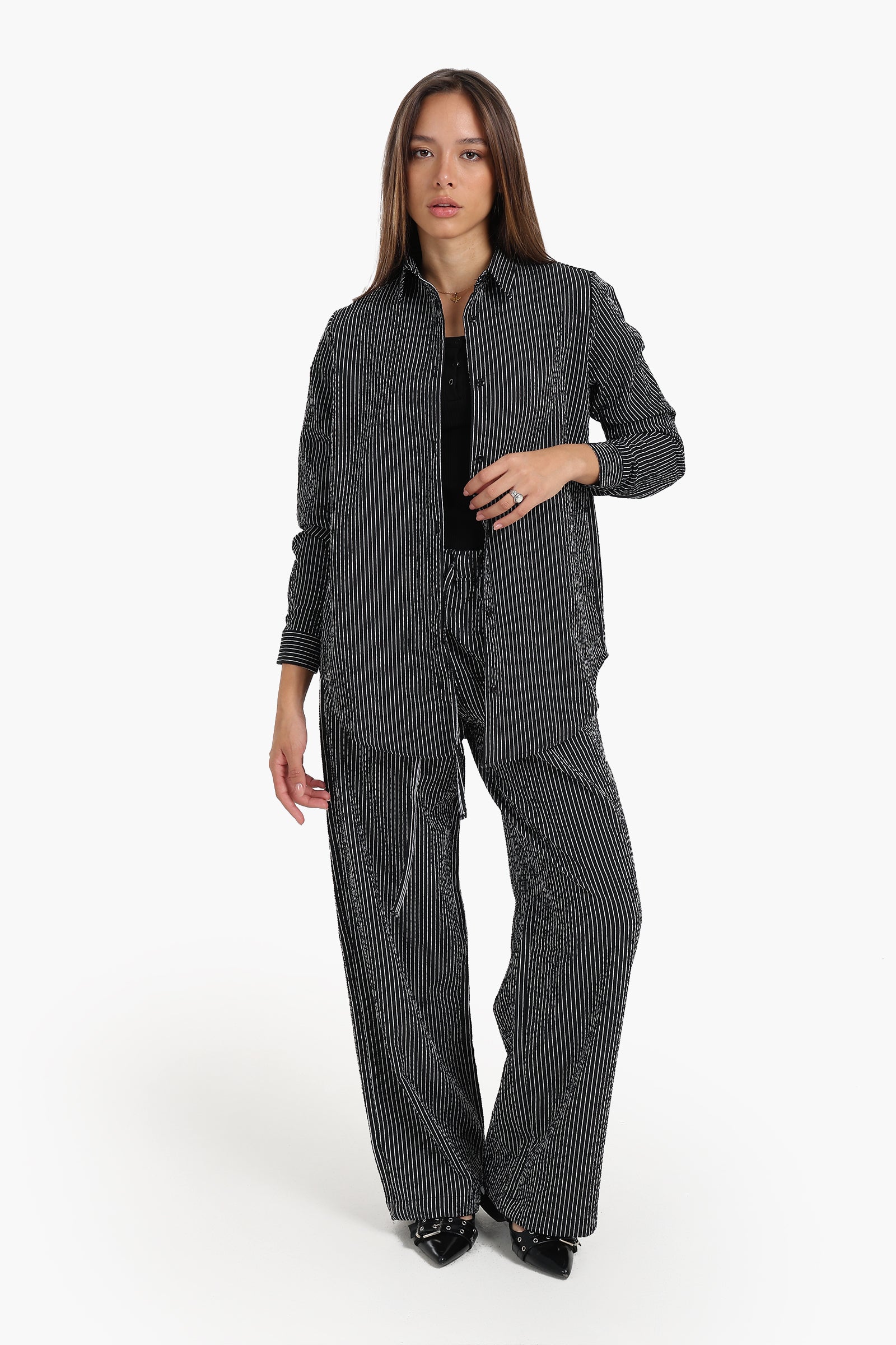 جاهز للمكتب : أدخلي القميص داخل بنطال مصمم خصيصًا لكِ وارتديه مع حذاء بدون كعب لإطلالة أنيقة.