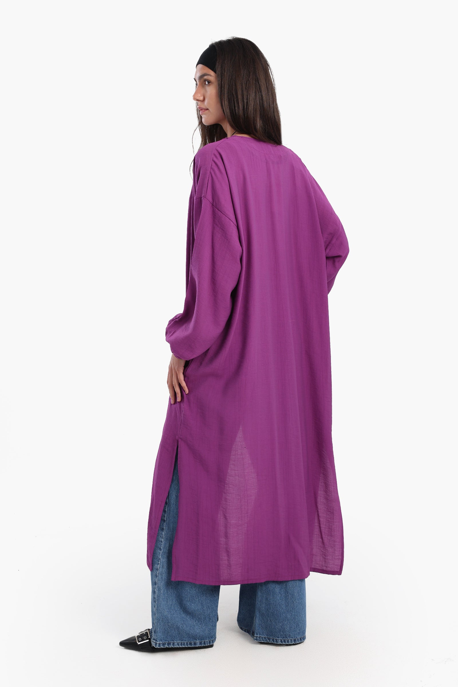أكمامها الطويلة وأساورها المرنة تُضفي لمسةً أنيقةً مع الحفاظ على مظهرها الكاجوال والمريح. تصميمها متوسط الطول يُضفي لمسةً من الأناقة، إذ يُوفر تغطيةً ممتدةً تُكمل الإطلالات الكاجوال وشبه الرسمية. بفضل تصميمها سهل الارتداء، تُعدّ هذه السترة قطعةً أساسيةً لكل من ترغب في إضافة لمسةٍ من الأناقة والبساطة إلى إطلالتها الصيفية.