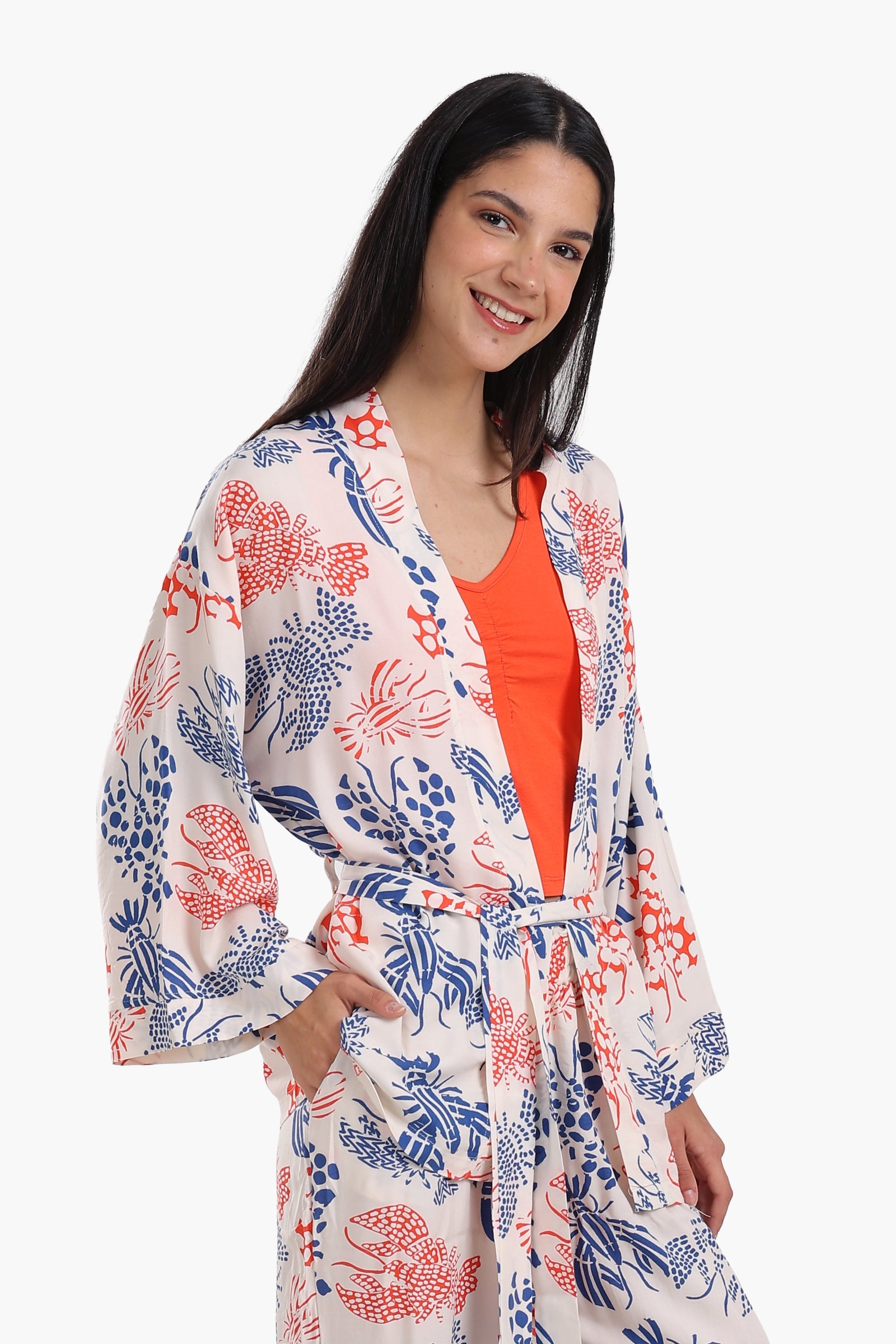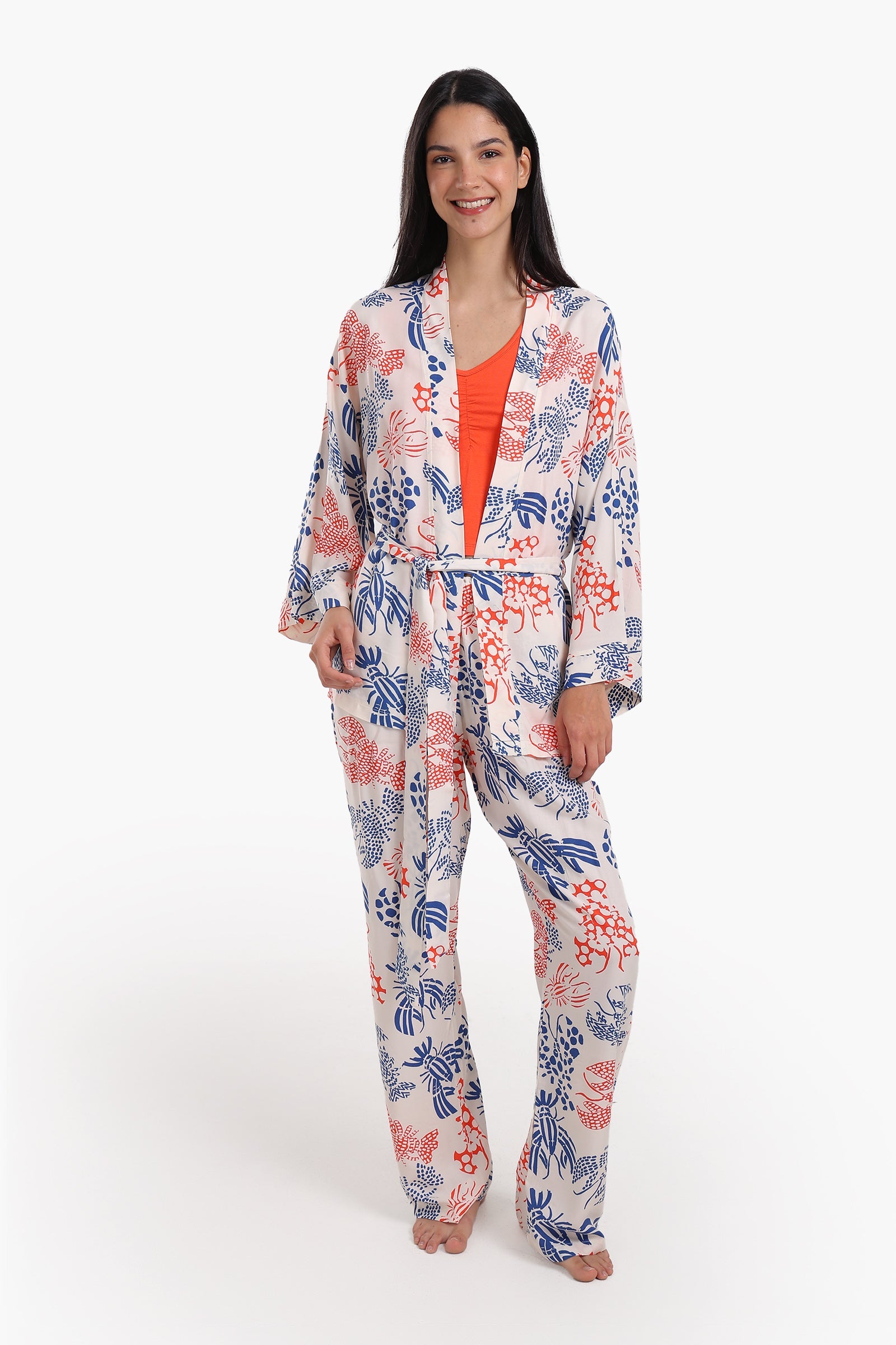 استمتعي بأقصى درجات الراحة والأناقة مع طقم البيجامات الرائع المكون من ثلاث قطع، المصمم ليمنحكِ شعورًا بالفخامة أثناء نومكِ. مصنوع من فيسكوز ناعم وجيد التهوية، ويتضمن بلوزة ضيقة، وبنطالًا مطبوعًا، ورداءً مطابقًا لإطلالة أنيقة ومريحة.