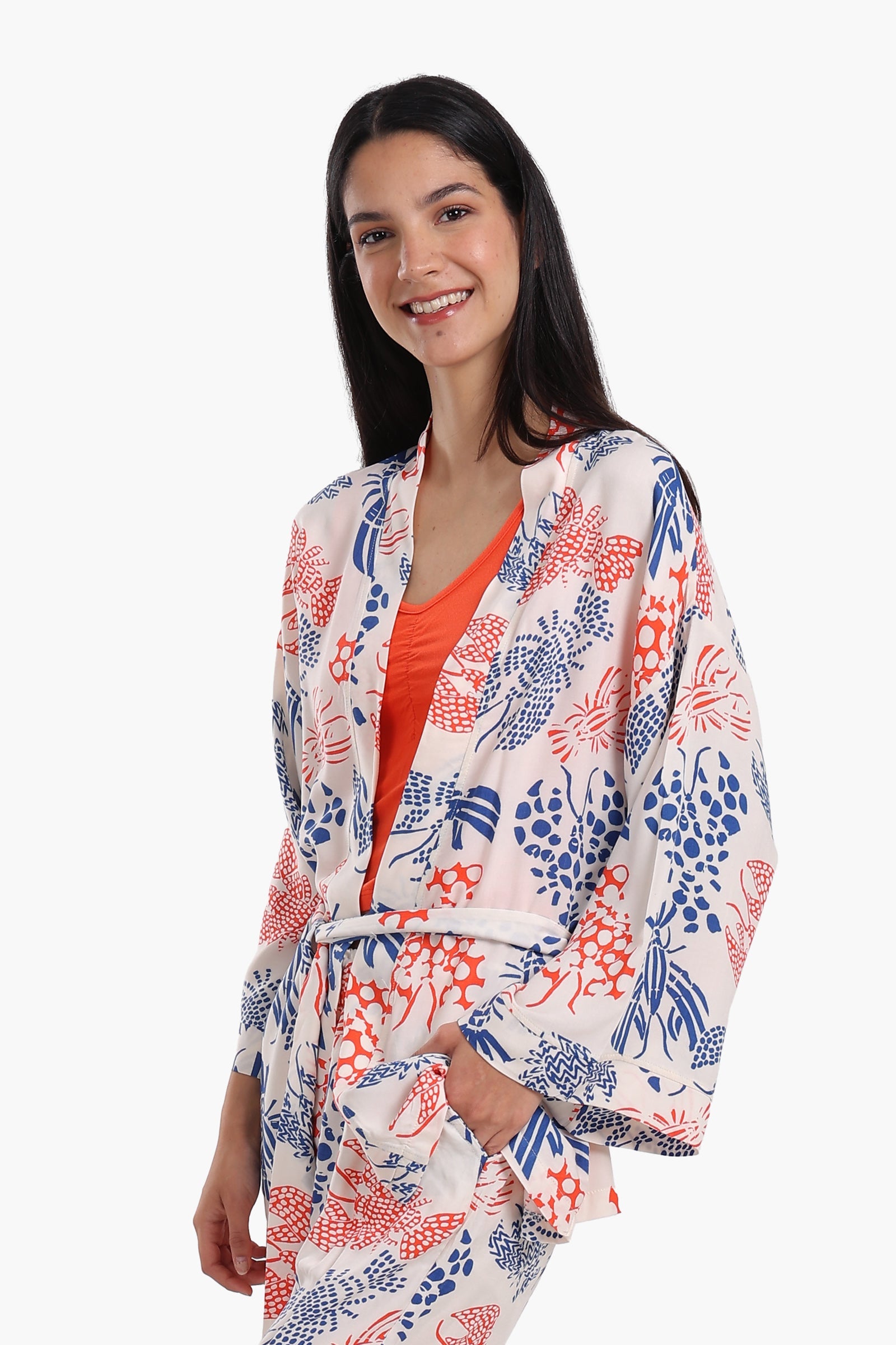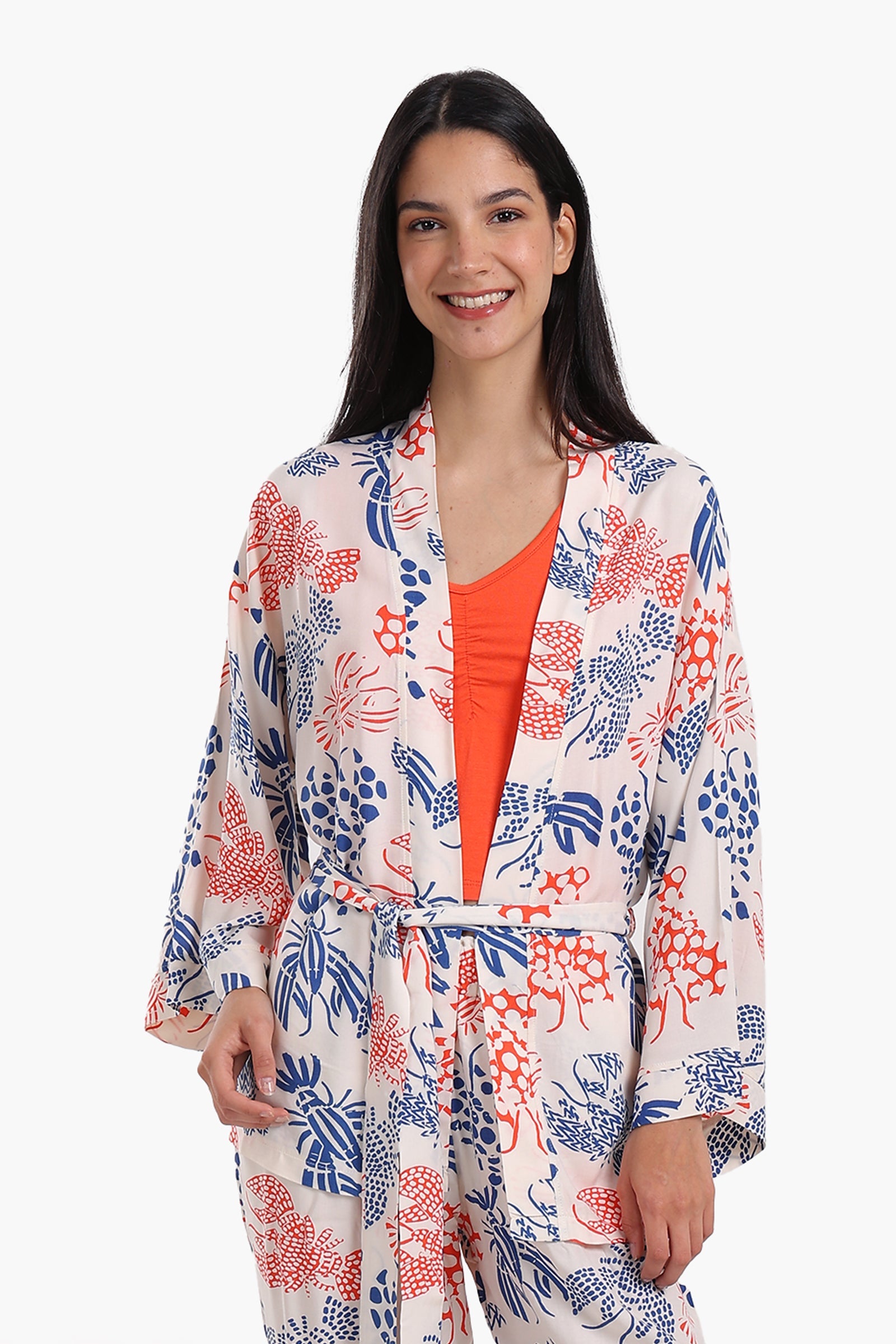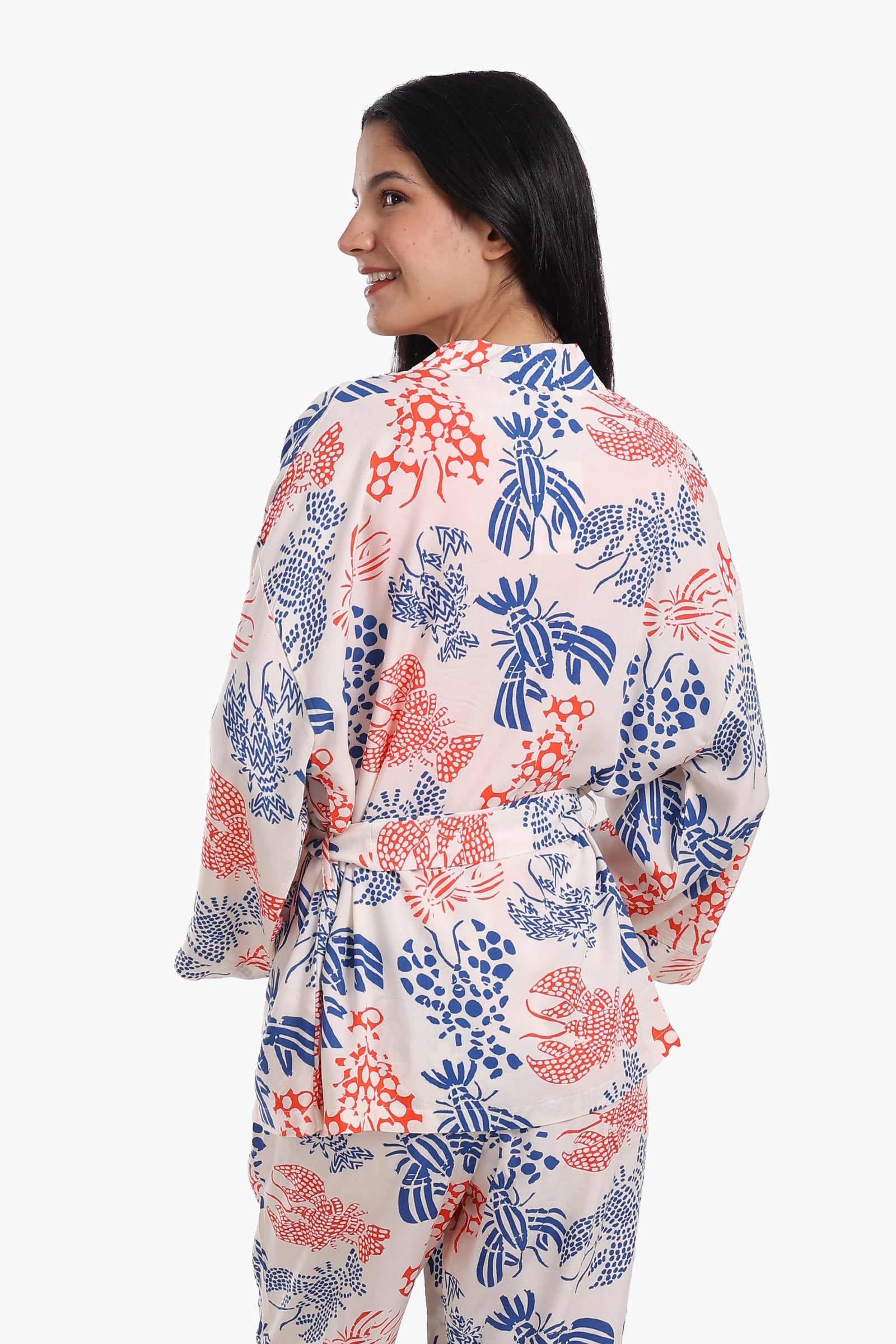 يتميز هذا القميص الضيق بفتحة رقبة على شكل حرف V وتصميم قصير بدون أكمام، مما يجعله مثاليًا للاسترخاء والراحة طوال الليل. يتميز البنطال الطويل بنقشة مطبوعة مرحة بقصة مستقيمة وخصر مطاطي، مما يوفر سهولة الحركة ومقاسًا مريحًا. ويكمل هذا الطقم رداء مطبوع بقصته المريحة، وفتحة رقبة أمامية مفتوحة، وحزام خصر قابل للفصل، مما يسهل عليكِ ارتداء عدة طبقات عند الحاجة لمزيد من الراحة.