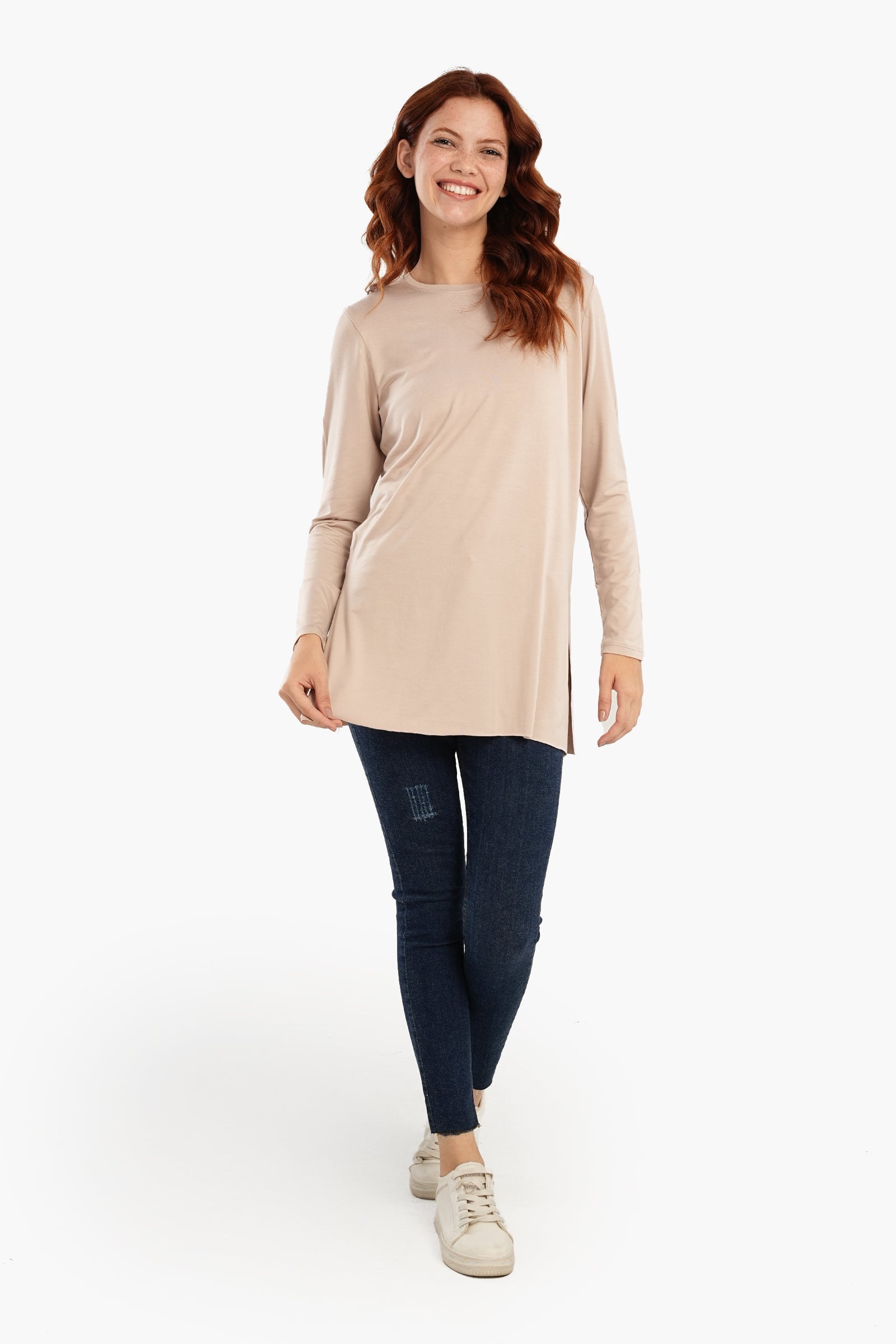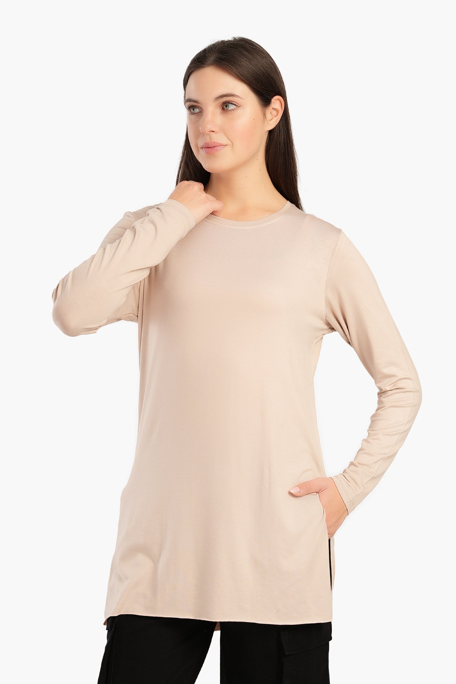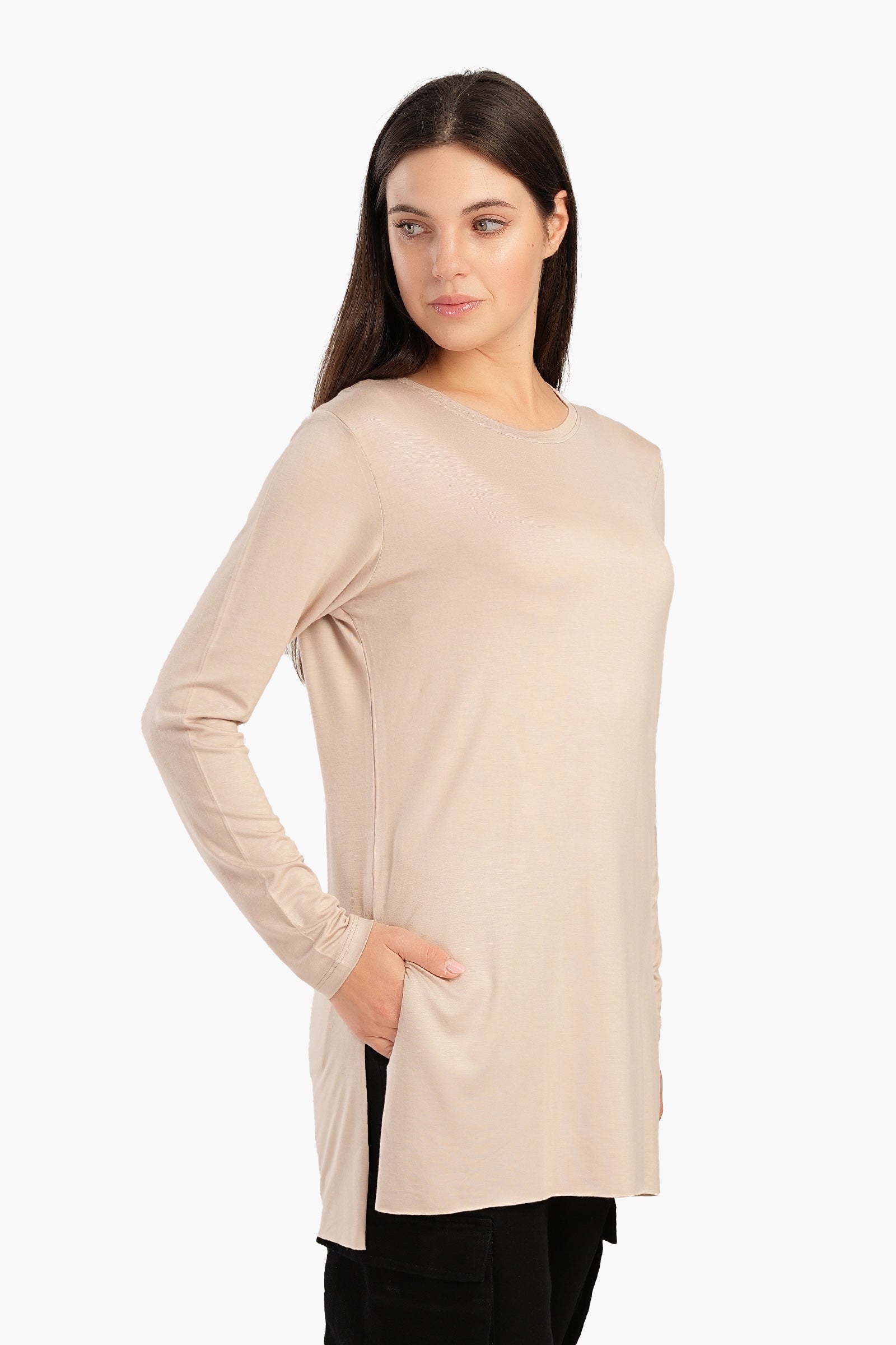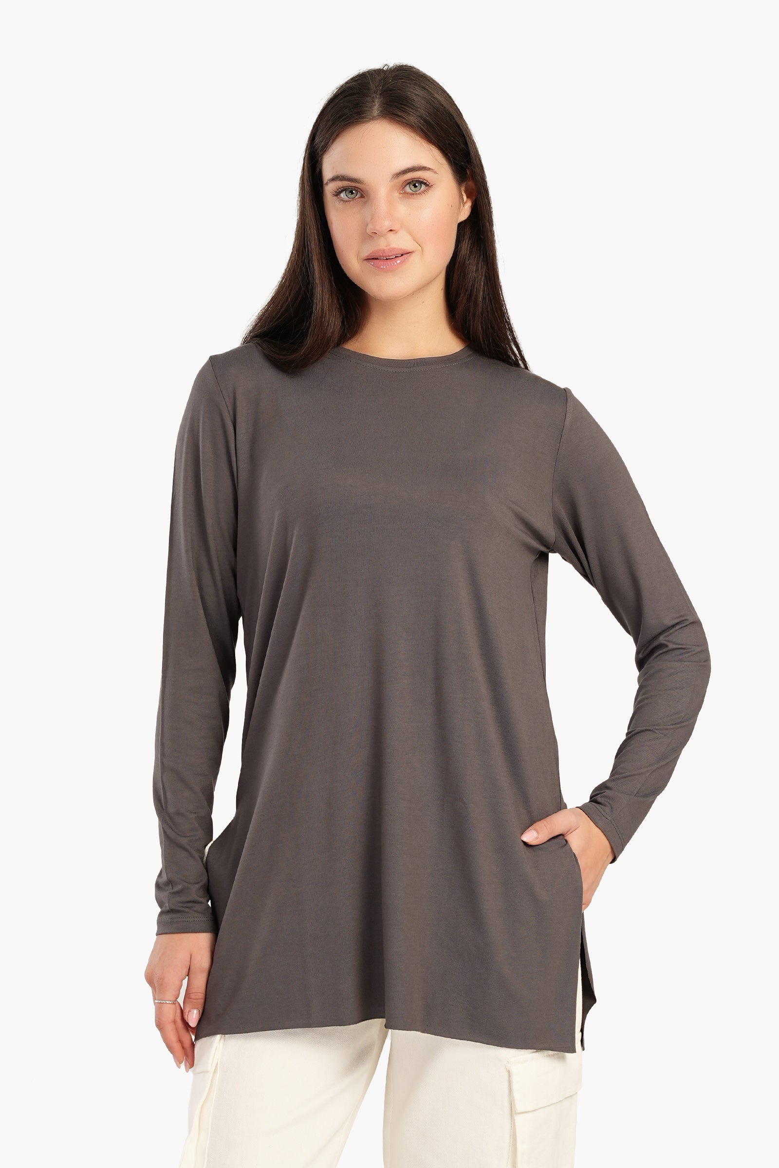 هذا التيشيرت المصنوع من الفيسكوز يمنحكِ الراحة والأناقة بقصته المريحة وقماشه الناعم والمسامي. نقشته المتناسقة تجعله قطعة أساسية متعددة الاستخدامات في خزانة ملابسكِ، بينما تمنحه الرقبة المستديرة مظهرًا عصريًا وعصريًا. بأكمامه الطويلة وفتحتين جانبيتين، يضفي هذا التيشيرت لمسة من الراحة والانسيابية على إطلالتكِ. تصميمه سهل الارتداء يضمن لكِ الراحة والأناقة دون عناء.