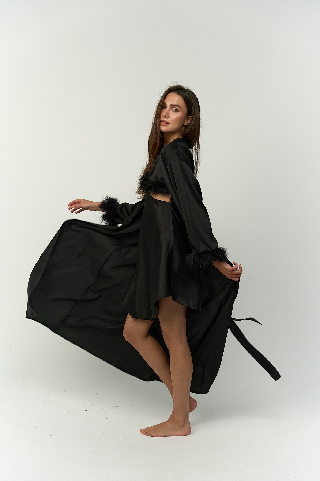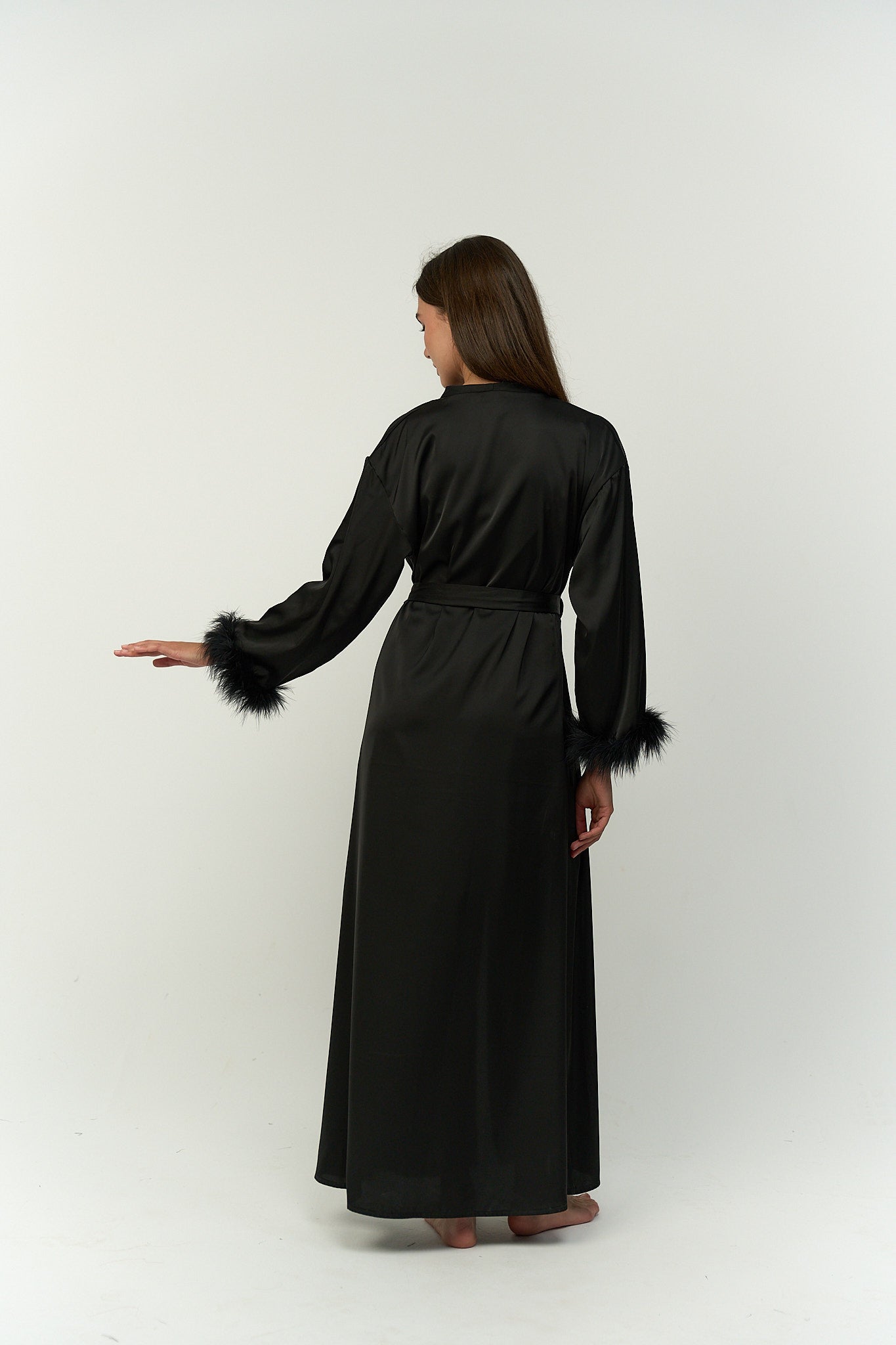رداء أسود طويل بأكمام واسعة، مصنوع من قماش الساتان، يُضفي لمسةً أنيقةً على مجموعة ملابسكِ المريحة. يتميز بقصّة فضفاضة ونقشة موحّدة، ينساب هذا الرداء بأناقة على الجسم. يُضفي خط العنق المفتوح والأكمام الطويلة الواسعة لمسةً من الانسيابية، بينما تُضفي أطراف الأكمام المزينة بالريش لمسةً من الفخامة والجاذبية. تصميمه الطويل يجعله مثاليًا للارتداء فوق ملابس النوم أو بمفرده لإطلالة أنيقة ومريحة.