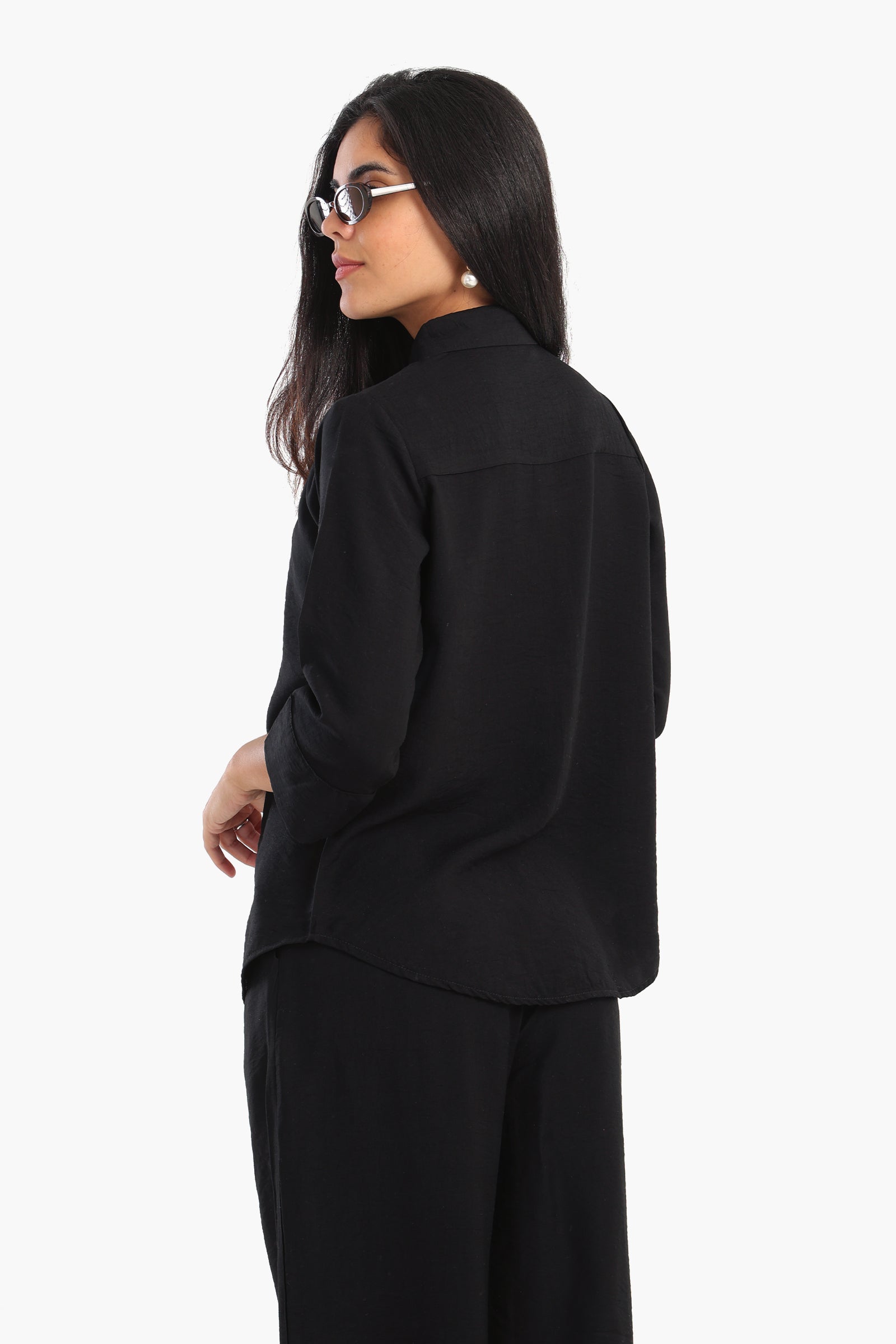 The collared neck and button-down closure with a full hidden placket give it a clean and sophisticated look. Long sleeves with buttoned cuffs provide a classic touch, while the round hemline adds a subtle flair. Easy to wear, this shirt is perfect for both casual and semi-formal settings.