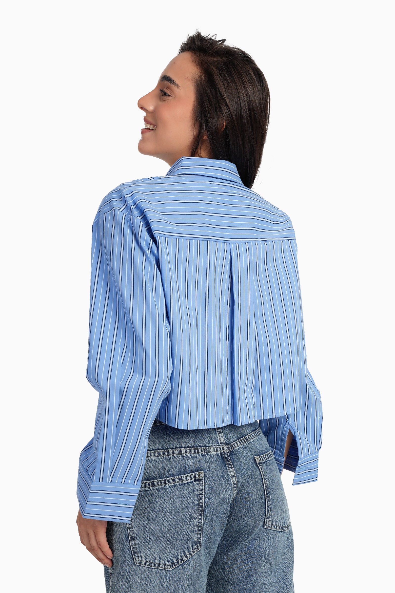 This blue striped poplin shirt offers a stylish twist on a classic wardrobe staple. Featuring a regular fit, it showcases a collared neck and button-down closure with a hidden placket for a sleek, polished look. The cropped, asymmetrical design adds a modern edge to this timeless piece, while the long sleeves make it perfect for any season. Effortlessly versatile, this shirt is easy to wear and ideal for both casual and dressed-up occasions.