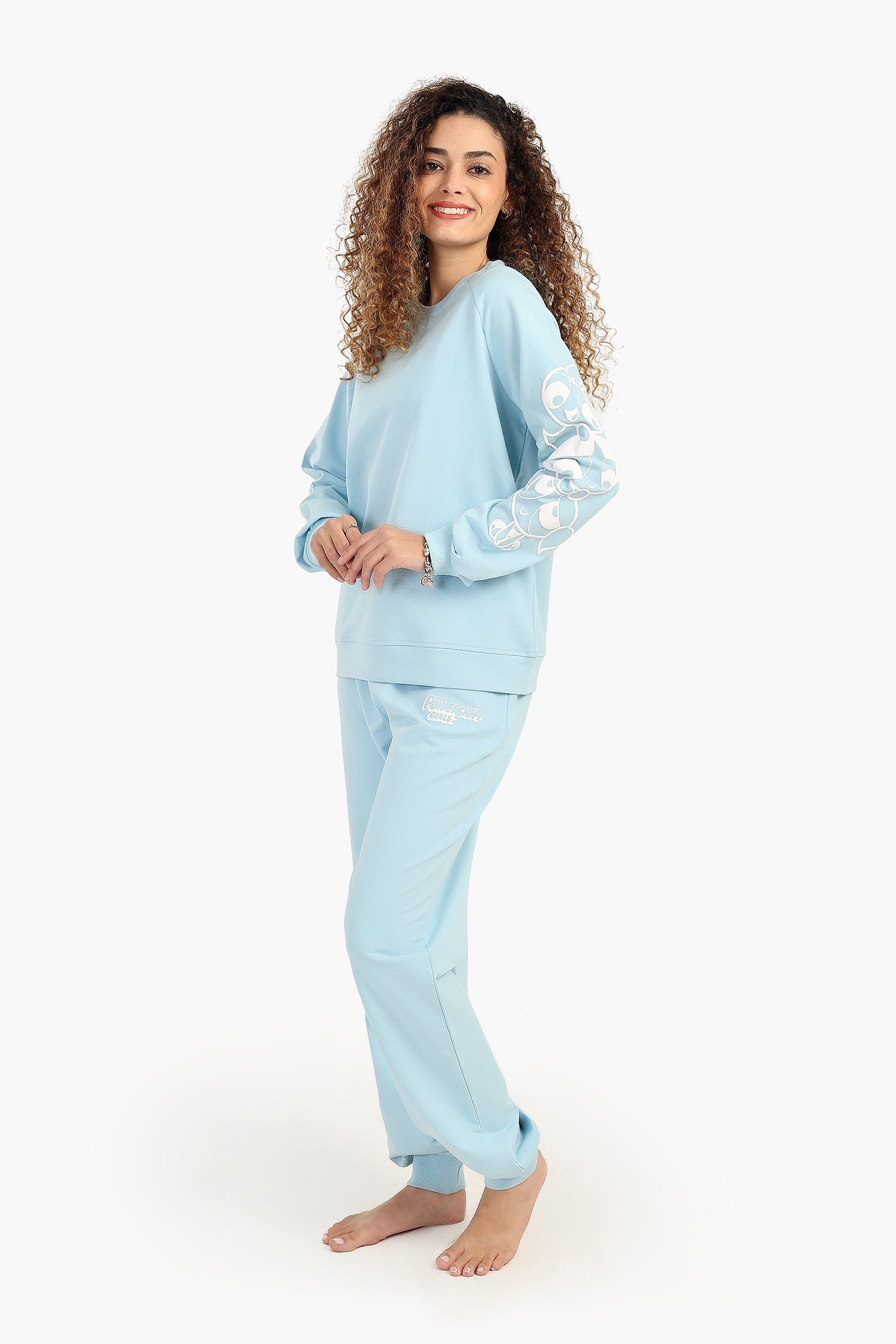 Indulge in comfort and style with this light blue pyjama top, crafted from soft French Terry fabric. The regular fit and solid pattern create a relaxed yet polished look, while the crew neckline and long sleeves ensure all-day coziness. Ribbed detailing on the neck and cuffs adds a touch of snugness, and the subtle print on one sleeve introduces a playful element. Designed with a slip-on style, this top is perfect for lounging or bedtime routines.