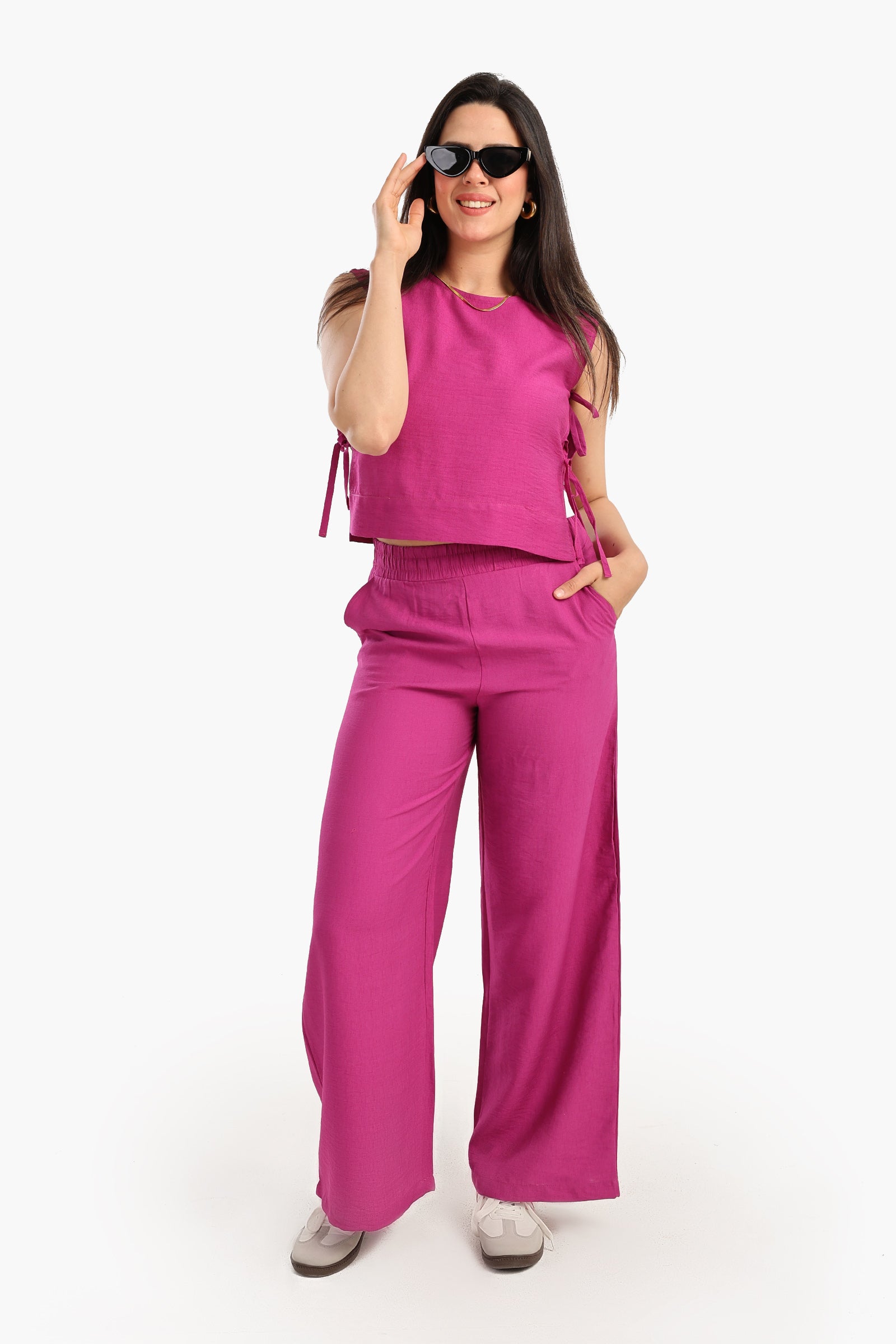 Stay stylish and comfortable with this sleek lounge set, designed for relaxed yet elevated loungewear. Made from lightweight polyester, it offers a regular fit with breathable ease. The sleeveless cropped top features tie sides, adding a touch of elegance, while the elastic high-waisted pants provide a flattering fit. With a straight cut, full-length design, and side pockets, this set blends style and functionality. Simply pull it on and lounge in effortless chic!