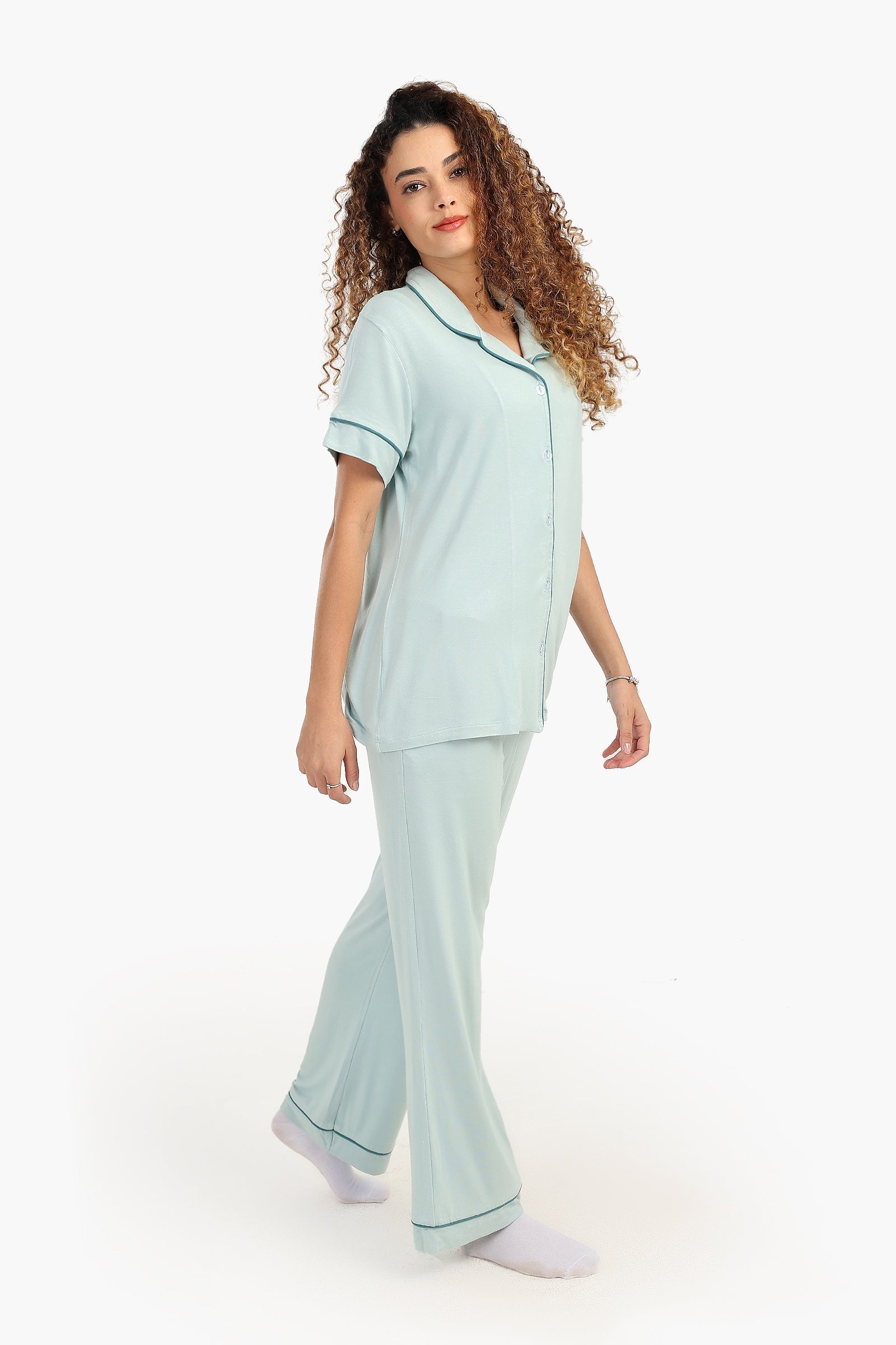 This Pyjama Set is crafted from soft and breathable Poplin fabric, offering comfort and a relaxed feel perfect for a good night's sleep or lounging at home. The regular fit ensures a comfortable, easy-to-wear silhouette. The solid pattern with color piping adds a touch of contrast and sophistication, while the notch collar and button-down closure with a full placket provide a classic and polished look. The short sleeves make it ideal for warmer nights, and the elastic waist pants with a straight cut offer a comfortable, flexible fit. Full-length pants provide coverage and warmth, making this set a versatile choice for all seasons. With its easy-to-wear design, this pyjama set is both practical and stylish.