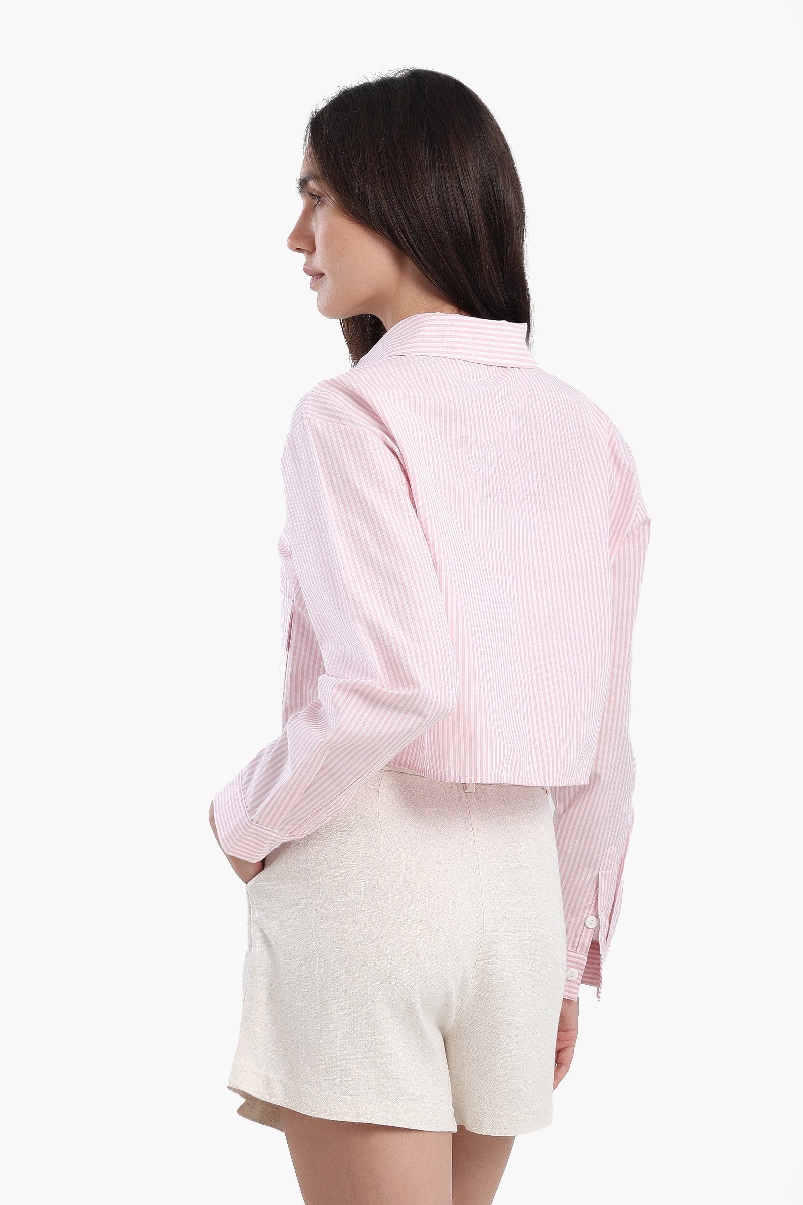 The hidden full placket gives the shirt a sleek and minimalistic aesthetic, and the front pocket adds a hint of functionality. Its unique asymmetrical and cropped design sets it apart, making it a trendy addition to your collection. Effortlessly stylish and easy to wear, this shirt is perfect for casual outings or elevated everyday looks.
