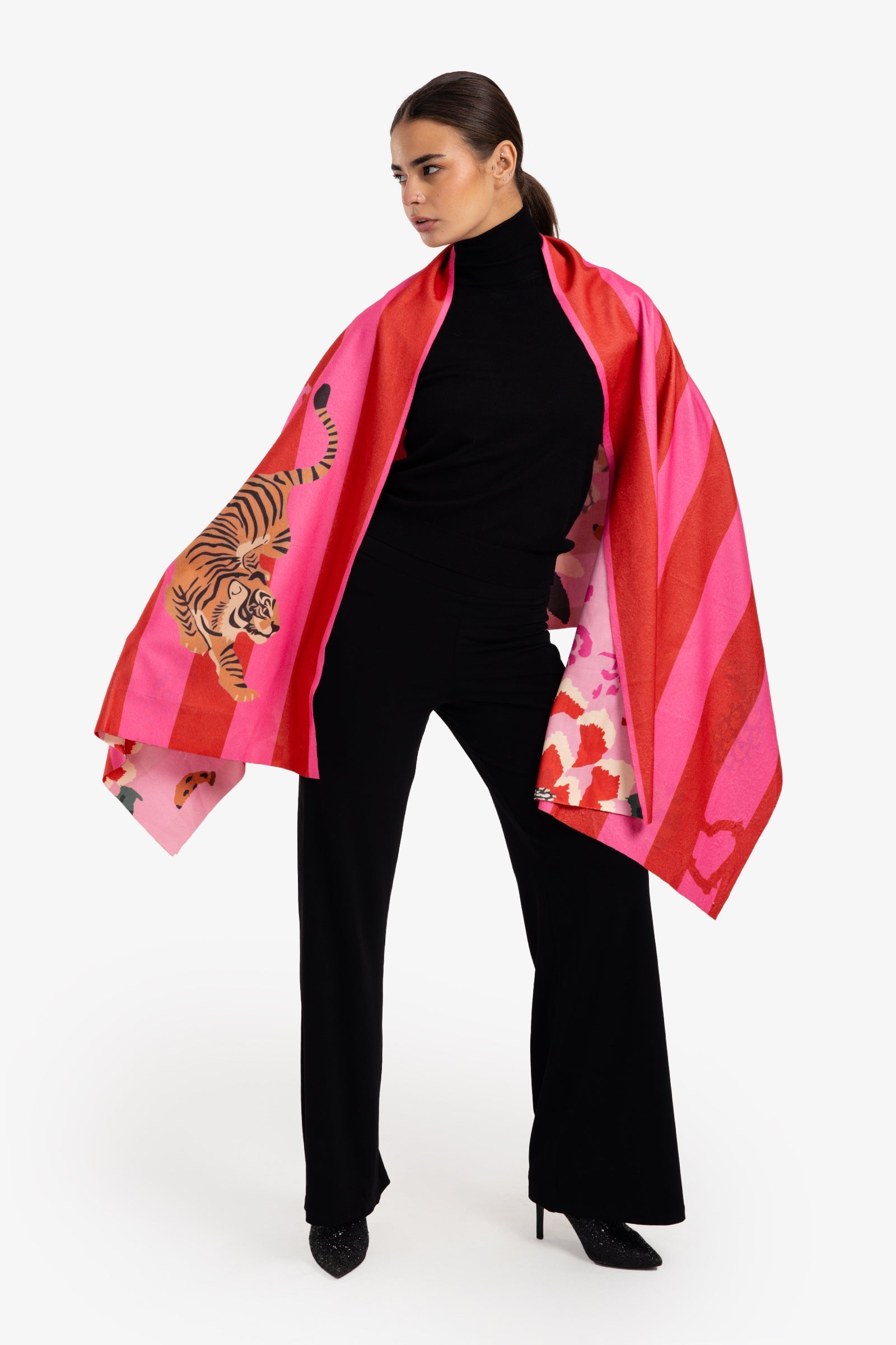 This one-size Tencel scarf features a double-face design with a printed pattern on a rectangular shape. Soft and lightweight, it’s perfect for adding a stylish accent to any outfit while providing gentle warmth.