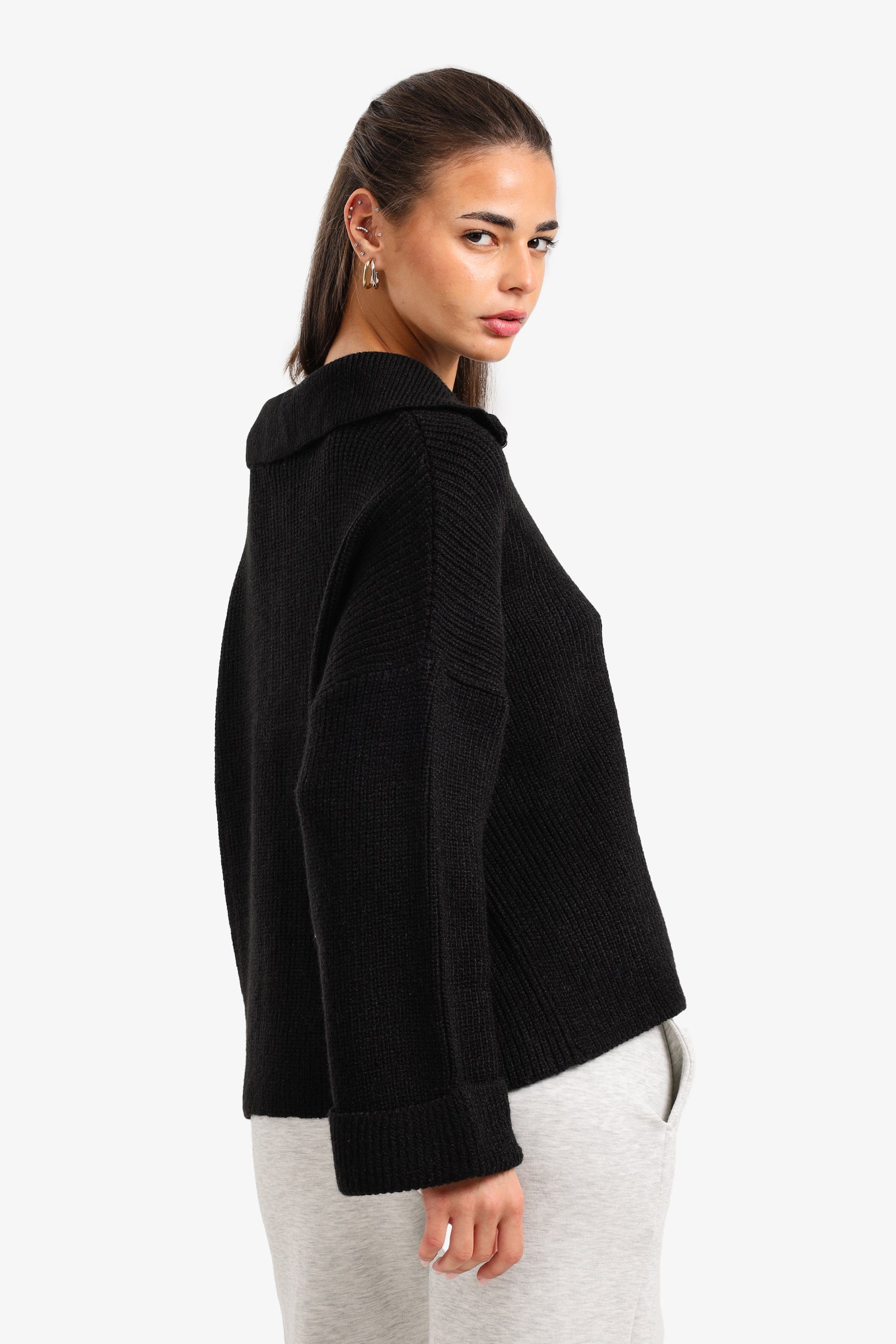 This knit pullover blends modern comfort with relaxed elegance. Designed with a cozy half-zip front and a wide collar, it offers versatile styling—zip it up for warmth or fold it down for a laid-back look. The soft knit texture, dropped shoulders, and slightly loose fit make it a perfect choice for effortless everyday wear.