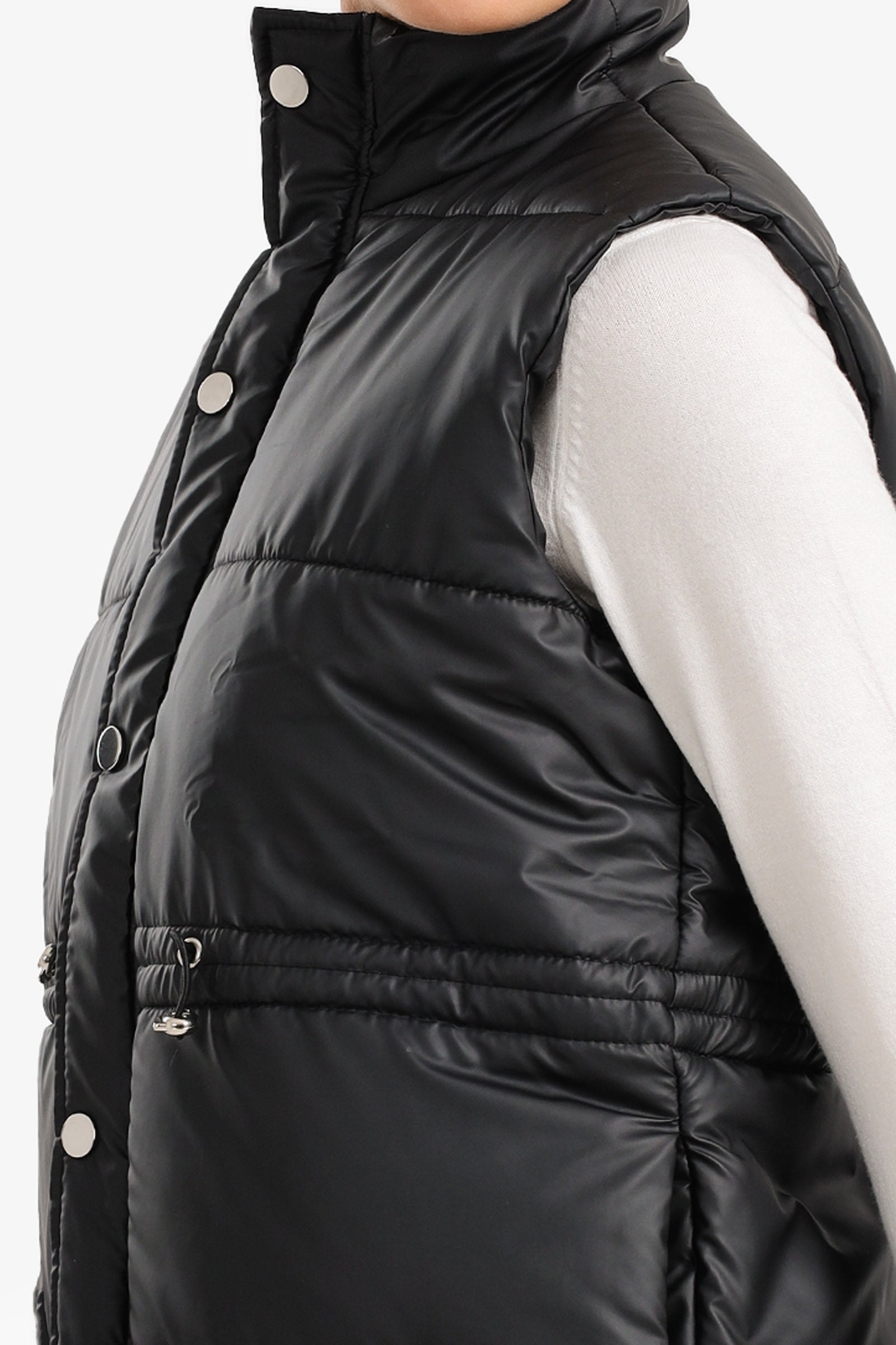 Stay warm and stylish with this sleek puffer vest, designed for both function and fashion. Featuring quilted horizontal panels and a high stand collar, it provides extra warmth and a modern look. The vest includes a full front closure with a hidden zipper and silver snap buttons, complemented by functional side pockets with decorative metal details. A subtle drawstring at the hem allows for an adjustable fit, making it a versatile outer layer for chilly days.