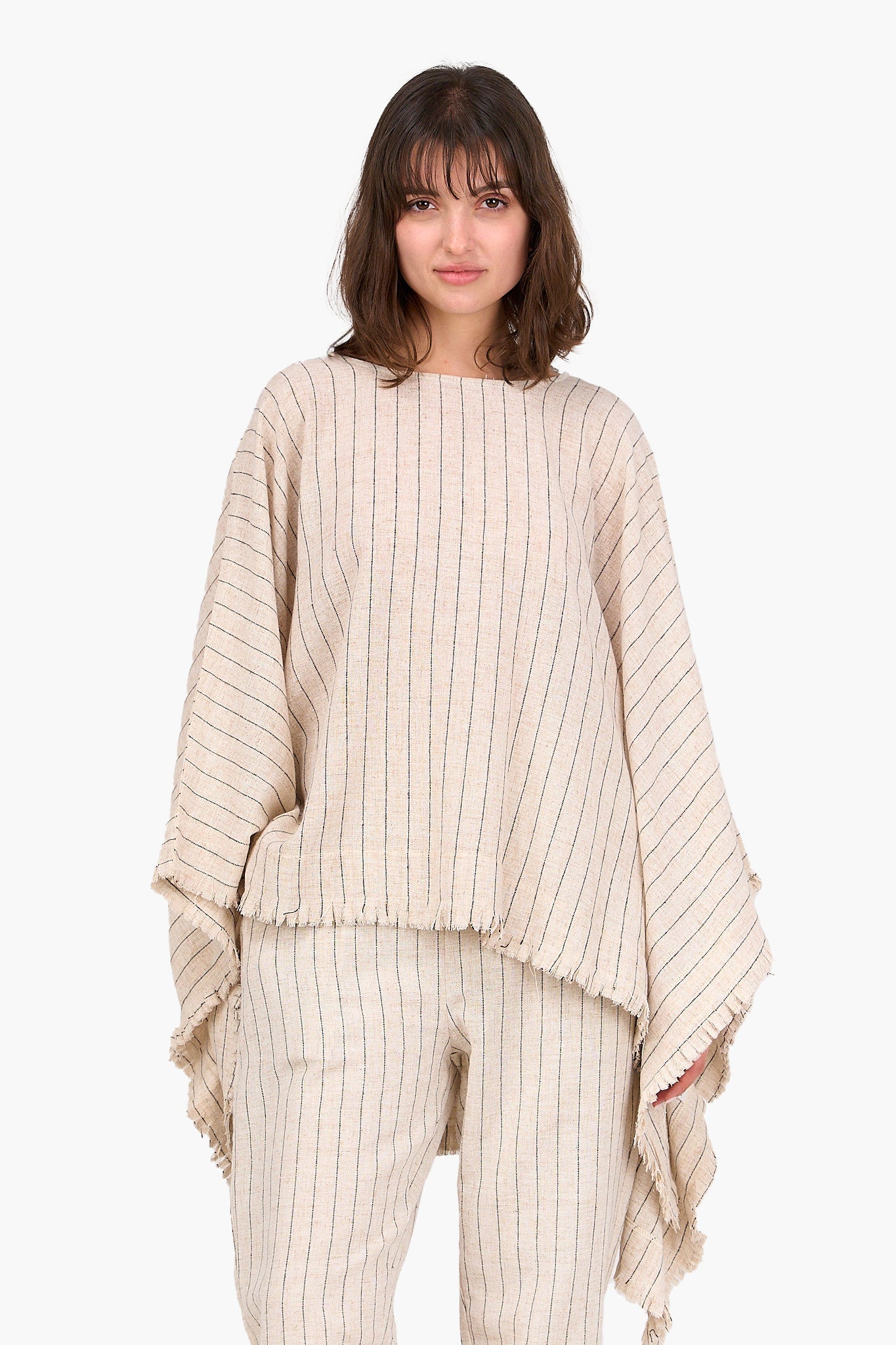 Elevate your wardrobe with this linen boxy poncho, designed for a loose fit that combines comfort with contemporary style. Crafted from breathable linen, it features a striped pattern that adds subtle texture and depth. The crew neckline provides a classic touch, while the back button closure adds a refined detail. With batwing long sleeves and an asymmetrical design, this poncho drapes beautifully, creating a relaxed yet polished look. The unfinished hem enhances its effortless charm, and its easy slip-on style makes it a perfect layering piece for any season. For a cohesive and stylish ensemble, pair it with the matching linen pants, designed to complement the poncho’s relaxed aesthetic.