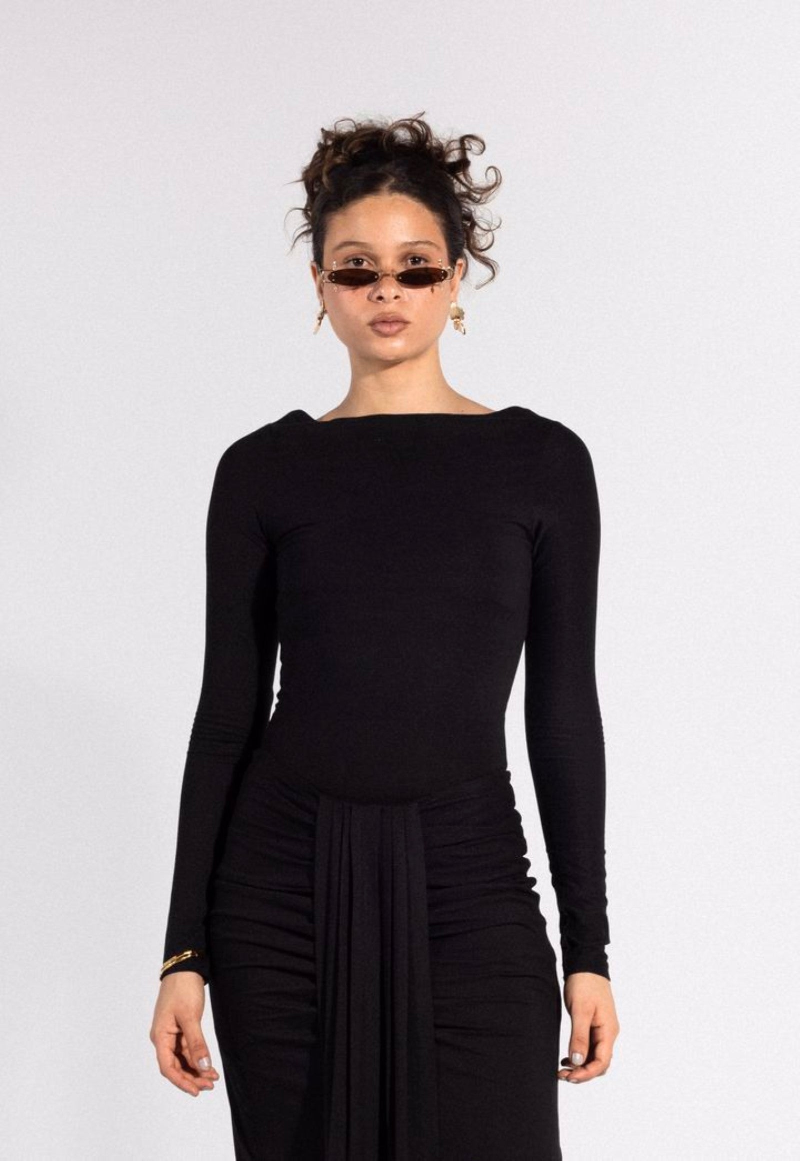 The solid pattern offers a timeless look that can be easily paired with various outfits. Featuring a boat neck, this bodysuit adds a touch of elegance and sophistication, while the long sleeves provide additional coverage and style.