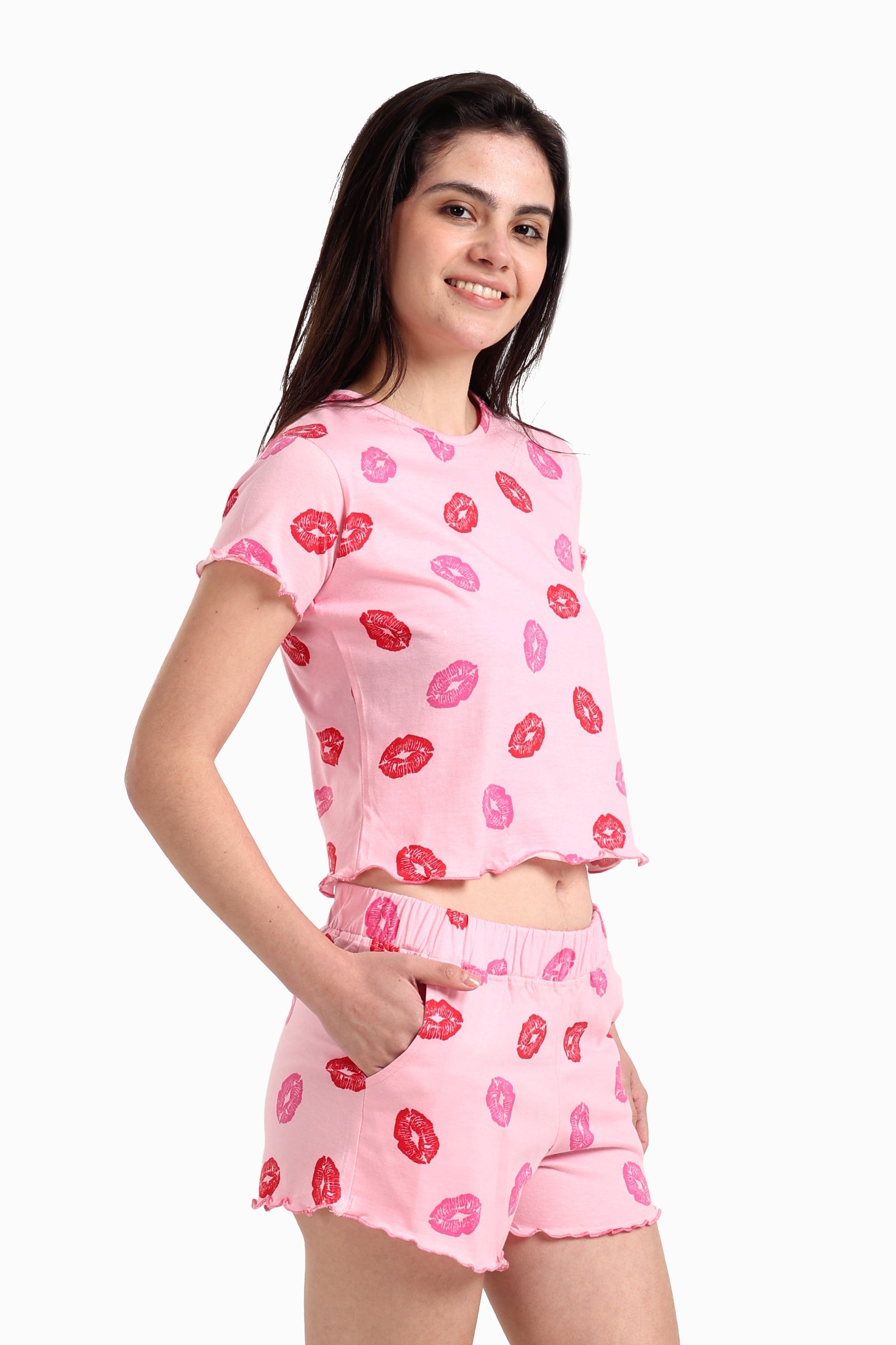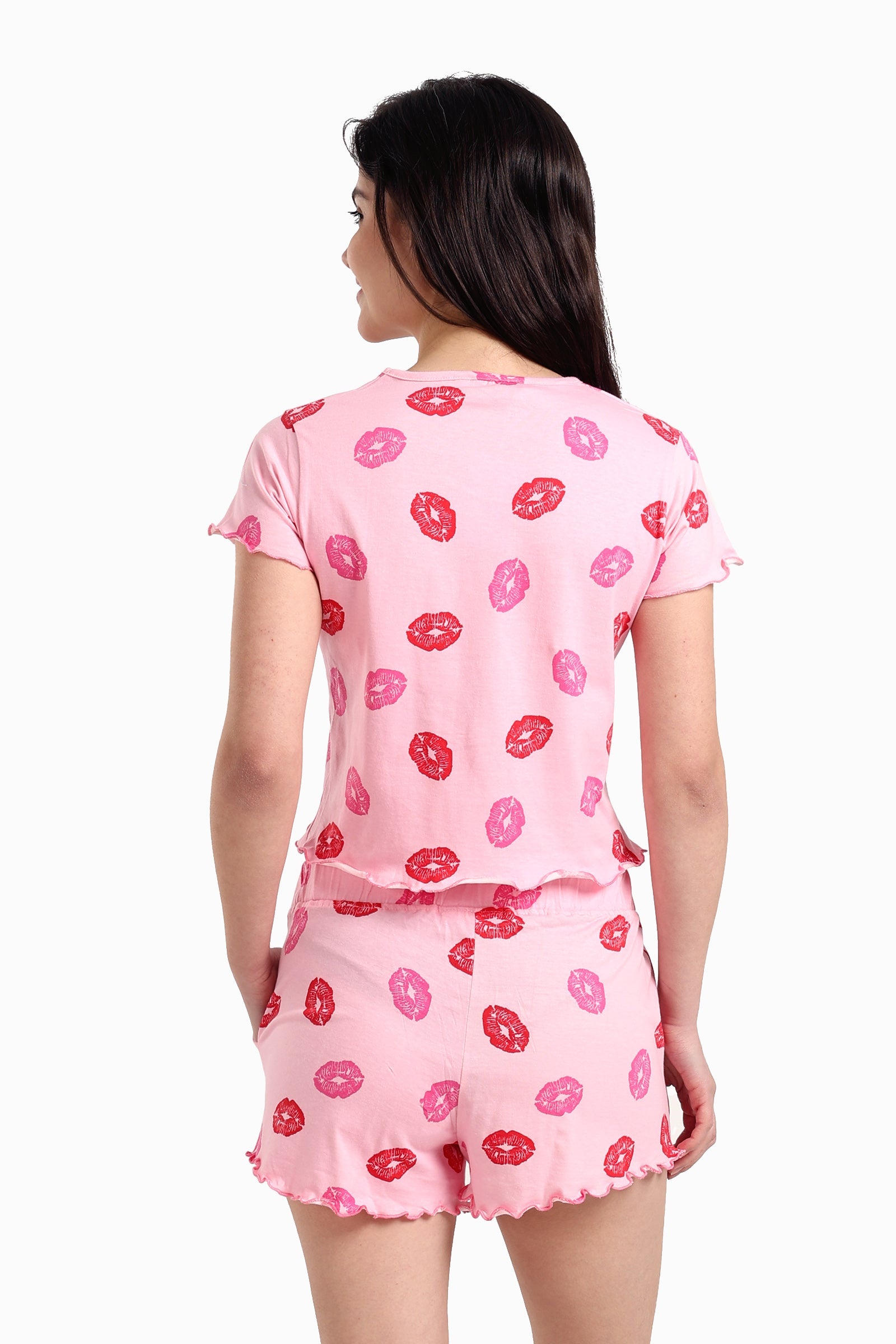 The round-neck top with short sleeves provides ease of movement, making it ideal for lounging or sleeping. The elastic waist shorts, featuring frilled edges, enhance the overall feminine appeal while ensuring a comfortable fit. Its easy-to-wear slip-on design makes it a must-have for effortless bedtime styling.
