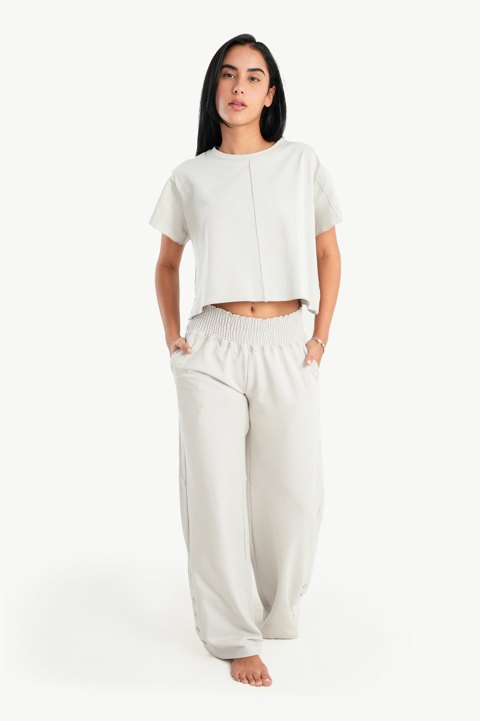 Featuring a straight cut, these pants maintain a classic silhouette. The addition of two side pockets provides practical storage for your essentials. Snap buttons on the sides add a touch of style and functionality, allowing you to adjust the fit as needed. With their pull-on design, these pyjama pants are easy to wear and perfect for relaxing at home.