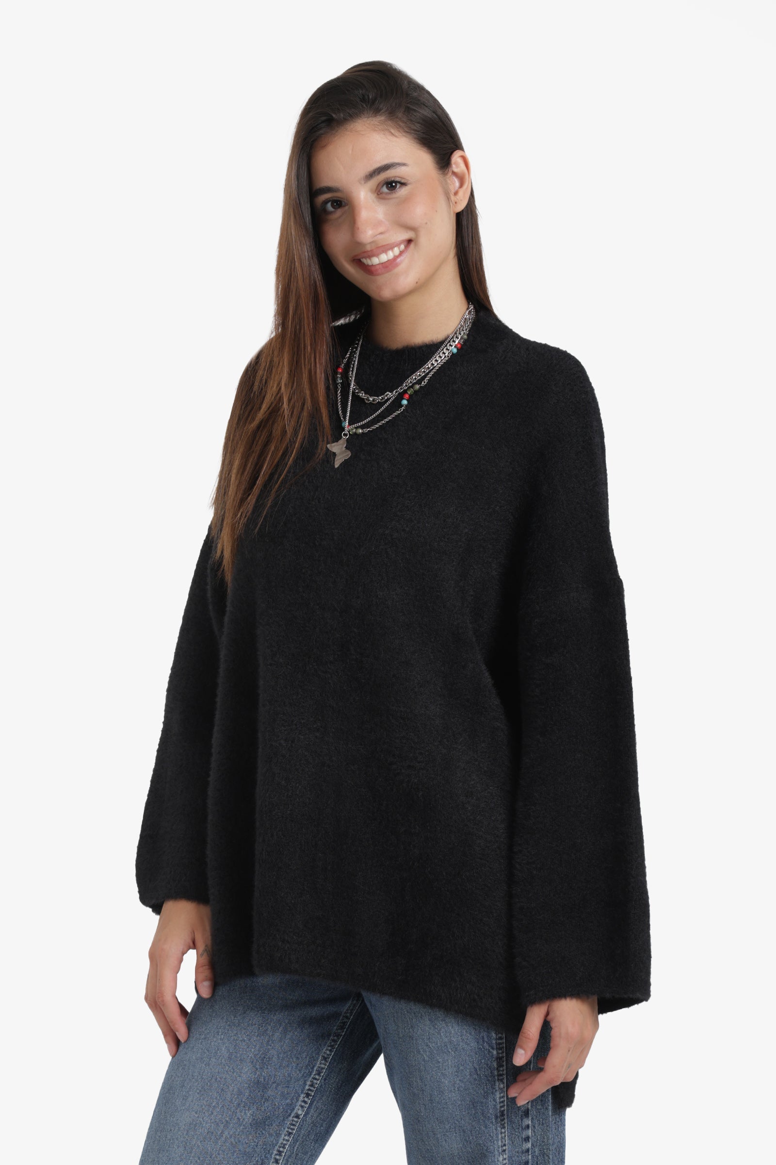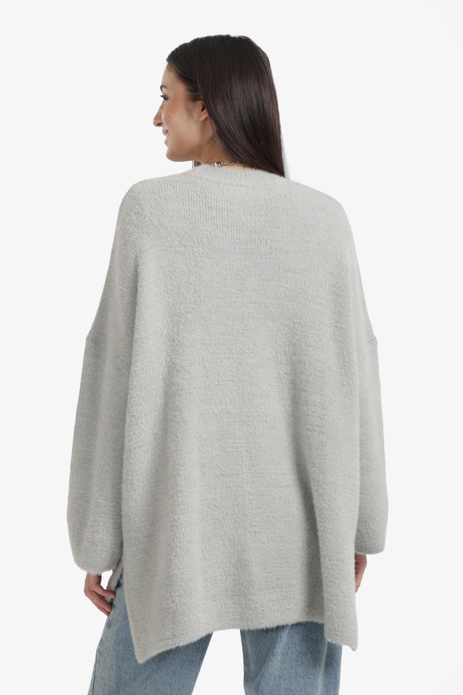 This high-low wool pullover is a cozy yet stylish wardrobe essential. Designed in a relaxed fit with a classic round neckline, it features wide long sleeves and a side slit for ease of movement. The high-low hem adds a modern, flattering silhouette, while the solid wool fabric keeps you warm and effortlessly chic.