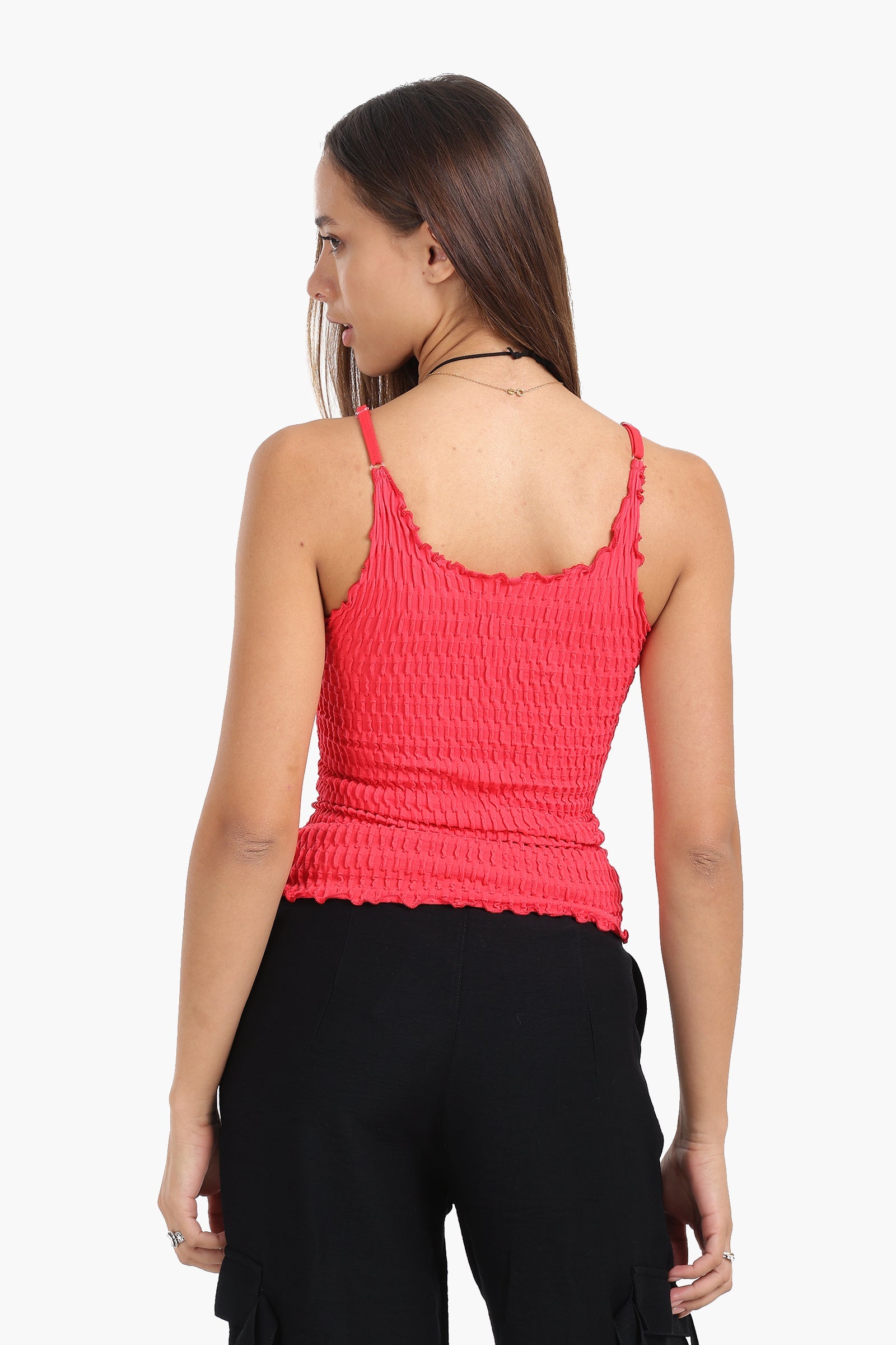 This seamless microfiber top is your go-to for comfort and texture. Featuring a slim fit and stretchy, crinkled design, it hugs the body while allowing full freedom of movement. With thin spaghetti straps and a lettuce-edge hemline, this top brings playful detail to a classic silhouette, making it perfect for layering or wearing solo.