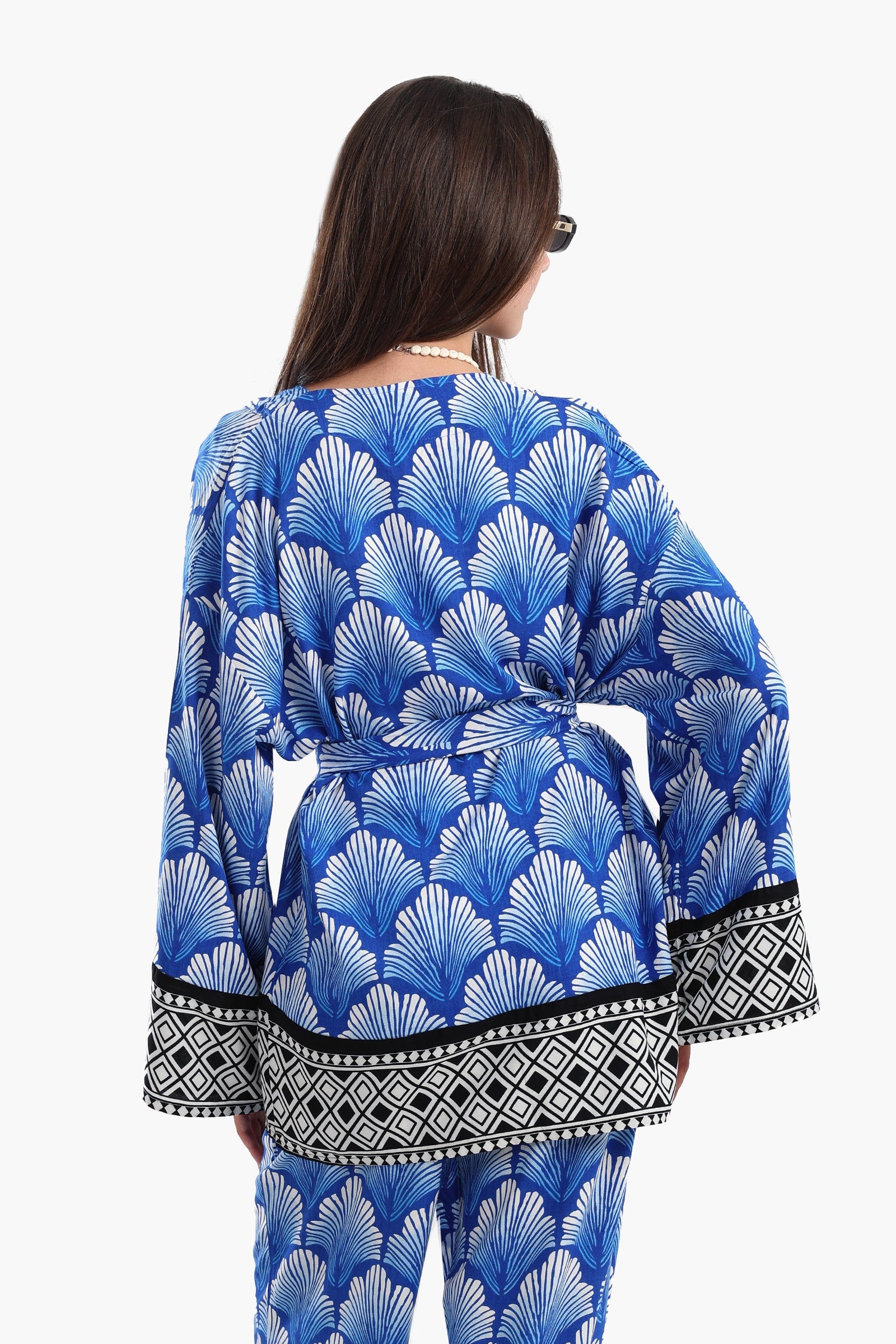 This kimono features a relaxed fit with a beautifully printed shells pattern, perfect for adding a touch of coastal charm to your wardrobe. The contrast-colored cuffs provide a subtle pop of color, complementing the overall design. With an open neckline and long wide sleeves, it offers a breezy, effortless style. The detachable waist belt allows you to adjust the fit, adding versatility to the piece. At hip length, this kimono strikes the right balance between comfort and style, making it easy to wear and perfect for layering over casual outfits or swimwear.