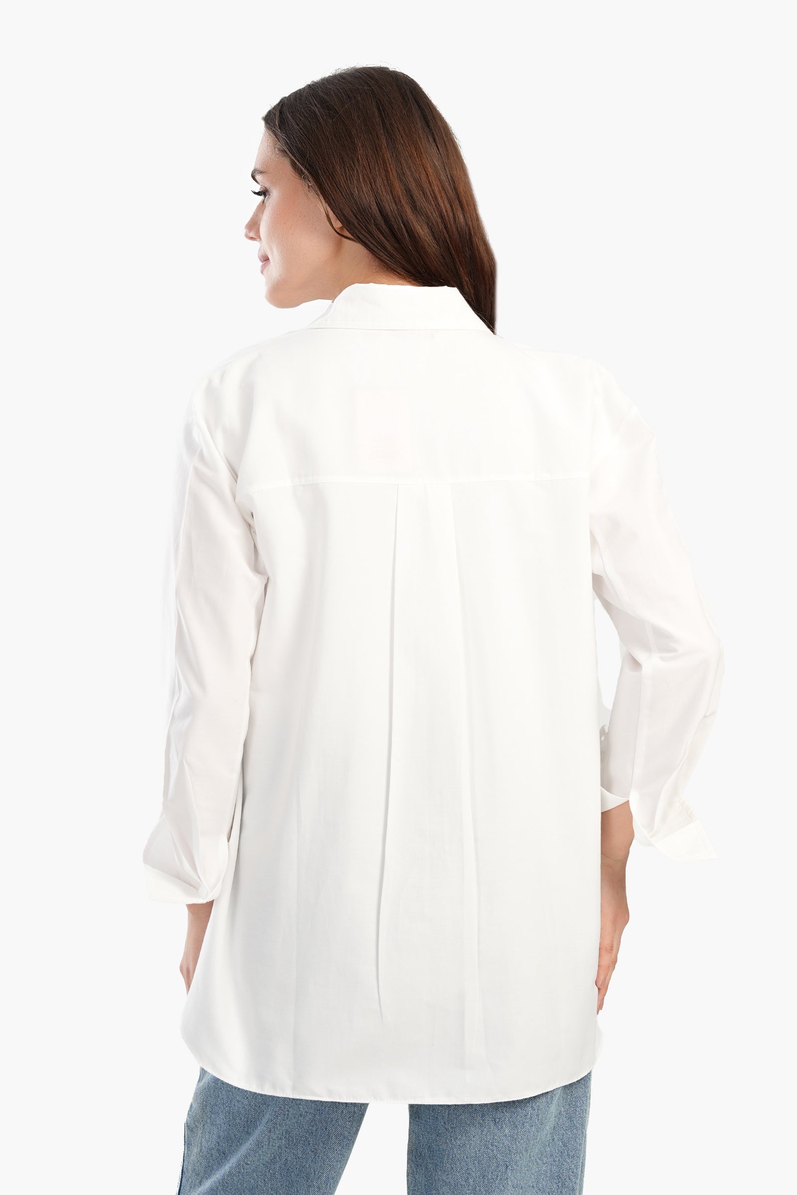This shirt combines a classic look with modern design elements for a stylish, comfortable fit. Featuring a solid pattern, it is designed with a collared neck and a button-down closure for a polished appearance. The long sleeves provide versatility, while the printed chest pocket adds a unique, playful touch. The round hem and asymmetrical design offer a contemporary silhouette, making it easy to wear for various occasions, whether you're dressing up or going for a more casual look.