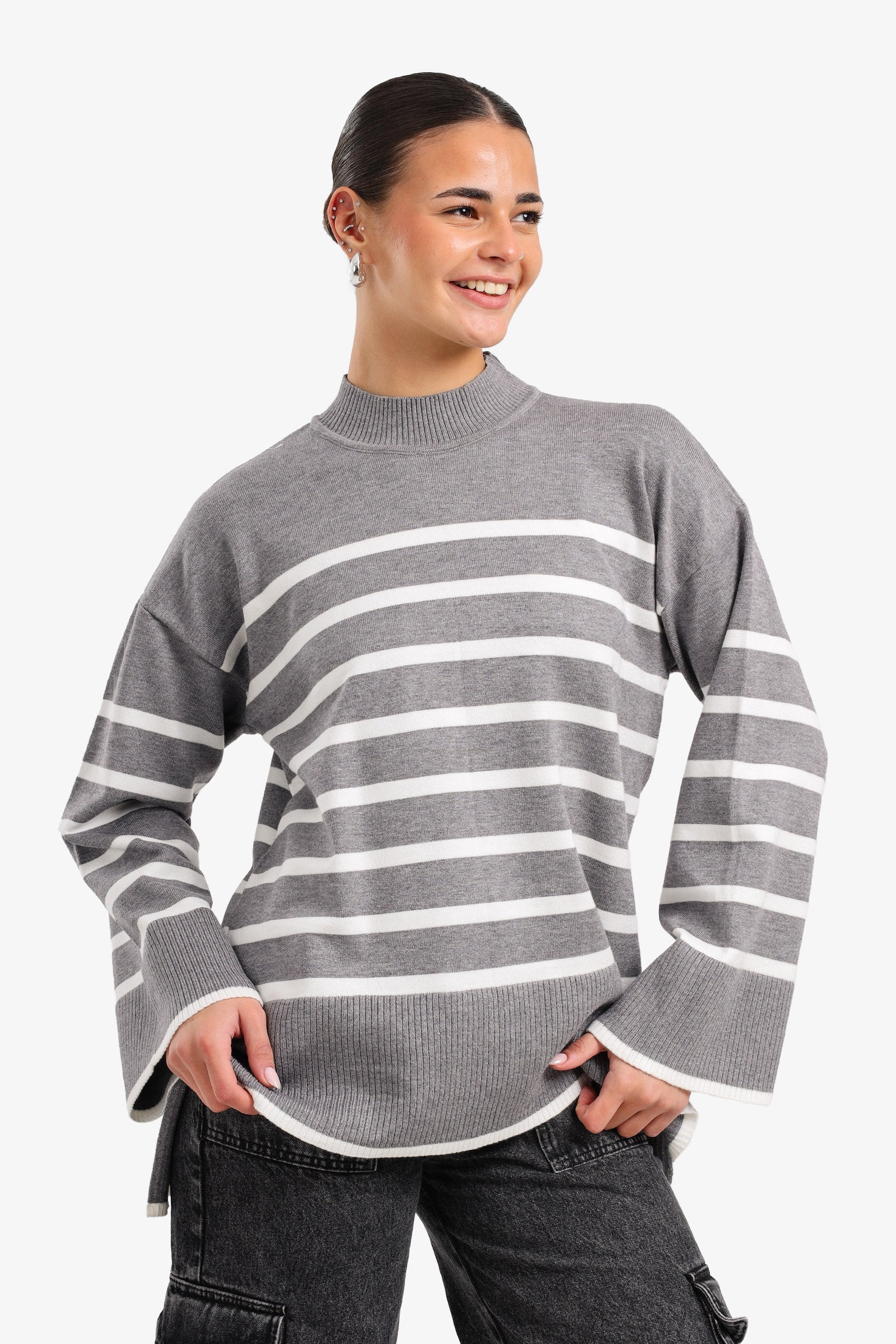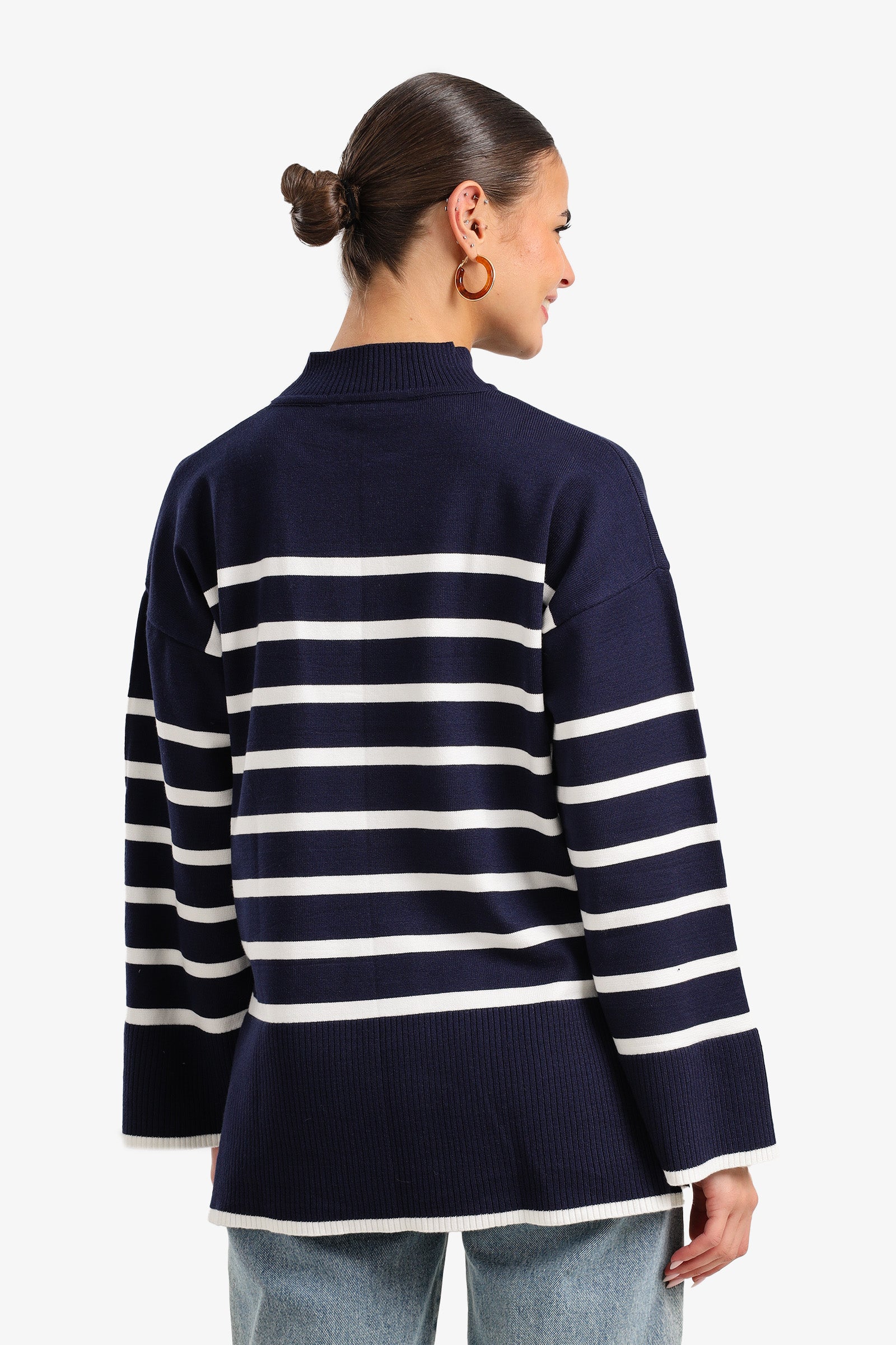 This striped knit pullover offers a perfect balance of comfort and style. Featuring bold horizontal stripes, it’s designed with a mock neck and a relaxed silhouette for a cozy yet modern look. The soft knit fabric, ribbed edges, and side slits add both comfort and sophistication, making it a versatile choice for everyday wear.