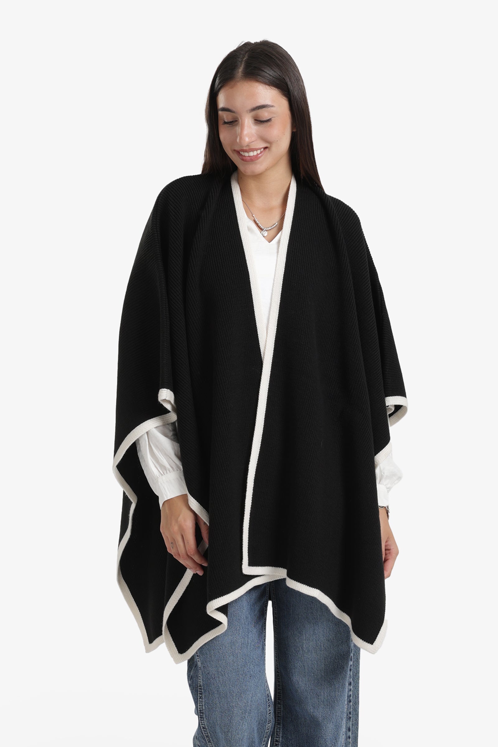 This wool poncho is a versatile layering piece that blends simplicity with a subtle pop of color. Designed in a relaxed fit with a plain pattern, it’s elevated by its colored trim for a modern finishing touch. Easy to slip on, it adds both comfort and effortless style to any outfit.